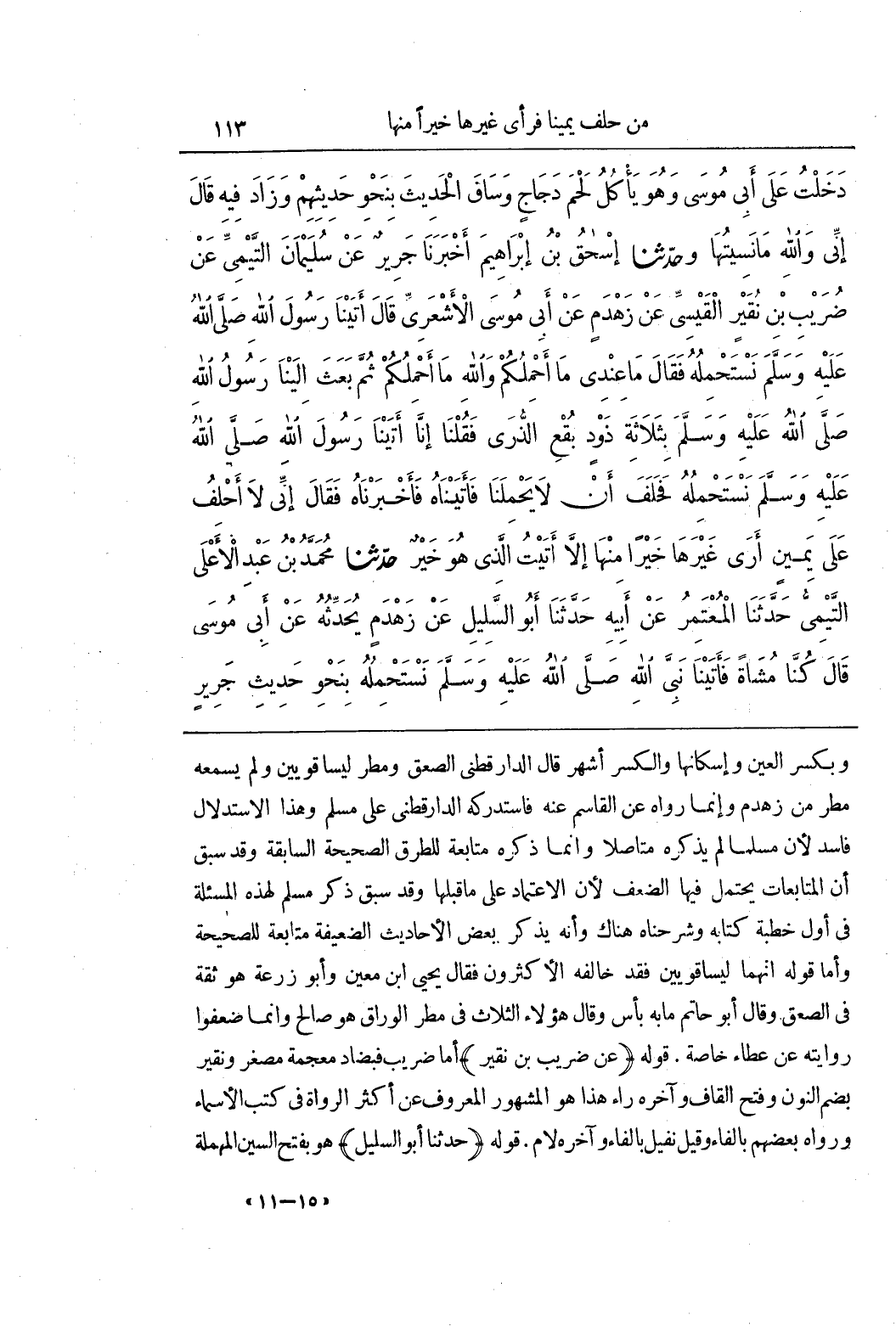 وَبِكَسْرِ الْعَيْنِ وَإِسْكَانِهَا وَالْكَسْرُ أَشْهَرُ قَالَ الدَّارَقُطْنِيُّ الصعق ومطر ليساقويين وَلَمْ يَسْمَعْهُ مَطَرٌ مِنْ زَهْدَمٍ وَإِنَّمَا رَوَاهُ عَنِ الْقَاسِمِ عَنْهُ فَاسْتَدْرَكَهُ الدَّارَقُطْنِيُّ عَلَى مُسْلِمٍ وَهَذَا الِاسْتِدْلَالُ فَاسِدٌ لِأَنَّ مُسْلِمًا لَمْ يَذْكُرْهُ متاصلا وَإِنَّمَا ذَكَرَهُ مُتَابَعَةً لِلطُّرُقِ الصَّحِيحَةِ السَّابِقَةِ وَقَدْ سَبَقَ أَنَّ الْمُتَابَعَاتِ يُحْتَمَلُ فِيهَا الضَّعْفُ لِأَنَّ الِاعْتِمَادَ عَلَى مَا قَبْلَهَا وَقَدْ سَبَقَ ذِكْرُ مُسْلِمٍ لِهَذِهِ الْمَسْأَلَةِ فِي أَوَّلِ خُطْبَةِ كِتَابِهِ وَشَرَحْنَاهُ هُنَاكَ وَأَنَّهُ يَذْكُرُ بَعْضَ الْأَحَادِيثِ الضَّعِيفَةِ متابعة للصحيحة وأما قوله إنهما ليساقويين فقد خالفه الأكثرون فقال يحي بْنُ مَعِينٍ وَأَبُو زُرْعَةَ هُوَ ثِقَةٌ فِي الصعق وقال أبو حاتم مابه بَأْسٌ وَقَالَ هَؤُلَاءِ الثَّلَاثُ فِي مَطَرٍ الْوَرَّاقِ هُوَ صَالِحٌ وَإِنَّمَا ضَعَّفُوا رِوَايَتَهُ عَنْ عَطَاءٍ خَاصَّةً قَوْلُهُ (عَنْ ضُرَيْبِ بْنِ نُقَيْرٍ) أَمَّا ضريب فبضاد معجمة مصغر ونقير بِضَمِّ النُّونِ وَفَتْحِ الْقَافِ وَآخِرُهُ رَاءٌ هَذَا هوالمشهور الْمَعْرُوفُ عَنْ أَكْثَرِ الرُّوَاةِ فِي كُتُبِ الْأَسْمَاءِ وَرَوَاهُ بَعْضُهُمْ بِالْفَاءِ وَقِيلَ نُفَيْلٌ بِالْفَاءِ وَآخِرُهُ لَامٌ قَوْلُهُ (حَدَّثَنَا أَبُو السَّلِيلِ) هُوَ بِفَتْحِ السين المهملة