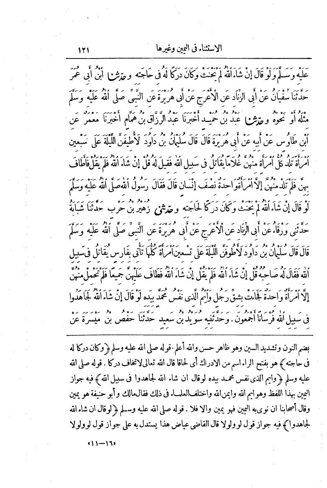 بِضَمِّ النُّونِ وَتَشْدِيدِ السِّينِ وَهُوَ ظَاهِرٌ حَسَنٌ وَاللَّهُ أَعْلَمُ قَوْلُهُ صَلَّى اللَّهُ عَلَيْهِ وَسَلَّمَ (وَكَانَ دَرَكًا لَهُ فِي حَاجَتِهِ) هُوَ بِفَتْحِ الإدراك إسم من الإدارك أَيْ لِحَاقًا قَالَ اللَّهُ تَعَالَى لَا تَخَافُ دركا قَوْلُهُ صَلَّى اللَّهُ عَلَيْهِ وَسَلَّمَ (وَايْمِ الَّذِي نَفْسُ مُحَمَّدٍ بِيَدِهِ لَوْ قَالَ إِنْ شَاءَ اللَّهُ لَجَاهَدُوا فِي سَبِيلِ اللَّهِ) فِيهِ جَوَازُ الْيَمِينِ بِهَذَا اللَّفْظِ وَهُوَ ايْمُ اللَّهِ وَايْمَنُ اللَّهِ وَاخْتَلَفَ الْعُلَمَاءُ فِي ذَلِكَ فَقَالَ مَالِكٌ وَأَبُو حَنِيفَةَ هُوَ يَمِينٌ وَقَالَ أَصْحَابُنَا إِنْ نَوَى بِهِ الْيَمِينَ فَهُوَ يَمِينٌ وَإِلَّا فَلَا قَوْلُهُ صَلَّى اللَّهُ عَلَيْهِ وَسَلَّمَ (لَوْ قَالَ إِنْ شَاءَ اللَّهُ لَجَاهَدُوا) فِيهِ جَوَازُ قَوْلِ لَوْ وَلَوْلَا قَالَ الْقَاضِي عِيَاضٌ هَذَا يُسْتَدَلُّ بِهِ عَلَى جَوَازِ قَوْلِ لَوْ وَلَوْلَا