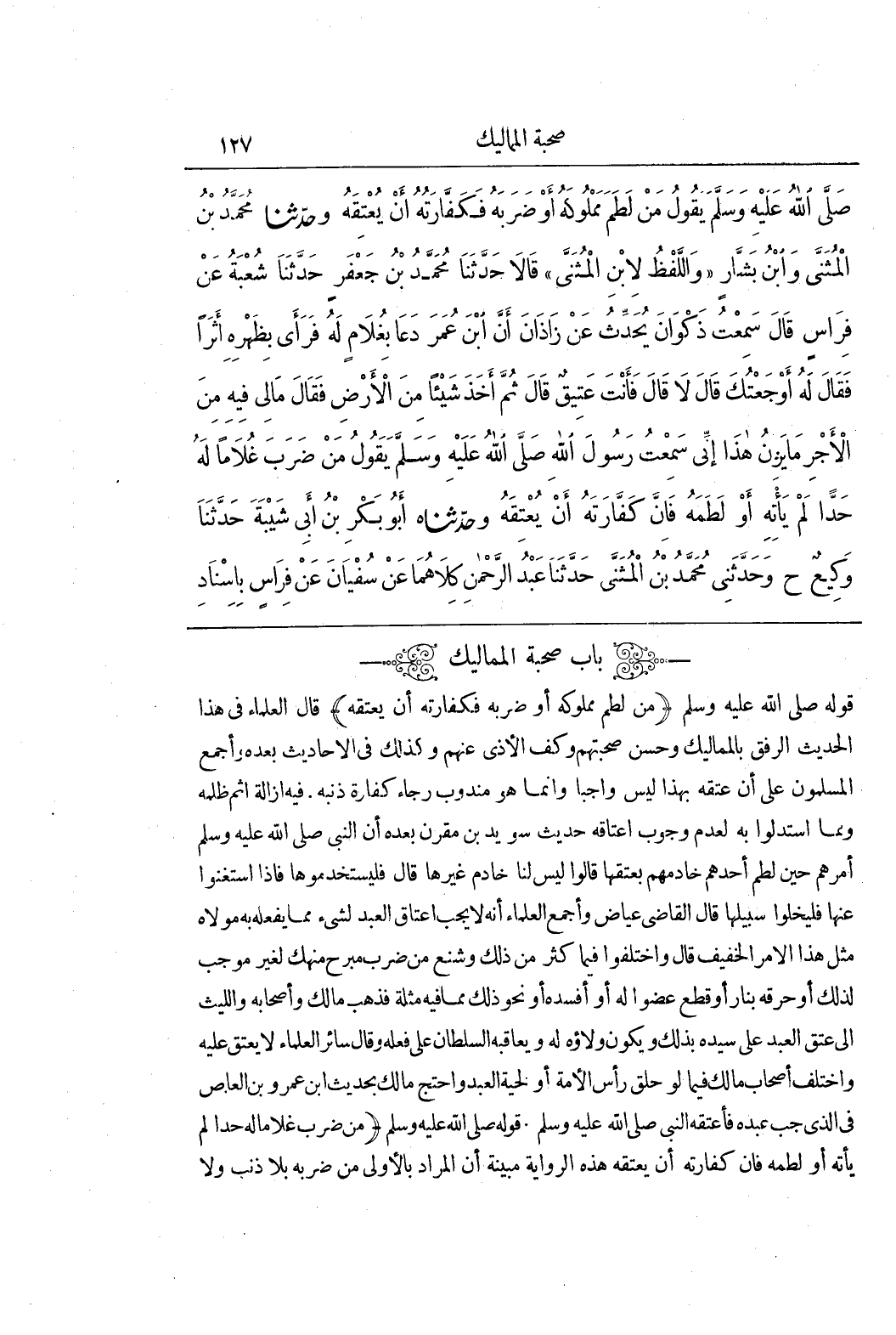 [1657] قَوْلُهُ صَلَّى اللَّهُ عَلَيْهِ وَسَلَّمَ (مَنْ لَطَمَ مَمْلُوكَهُ أَوْ ضَرَبَهُ فَكَفَّارَتُهُ أَنْ يُعْتِقَهُ) قَالَ الْعُلَمَاءُ فِي هَذَا الْحَدِيثِ الرِّفْقُ بِالْمَمَالِيكِ وَحُسْنُ صُحْبَتِهِمْ وَكَفُّ الْأَذَى عَنْهُمْ وَكَذَلِكَ فِي الْأَحَادِيثِ بَعْدَهُ وَأَجْمَعَ الْمُسْلِمُونَ عَلَى أَنَّ عِتْقَهُ بِهَذَا لَيْسَ وَاجِبًا وَإِنَّمَا هُوَ مَنْدُوبٌ رَجَاءَ كَفَّارَةِ ذَنْبِهِ فِيهِ إِزَالَةُ إِثْمِ ظُلْمِهِ وَمِمَّا اسْتَدَلُّوا بِهِ لِعَدَمِ وُجُوبِ إِعْتَاقِهِ حَدِيثُ سُوَيْدِ بْنِ مُقَرِّنٍ بَعْدَهُ أَنَّ النَّبِيَّ صَلَّى اللَّهُ عَلَيْهِ وَسَلَّمَ أَمَرَهُمْ حِينَ لَطَمَ أَحَدُهُمْ خَادِمَهُمْ بِعِتْقِهَا قَالُوا لَيْسَ لَنَا خَادِمٌ غَيْرُهَا قَالَ فَلْيَسْتَخْدِمُوهَا فَإِذَا اسْتَغْنَوْا عَنْهَا فَلْيُخَلُّوا سَبِيلَهَا قَالَ الْقَاضِي عِيَاضٌ وَأَجْمَعَ الْعُلَمَاءُ أَنَّهُ لَا يَجِبُ إِعْتَاقُ الْعَبْدِ لِشَيْءٍ مِمَّا يَفْعَلُهُ بِهِ مَوْلَاهُ مِثْلَ هَذَا الْأَمْرِ الْخَفِيفِ قَالَ وَاخْتَلَفُوا فِيمَا كَثُرَ مِنْ ذَلِكَ وَشَنُعَ مِنْ ضَرْبٍ مُبَرِّحٍ مُنْهِكٍ لِغَيْرِ مُوجِبٍ لِذَلِكَ أَوْ حَرَقَهُ بِنَارٍ أَوْ قَطَعَ عُضْوًا لَهُ أَوْ أَفْسَدَهُ أَوْ نَحْوَ ذَلِكَ مِمَّا فِيهِ مُثْلَةٌ فَذَهَبَ مَالِكٌ وَأَصْحَابُهُ وَاللَّيْثُ إِلَى عِتْقِ الْعَبْدِ عَلَى سَيِّدِهِ بِذَلِكَ وَيَكُونُ وَلَاؤُهُ لَهُ وَيُعَاقِبُهُ السُّلْطَانُ عَلَى فِعْلِهِ وَقَالَ سَائِرُ الْعُلَمَاءِ لَا يُعْتَقُ عَلَيْهِ وَاخْتَلَفَ أَصْحَابُ مَالِكٍ فِيمَا لَوْ حَلَقَ رَأْسَ الْأَمَةِ أو لحية العبد واحتج مالك بحديث بن عَمْرِو بْنِ الْعَاصِ فِي الَّذِي جَبَّ عَبْدَهُ فَأَعْتَقَهُ النَّبِيُّ صَلَّى اللَّهُ عَلَيْهِ وَسَلَّمَ قَوْلُهُ صَلَّى اللَّهُ عَلَيْهِ وَسَلَّمَ (مَنْ ضَرَبَ غُلَامًا لَهُ حَدًّا لَمْ يَأْتِهِ أَوْ لَطَمَهُ فَإِنَّ كَفَّارَتَهُ أَنْ يُعْتِقَهُ هَذِهِ الرِّوَايَةُ مُبَيِّنَةٌ أَنَّ الْمُرَادَ بِالْأُولَى مَنْ ضَرَبَهُ بِلَا ذَنْبٍ وَلَا)