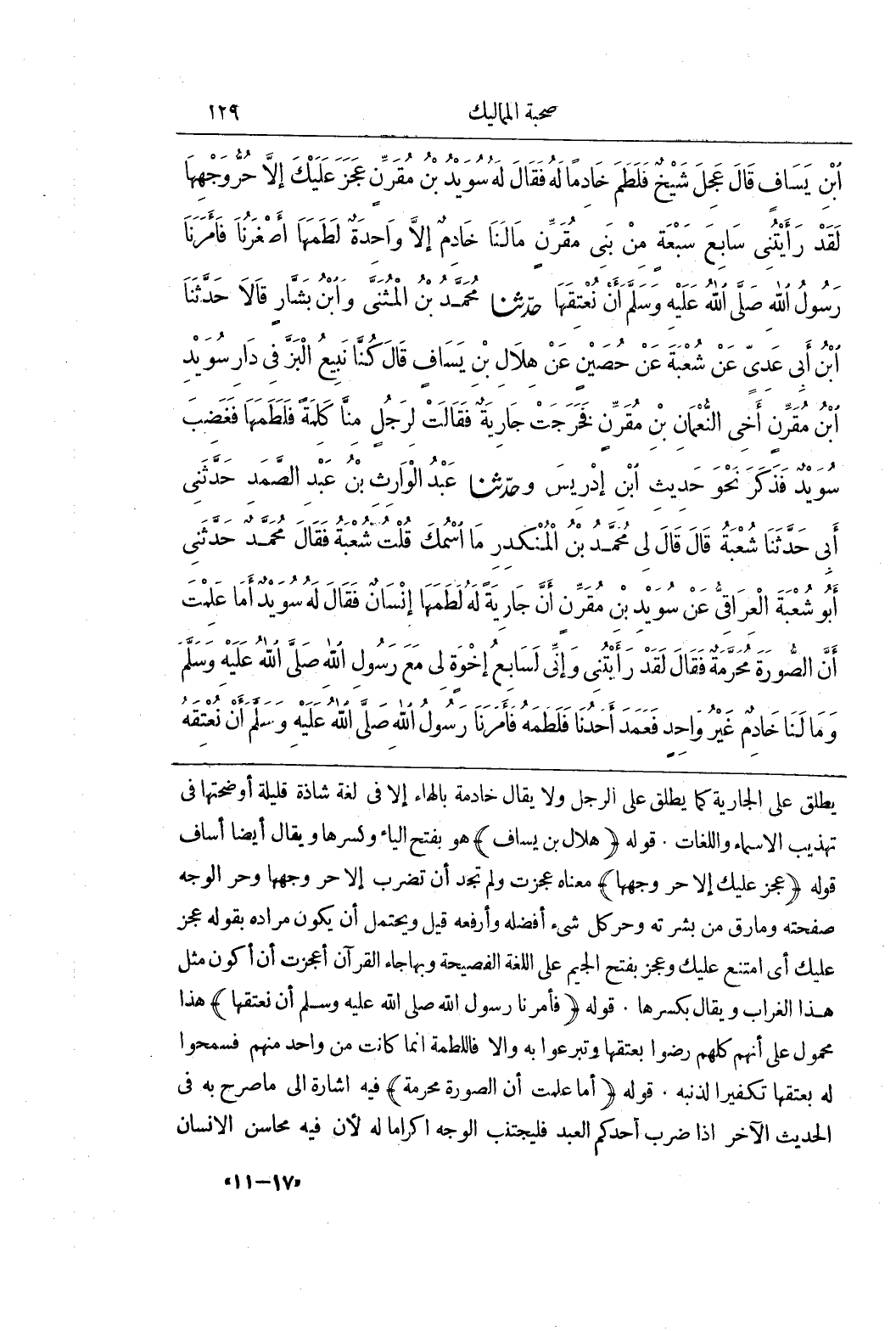 يُطْلَقُ عَلَى الْجَارِيَةِ كَمَا يُطْلَقُ عَلَى الرَّجُلِ وَلَا يُقَالُ خَادِمَةٌ بِالْهَاءِ إِلَّا فِي لُغَةٍ شَاذَّةٍ قَلِيلَةٍ أَوْضَحْتُهَا فِي تَهْذِيبِ الْأَسْمَاءِ وَاللُّغَاتِ قَوْلُهُ (هِلَالُ بْنُ يَسَافٍ) هُوَ بِفَتْحِ الْيَاءِ وَكَسْرِهَا وَيُقَالُ أَيْضًا أَسَافٌ قَوْلُهُ (عَجَزَ عَلَيْكَ إِلَّا حُرُّ وَجْهِهَا) مَعْنَاهُ عَجَزْتَ وَلَمْ تَجِدْ أَنْ تَضْرِبَ إِلَّا حُرَّ وَجْهِهَا وَحُرُّ الْوَجْهِ صفحته ومارق مِنْ بَشَرَتِهِ وَحُرُّ كُلِّ شَيْءٍ أَفْضَلُهُ وَأَرْفَعُهُ قِيلَ وَيَحْتَمِلُ أَنْ يَكُونَ مُرَادُهُ بِقَوْلِهِ عَجَزَ عَلَيْكَ أَيِ امْتَنَعَ عَلَيْكَ وَعَجَزَ بِفَتْحِ الْجِيمِ عَلَى اللُّغَةِ الْفَصِيحَةِ وَبِهَا جَاءَ الْقُرْآنُ أَعْجَزْتُ أن أكون مثل هذا الغراب وَيُقَالُ بِكَسْرِهَا قَوْلُهُ (فَأَمَرَنَا رَسُولُ اللَّهِ صَلَّى اللَّهُ عَلَيْهِ وَسَلَّمَ أَنْ نُعْتِقَهَا) هَذَا مَحْمُولٌ عَلَى أَنَّهُمْ كُلَّهُمْ رَضُوا بِعِتْقِهَا وَتَبَرَّعُوا بِهِ وَإِلَّا فَاللَّطْمَةُ إِنَّمَا كَانَتْ مِنْ وَاحِدٍ مِنْهُمْ فَسَمَحُوا لَهُ بِعِتْقِهَا تَكْفِيرًا لِذَنْبِهِ قَوْلُهُ (أَمَا عَلِمْتَ أَنَّ الصُّورَةَ مُحَرَّمَةٌ) فِيهِ إِشَارَةٌ إِلَى مَا صَرَّحَ بِهِ فِي الْحَدِيثِ الْآخَرِ إِذَا ضَرَبَ أَحَدُكُمُ الْعَبْدَ فَلْيَجْتَنِبِ الْوَجْهَ إِكْرَامًا لَهُ لِأَنَّ فِيهِ مَحَاسِنَ الْإِنْسَانِ
