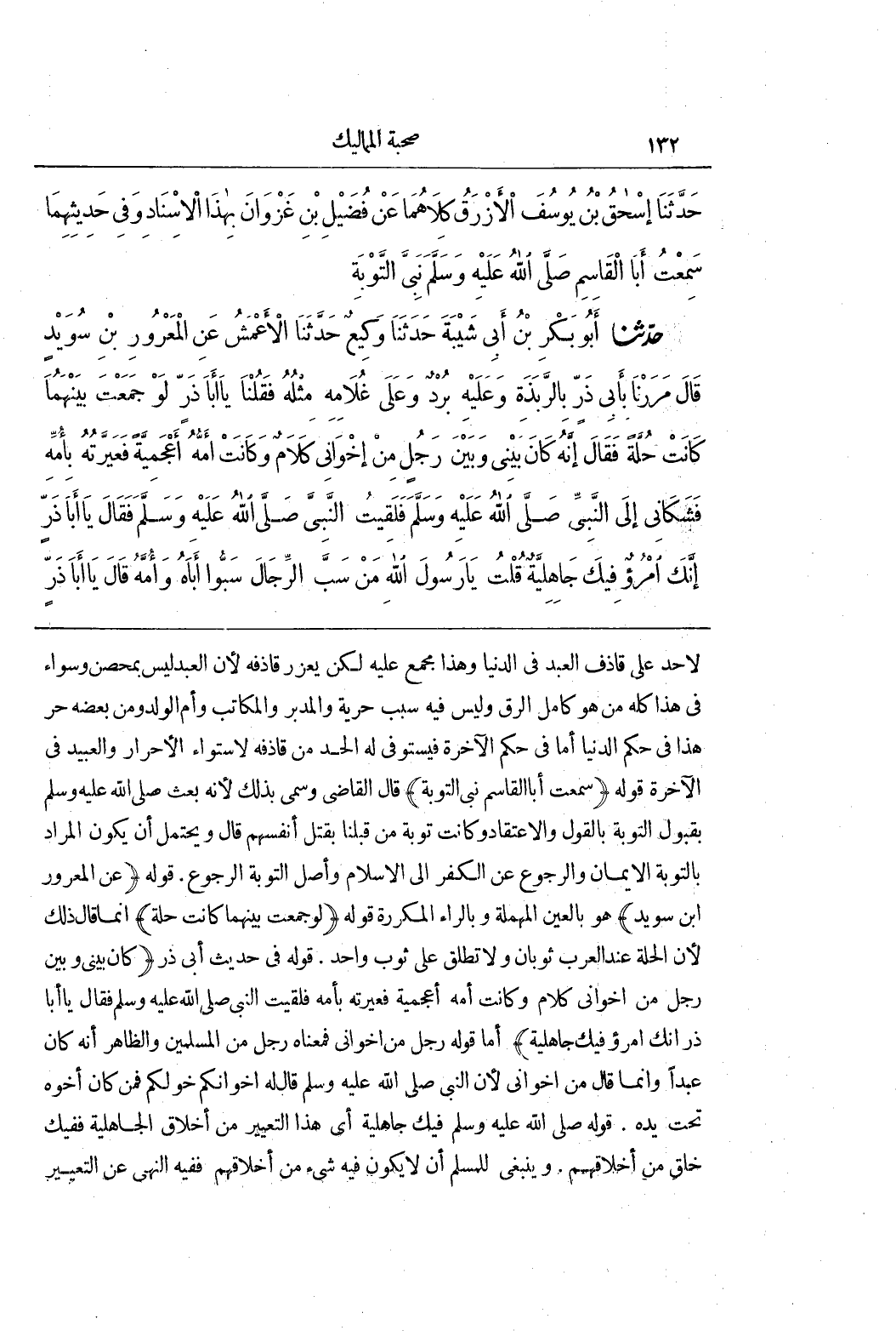 [1661] بْنِ سُوَيْدٍ هُوَ بِالْعَيْنِ الْمُهْمَلَةِ وَبِالرَّاءِ الْمُكَرَّرَةِ قَوْلُهُ لَوْ جَمَعْتَ بَيْنَهُمَا كَانَتْ حُلَّةً إِنَّمَا قَالَ ذَلِكَ لِأَنَّ الْحُلَّةَ عِنْدَ الْعَرَبِ ثَوْبَانِ وَلَا تُطْلَقُ عَلَى ثَوْبٍ وَاحِدٍ قَوْلُهُ فِي حَدِيثِ أَبِي ذَرٍّ (كَانَ بَيْنِي وَبَيْنَ رَجُلٍ مِنْ إِخْوَانِي كَلَامٌ وَكَانَتْ أُمُّهُ أَعْجَمِيَّةً فَعَيَّرْتُهُ بِأُمِّهِ فَلَقِيتُ النَّبِيَّ صَلَّى اللَّهُ عَلَيْهِ وَسَلَّمَ فَقَالَ يَا أَبَا ذَرٍّ إِنَّكَ امْرُؤٌ فِيكَ جَاهِلِيَّةٌ) أَمَّا قَوْلُهُ رَجُلٌ مِنْ إِخْوَانِي فَمَعْنَاهُ رَجُلٌ مِنَ الْمُسْلِمِينَ وَالظَّاهِرُ أَنَّهُ كَانَ عَبْدًا وَإِنَّمَا قَالَ مِنْ إِخْوَانِي لِأَنَّ النَّبِيَّ صَلَّى اللَّهُ عَلَيْهِ وَسَلَّمَ قَالَ لَهُ إِخْوَانُكُمْ خَوَلُكُمْ فَمَنْ كَانَ أَخُوهُ تَحْتَ يَدِهِ قَوْلُهُ صَلَّى اللَّهُ عَلَيْهِ وَسَلَّمَ فِيكَ جَاهِلِيَّةٌ أَيْ هَذَا التَّعْيِيرُ مِنْ أَخْلَاقِ الْجَاهِلِيَّةِ فَفِيكَ خُلُقٌ مِنْ أَخْلَاقِهِمْ وَيَنْبَغِي لِلْمُسْلِمِ أَنْ لَا يَكُونَ فِيهِ شَيْءٌ مِنْ أَخْلَاقِهِمْ فَفِيهِ النَّهْيُ عَنِ التَّعْيِيرِ
