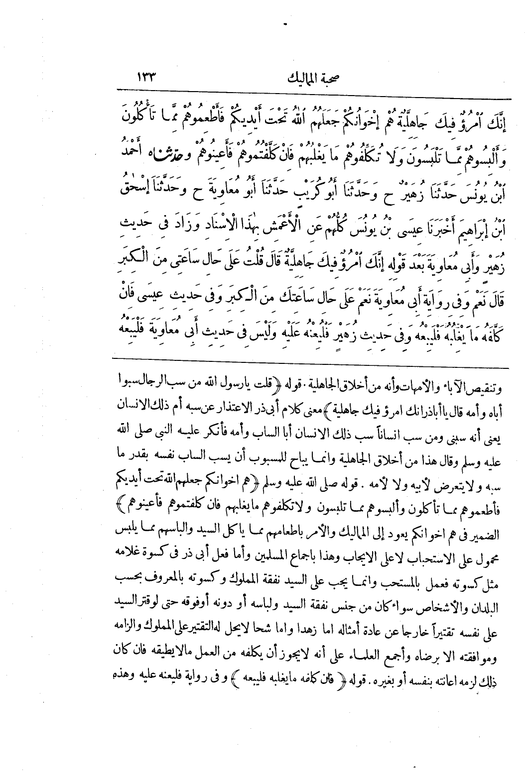 وَتَنْقِيصِ الْآبَاءِ وَالْأُمَّهَاتِ وَأَنَّهُ مِنْ أَخْلَاقِ الْجَاهِلِيَّةِ قَوْلُهُ (قُلْتُ يَا رَسُولَ اللَّهِ مَنْ سَبَّ الرِّجَالَ سَبُّوا أَبَاهُ وَأُمَّهُ قَالَ يَا أَبَا ذَرٍّ إِنَّكَ امْرُؤٌ فِيكَ جَاهِلِيَّةٌ) مَعْنَى كَلَامِ أَبِي ذَرٍّ الِاعْتِذَارُ عَنْ سَبِّهِ أُمَّ ذَلِكَ الْإِنْسَانِ يَعْنِي أَنَّهُ سَبَّنِي وَمَنْ سَبَّ إِنْسَانًا سَبَّ ذَلِكَ الْإِنْسَانُ أَبَا السَّابِّ وَأُمَّهُ فَأَنْكَرَ عَلَيْهِ النَّبِيُّ صَلَّى اللَّهُ عَلَيْهِ وَسَلَّمَ وَقَالَ هَذَا مِنْ أَخْلَاقِ الْجَاهِلِيَّةِ وَإِنَّمَا يُبَاحُ لِلْمَسْبُوبِ أَنْ يَسُبَّ السَّابَّ نَفْسَهُ بِقَدْرِ مَا سَبَّهُ وَلَا يَتَعَرَّضُ لِأَبِيهِ وَلَا لِأُمِّهِ قَوْلُهُ صَلَّى اللَّهُ عَلَيْهِ وَسَلَّمَ (هُمْ إِخْوَانُكُمْ جَعَلَهُمُ اللَّهُ تَحْتَ أَيْدِيكُمْ فَأَطْعِمُوهُمْ مِمَّا تَأْكُلُونَ وَأَلْبِسُوهُمْ مِمَّا تَلْبَسُونَ وَلَا تُكَلِّفُوهُمْ مَا يَغْلِبُهُمْ فَإِنْ كَلَّفْتُمُوهُمْ فَأَعِينُوهُمْ) الضَّمِيرُ فِي هُمْ إِخْوَانُكُمْ يَعُودُ إِلَى الْمَمَالِيكِ وَالْأَمْرُ بِإِطْعَامِهِمْ مِمَّا يَأْكُلُ السَّيِّدُ وَإِلْبَاسُهُمْ مِمَّا يَلْبَسُ مَحْمُولٌ عَلَى الِاسْتِحْبَابِ لَا عَلَى الْإِيجَابِ وَهَذَا بِإِجْمَاعِ الْمُسْلِمِينَ وَأَمَّا فِعْلُ أَبِي ذَرٍّ فِي كِسْوَةِ غُلَامِهِ مِثْلَ كِسْوَتِهِ فَعَمَلٌ بِالْمُسْتَحَبِّ وَإِنَّمَا يَجِبُ عَلَى السَّيِّدِ نَفَقَةُ الْمَمْلُوكِ وَكِسْوَتُهُ بِالْمَعْرُوفِ بِحَسَبِ الْبُلْدَانِ وَالْأَشْخَاصِ سَوَاءٌ كَانَ مِنْ جِنْسِ نَفَقَةِ السَّيِّدِ وَلِبَاسِهِ أَوْ دُونَهُ أَوْ فَوْقَهُ حَتَّى لَوْ قَتَّرَ السَّيِّدُ عَلَى نَفْسِهِ تَقْتِيرًا خَارِجًا عَنْ عَادَةِ أَمْثَالِهِ إِمَّا زُهْدًا وَإِمَّا شُحًّا لَا يَحِلُّ لَهُ التَّقْتِيرُ عَلَى الْمَمْلُوكِ وَإِلْزَامُهُ وَمُوَافَقَتُهُ إِلَّا بِرِضَاهُ وَأَجْمَعَ الْعُلَمَاءُ عَلَى أَنَّهُ لَا يَجُوزُ أَنْ يُكَلِّفَهُ من العمل مالا يُطِيقُهُ فَإِنْ كَانَ ذَلِكَ لَزِمَهُ إِعَانَتُهُ بِنَفْسِهِ أَوْ بِغَيْرِهِ قَوْلُهُ (فَإِنْ كَلَّفَهُ مَا يَغْلِبُهُ فَلْيَبِعْهُ) وَفِي رِوَايَةٍ فَلْيُعِنْهُ عَلَيْهِ وَهَذِهِ