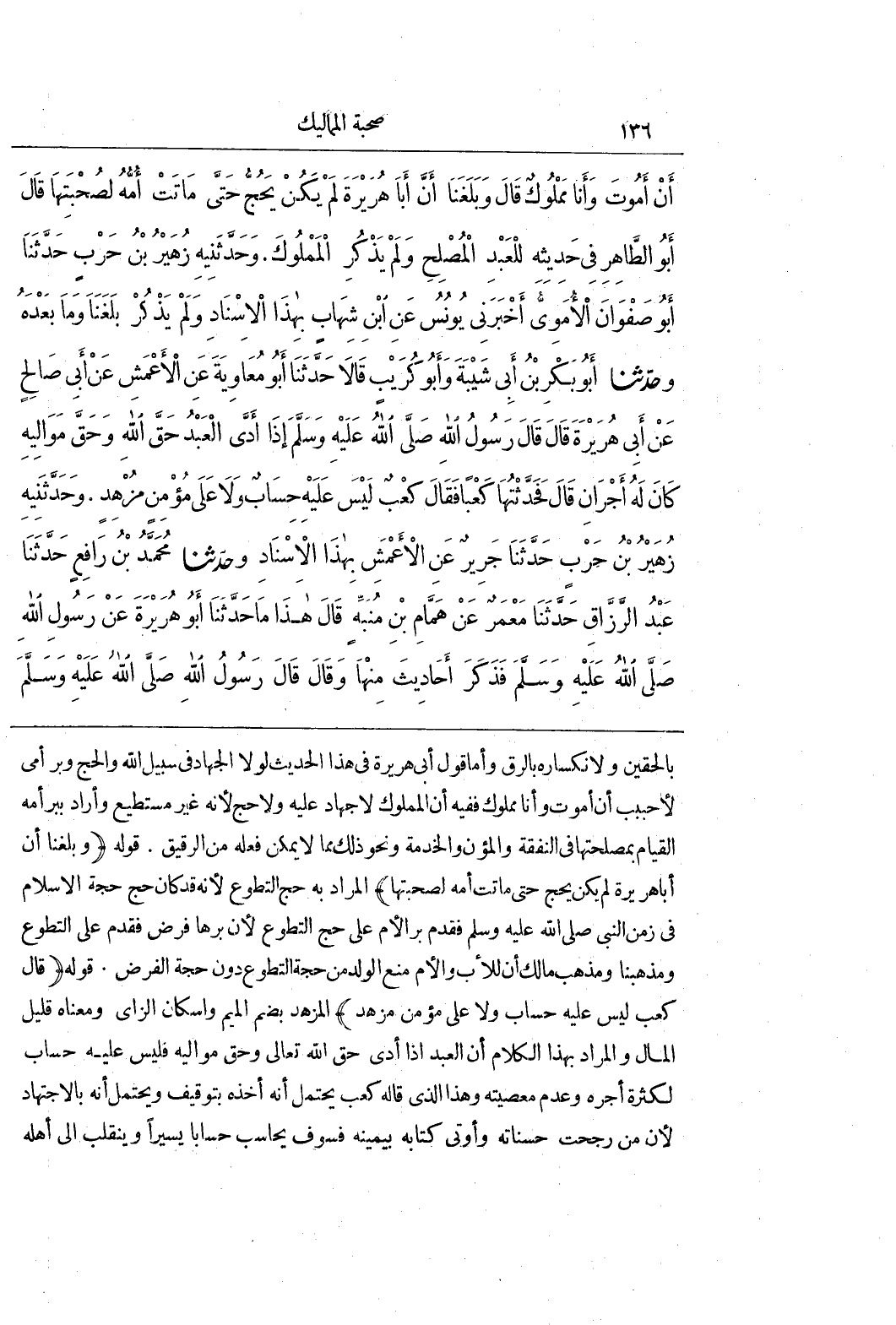 [1665] وَأَمَّا قَوْلُ أَبِي هُرَيْرَةَ فِي هَذَا الْحَدِيثِ لَوْلَا الْجِهَادُ فِي سَبِيلِ اللَّهِ وَالْحَجُّ وَبِرُّ أُمِّي لَأَحْبَبْتُ أَنْ أَمُوتَ وَأَنَا مَمْلُوكٌ فَفِيهِ أَنَّ الْمَمْلُوكَ لَا جِهَادَ عَلَيْهِ وَلَا حَجَّ لِأَنَّهُ غَيْرُ مُسْتَطِيعٍ وَأَرَادَ بِبِرِّ أُمِّهِ الْقِيَامَ بِمَصْلَحَتِهَا فِي النَّفَقَةِ وَالْمُؤَنِ وَالْخِدْمَةِ وَنَحْوِ ذَلِكَ مِمَّا لَا يُمْكِنُ فِعْلُهُ مِنَ الرَّقِيقِ قَوْلُهُ (وَبَلَغَنَا أَنَّ أَبَا هُرَيْرَةَ لَمْ يَكُنْ يَحُجُّ حَتَّى مَاتَتْ أُمُّهُ لِصُحْبَتِهَا) الْمُرَادُ بِهِ حَجُّ التَّطَوُّعِ لِأَنَّهُ قَدْ كَانَ حَجَّ حَجَّةَ الْإِسْلَامِ فِي زَمَنِ النَّبِيِّ صَلَّى اللَّهُ عَلَيْهِ وَسَلَّمَ فَقَدَّمَ بِرَّ الْأُمِّ عَلَى حَجِّ التَّطَوُّعِ لِأَنَّ بِرَّهَا فَرْضٌ فَقُدِّمَ عَلَى التَّطَوُّعِ وَمَذْهَبُنَا وَمَذْهَبُ مَالِكٍ أَنَّ لِلْأَبِ وَالْأُمِّ مَنْعَ الْوَلَدِ مِنْ حَجَّةِ التَّطَوُّعِ دُونَ حَجَّةِ الْفَرْضِ قَوْلُهُ (قَالَ