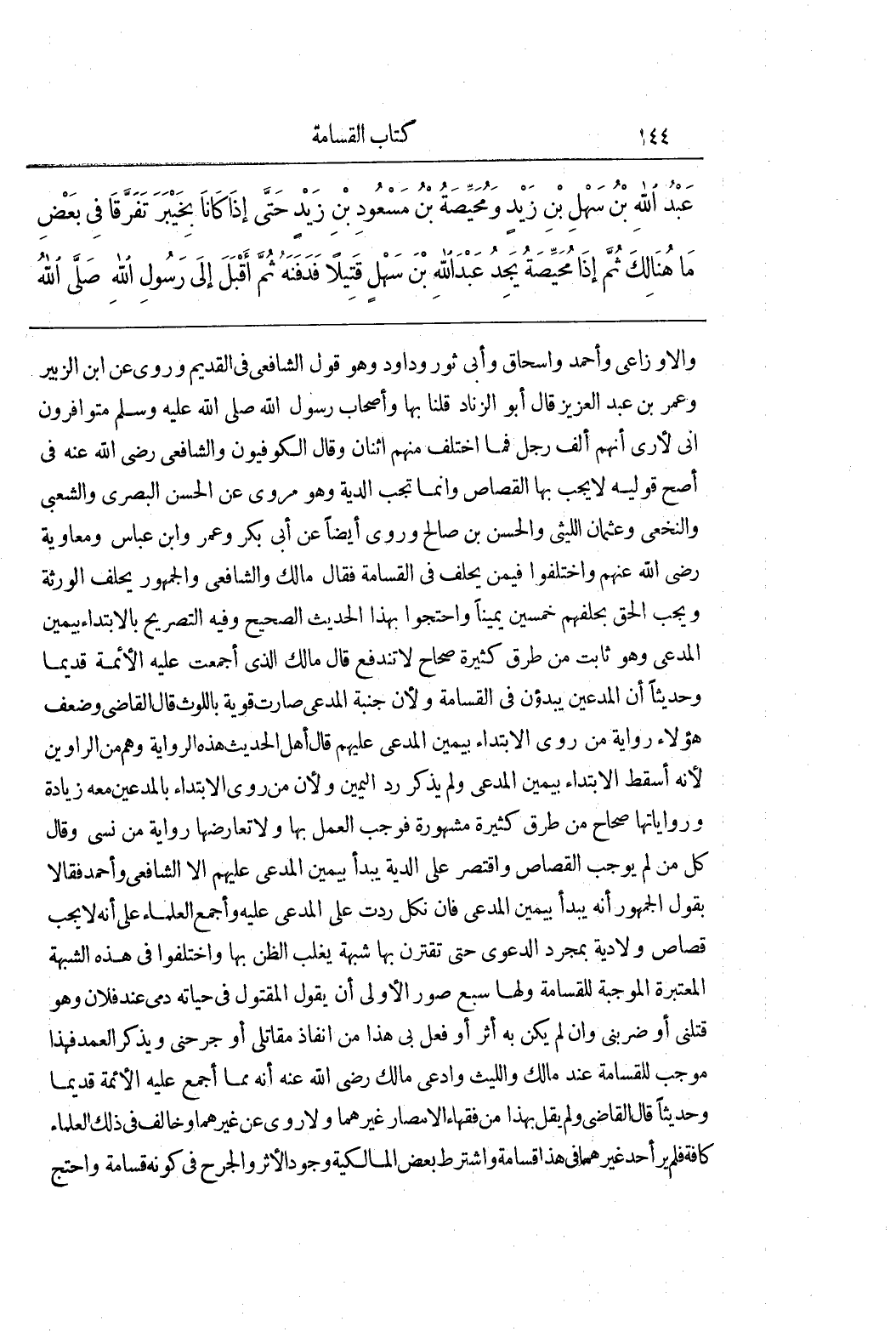 وَالْأَوْزَاعِيِّ وَأَحْمَدَ وَإِسْحَاقَ وَأَبِي ثَوْرٍ وَدَاوُدَ وَهُوَ قول الشافعي في القديم وروى عن بن الزُّبَيْرِ وَعُمَرَ بْنِ عَبْدِ الْعَزِيزِ قَالَ أَبُو الزِّنَادِ قُلْنَا بِهَا وَأَصْحَابُ رَسُولِ اللَّهِ صَلَّى اللَّهُ عَلَيْهِ وَسَلَّمَ مُتَوَافِرُونَ إِنِّي لَأَرَى أَنَّهُمْ أَلْفُ رَجُلٍ فَمَا اخْتَلَفَ مِنْهُمُ اثْنَانِ وَقَالَ الْكُوفِيُّونَ وَالشَّافِعِيُّ رَضِيَ اللَّهُ عَنْهُ فِي أَصَحِّ قَوْلَيْهِ لَا يَجِبُ بِهَا الْقِصَاصُ وَإِنَّمَا تَجِبُ الدِّيَةُ وَهُوَ مَرْوِيٌّ عَنِ الْحَسَنِ الْبَصْرِيِّ وَالشَّعْبِيِّ وَالنَّخَعِيِّ وَعُثْمَانَ اللَّيْثِيِّ وَالْحَسَنِ بْنِ صَالِحٍ وَرُوِيَ أيضا عن أبي بكر وعمر وبن عَبَّاسٍ وَمُعَاوِيَةَ رَضِيَ اللَّهُ عَنْهُمْ وَاخْتَلَفُوا فِيمَنْ يَحْلِفُ فِي الْقَسَامَةِ فَقَالَ مَالِكٌ وَالشَّافِعِيُّ وَالْجُمْهُورُ يَحْلِفُ الْوَرَثَةُ وَيَجِبُ الْحَقُّ بِحَلِفِهِمْ خَمْسِينَ يَمِينًا وَاحْتَجُّوا بِهَذَا الْحَدِيثِ الصَّحِيحِ وَفِيهِ التَّصْرِيحُ بِالِابْتِدَاءِ بِيَمِينِ الْمُدَّعِي وَهُوَ ثَابِتٌ مِنْ طُرُقٍ كَثِيرَةٍ صِحَاحٍ لَا تَنْدَفِعُ قَالَ مَالِكٌ الَّذِي أَجْمَعَتْ عليه الأئمة قديما وحديثا أن المدعين يبدؤن فِي الْقَسَامَةِ وَلِأَنَّ جَنَبَةَ الْمُدَّعِي صَارَتْ قَوِيَّةً بِاللَّوْثِ قَالَ الْقَاضِي وَضَعَّفَ هَؤُلَاءِ رِوَايَةَ مَنْ رَوَى الِابْتِدَاءَ بِيَمِينِ الْمُدَّعَى عَلَيْهِمْ قَالَ أَهْلُ الْحَدِيثِ هَذِهِ الرِّوَايَةُ وَهْمٌ مِنَ الرَّاوِينَ لِأَنَّهُ أَسْقَطَ الِابْتِدَاءَ بِيَمِينِ الْمُدَّعِي وَلَمْ يَذْكُرْ رَدَّ الْيَمِينِ وَلِأَنَّ مَنْ رَوَى الِابْتِدَاءَ بِالْمُدَّعِينَ مَعَهُ زِيَادَةٌ وَرِوَايَاتُهَا صِحَاحٌ مِنْ طُرُقٍ كَثِيرَةٍ مَشْهُورَةٍ فَوَجَبَ الْعَمَلُ بِهَا وَلَا تُعَارِضُهَا رِوَايَةُ مَنْ نَسِيَ وَقَالَ كُلُّ مَنْ لَمْ يُوجِبِ الْقِصَاصَ وَاقْتَصَرَ عَلَى الدِّيَةِ يَبْدَأُ بِيَمِينِ الْمُدَّعَى عَلَيْهِمْ إِلَّا الشَّافِعِيَّ وَأَحْمَدَ فَقَالَا بِقَوْلِ الْجُمْهُورِ أَنَّهُ يَبْدَأُ بِيَمِينِ الْمُدَّعِي فَإِنْ نَكَلَ رُدَّتْ عَلَى الْمُدَّعَى عَلَيْهِ وَأَجْمَعَ الْعُلَمَاءُ عَلَى أَنَّهُ لَا يَجِبُ قِصَاصٌ وَلَا دِيَةٌ بِمُجَرَّدِ الدَّعْوَى حَتَّى تَقْتَرِنَ بِهَا شُبْهَةٌ يُغَلَّبُ الظَّنُّ بِهَا وَاخْتَلَفُوا فِي هَذِهِ الشُّبْهَةِ الْمُعْتَبَرَةِ الْمُوجِبَةِ لِلْقَسَامَةِ وَلَهَا سَبْعُ صُوَرٍ الْأُولَى أَنْ يَقُولَ الْمَقْتُولُ فِي حَيَاتِهِ دَمِي عِنْدَ فُلَانٍ وَهُوَ قَتَلَنِي أَوْ ضَرَبَنِي وَإِنْ لَمْ يَكُنْ بِهِ أَثَرٌ أَوْ فَعَلَ بِي هَذَا مِنْ إِنْفَاذِ مَقَاتِلِي أَوْ جَرَحَنِي وَيَذْكُرُ الْعَمْدَ فَهَذَا مُوجِبٌ لِلْقَسَامَةِ عِنْدَ مَالِكٍ وَاللَّيْثِ وَادَّعَى مَالِكٌ رَضِيَ اللَّهُ عَنْهُ أَنَّهُ مِمَّا أَجْمَعَ عَلَيْهِ الْأَئِمَّةُ قَدِيمًا وَحَدِيثًا قَالَ الْقَاضِي وَلَمْ يَقُلْ بِهَذَا مِنْ فُقَهَاءِ الأمصار غيرهما ولا روى عن غيرهما وخالف فِي ذَلِكَ الْعُلَمَاءَ كَافَّةً فَلَمْ يَرَ أَحَدٌ غيرهما في هذا أقسامه وَاشْتَرَطَ بَعْضُ الْمَالِكِيَّةِ وُجُودَ الْأَثَرِ وَالْجُرْحِ فِي كَوْنِهِ قَسَامَةً وَاحْتَجَّ