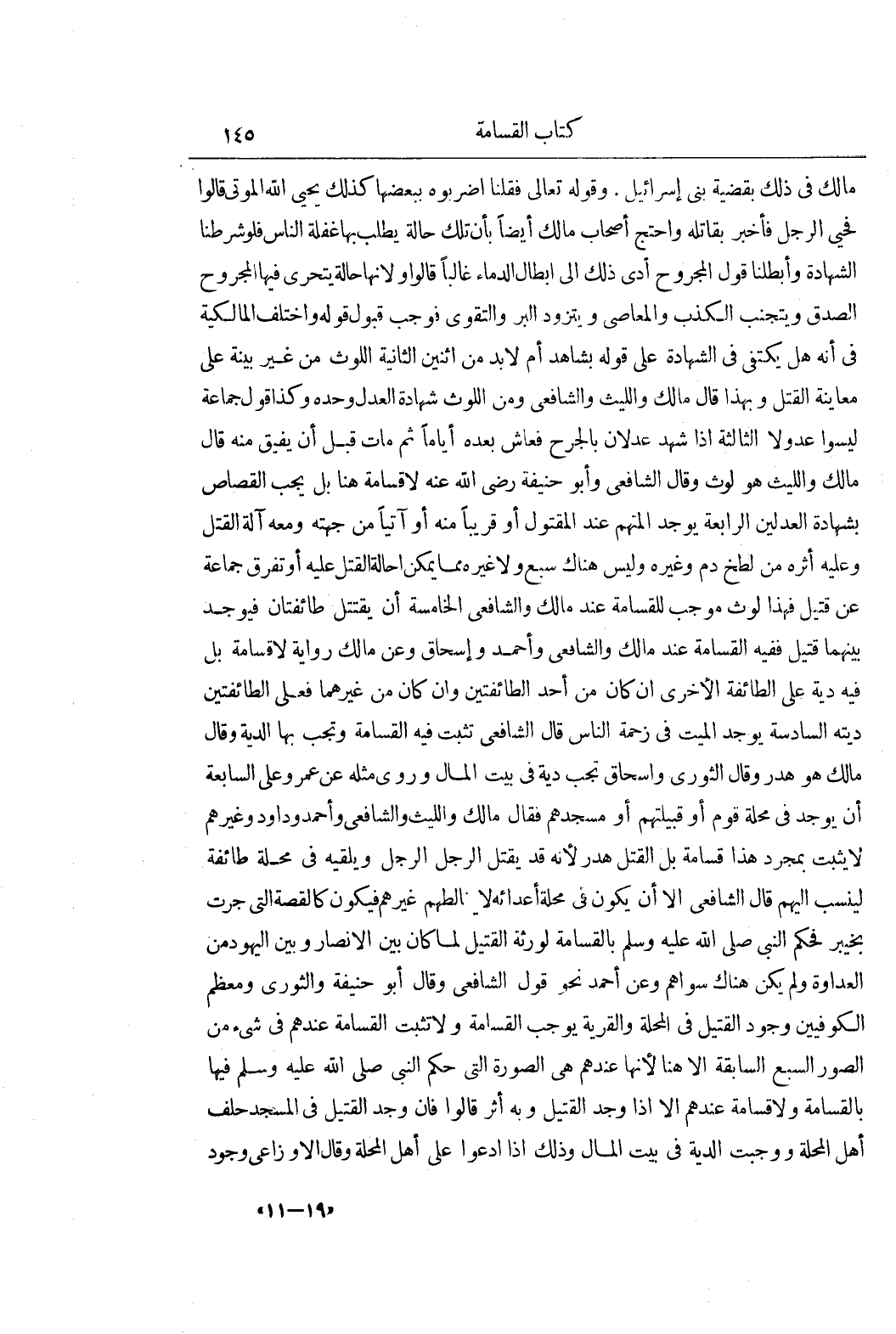 مَالِكٌ فِي ذَلِكَ بِقَضِيَّةِ بَنِي إِسْرَائِيلَ وَقَوْلِهِ تَعَالَى فَقُلْنَا اضْرِبُوهُ بِبَعْضِهَا كَذَلِكَ يُحْيِي اللَّهُ الموتى قَالُوا فَحَيِيَ الرَّجُلُ فَأَخْبَرَ بِقَاتِلِهِ وَاحْتَجَّ أَصْحَابُ مَالِكٍ أَيْضًا بِأَنَّ تِلْكَ حَالَةٌ يُطْلَبُ بهَا غَفْلَةُ النَّاسِ فَلَوْ شَرَطْنَا الشَّهَادَةَ وَأَبْطَلْنَا قَوْلَ الْمَجْرُوحِ أَدَّى ذَلِكَ إِلَى إِبْطَالِ الدِّمَاءِ غَالِبًا قَالُوا وَلِأَنَّهَا حَالَةٌ يَتَحَرَّى فِيهَا الْمَجْرُوحُ الصِّدْقَ وَيَتَجَنَّبُ الْكَذِبَ وَالْمَعَاصِيَ وَيَتَزَوَّدُ الْبِرَّ وَالتَّقْوَى فَوَجَبَ قَبُولُ قَوْلِهِ وَاخْتَلَفَ الْمَالِكِيَّةُ فِي أَنَّهُ هَلْ يُكْتَفَى فِي الشَّهَادَةِ عَلَى قَوْلِهِ بِشَاهِدٍ أَمْ لابد مِنَ اثْنَيْنِ الثَّانِيَةُ اللَّوْثُ مِنْ غَيْرِ بَيِّنَةٍ عَلَى مُعَايَنَةِ الْقَتْلِ وَبِهَذَا قَالَ مَالِكٌ وَاللَّيْثُ وَالشَّافِعِيُّ وَمِنَ اللَّوْثِ شَهَادَةُ الْعَدْلِ وَحْدَهُ وَكَذَا قول جماعة ليسوا عدولا الثالثة إِذَا شَهِدَ عَدْلَانِ بِالْجُرْحِ فَعَاشَ بَعْدَهُ أَيَّامًا ثُمَّ مَاتَ قَبْلَ أَنْ يُفِيقَ مِنْهُ قَالَ مَالِكٌ وَاللَّيْثُ هُوَ لَوْثٌ وَقَالَ الشَّافِعِيُّ وَأَبُو حنيفة رضي الله عنه لاقسامة هُنَا بَلْ يَجِبُ الْقِصَاصُ بِشَهَادَةِ الْعَدْلَيْنِ الرَّابِعَةُ يُوجَدُ الْمُتَّهَمُ عِنْدَ الْمَقْتُولِ أَوْ قَرِيبًا مِنْهُ أَوْ آتِيًا مِنْ جِهَتِهِ وَمَعَهُ آلَةُ الْقَتْلِ وعليه أثره من لطخ دم وغيره وَلَيْسَ هُنَاكَ سَبْعٌ وَلَا غَيْرُهُ مِمَّا يُمْكِنُ إِحَالَةُ الْقَتْلِ عَلَيْهِ أَوْ تَفَرَّقَ جَمَاعَةٌ عَنْ قَتِيلٍ فَهَذَا لَوْثٌ مُوجِبٌ لِلْقَسَامَةِ عِنْدَ مَالِكٍ وَالشَّافِعِيِّ الْخَامِسَةُ أَنْ يَقْتَتِلَ طَائِفَتَانِ فَيُوجَدُ بَيْنَهُمَا قَتِيلٌ فَفِيهِ الْقَسَامَةُ عِنْدَ مَالِكٍ وَالشَّافِعِيِّ وَأَحْمَدَ وإسحاق وعن مالك رواية لإقسامه بَلْ فِيهِ دِيَةٌ عَلَى الطَّائِفَةِ الْأُخْرَى إِنْ كَانَ مِنْ أَحَدِ الطَّائِفَتَيْنِ وَإِنْ كَانَ مِنْ غَيْرِهِمَا فَعَلَى الطَّائِفَتَيْنِ دِيَتُهُ السَّادِسَةُ يُوجَدُ الْمَيِّتُ فِي زَحْمَةِ النَّاسِ قَالَ الشَّافِعِيُّ تَثْبُتُ فِيهِ الْقَسَامَةُ وَتَجِبُ بِهَا الدِّيَةُ وَقَالَ مَالِكٌ هُوَ هدر وقال الثوري واسحاق تجب دية فِي بَيْتِ الْمَالِ وَرُوِيَ مِثْلُهُ عَنْ عُمَرَ وعلى السابعة أَنْ يُوجَدَ فِي مَحَلَّةِ قَوْمٍ أَوْ قَبِيلَتِهِمْ أَوْ مَسْجِدِهِمْ فَقَالَ مَالِكٌ وَاللَّيْثُ وَالشَّافِعِيُّ وَأَحْمَدُ وَدَاوُدُ وَغَيْرُهُمْ لَا يَثْبُتُ بِمُجَرَّدِ هَذَا قَسَامَةٌ بَلِ الْقَتْلُ هَدَرٌ لِأَنَّهُ قَدْ يَقْتُلُ الرَّجُلُ الرَّجُلَ وَيُلْقِيهِ فِي مَحَلَّةِ طَائِفَةٍ لِيُنْسَبَ إِلَيْهِمْ قَالَ الشَّافِعِيُّ إِلَّا أَنْ يَكُونَ فِي مَحَلَّةِ أعدائه لا يغالطهم غَيْرُهُمْ فَيَكُونُ كَالْقِصَّةِ الَّتِي جَرَتْ بِخَيْبَرَ فَحَكَمَ النَّبِيُّ صَلَّى اللَّهُ عَلَيْهِ وَسَلَّمَ بِالْقَسَامَةِ لِوَرَثَةِ الْقَتِيلِ لِمَا كَانَ بَيْنَ الْأَنْصَارِ وَبَيْنَ الْيَهُودِ مِنَ الْعَدَاوَةِ وَلَمْ يَكُنْ هُنَاكَ سِوَاهُمْ وَعَنْ أَحْمَدَ نَحْوَ قَوْلِ الشَّافِعِيِّ وَقَالَ أَبُو حَنِيفَةَ وَالثَّوْرِيُّ وَمُعْظَمُ الْكُوفِيِّينَ وُجُودُ الْقَتِيلِ فِي الْمَحَلَّةِ وَالْقَرْيَةِ يُوجِبُ الْقَسَامَةَ وَلَا تَثْبُتُ الْقَسَامَةُ عِنْدَهُمْ فِي شَيْءٍ مِنَ الصُّوَرِ السَّبْعِ السَّابِقَةِ إِلَّا هُنَا لِأَنَّهَا عِنْدَهُمْ هِيَ الصُّورَةُ الَّتِي حَكَمَ النَّبِيُّ صَلَّى اللَّهُ عَلَيْهِ وَسَلَّمَ فِيهَا بِالْقَسَامَةِ وَلَا قَسَامَةَ عِنْدَهُمْ إِلَّا إِذَا وُجِدَ الْقَتِيلُ وَبِهِ أَثَرٌ قَالُوا فَإِنْ وُجِدَ الْق