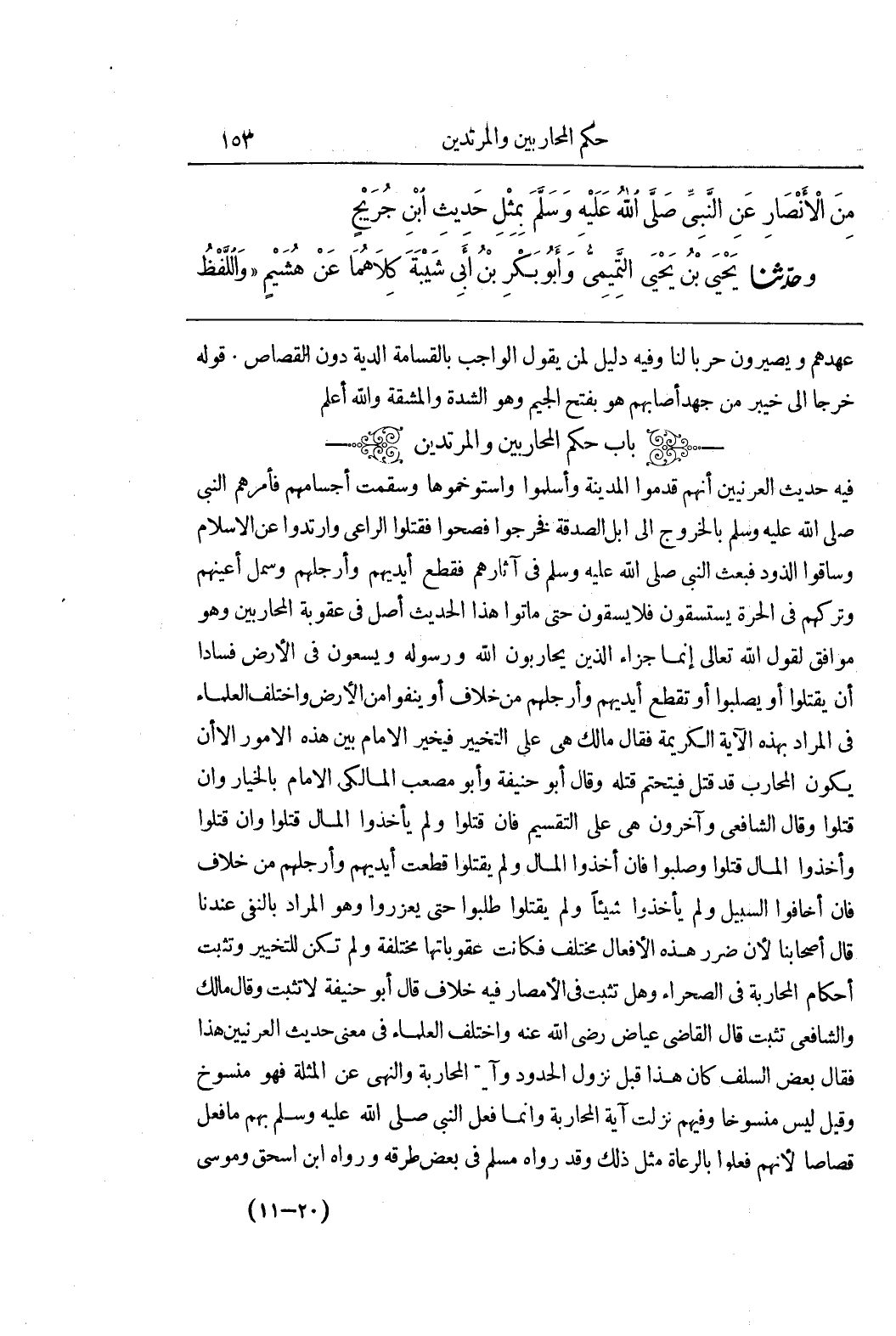 فِيهِ حَدِيثُ الْعُرَنِيِّينَ أَنَّهُمْ قَدِمُوا الْمَدِينَةَ وَأَسْلَمُوا وَاسْتَوْخَمُوهَا وَسَقِمَتْ أَجْسَامُهُمْ فَأَمَرَهُمُ النَّبِيُّ صَلَّى اللَّهُ عَلَيْهِ وَسَلَّمَ بِالْخُرُوجِ إِلَى إِبِلِ الصَّدَقَةِ فَخَرَجُوا فَصَحُّوا فَقَتَلُوا الرَّاعِيَ وَارْتَدُّوا عَنِ الْإِسْلَامِ وَسَاقُوا الذَّوْدَ فَبَعَثَ النَّبِيُّ صَلَّى اللَّهُ عَلَيْهِ وَسَلَّمَ فِي آثَارِهِمْ فَقَطَعَ أَيْدِيَهُمْ وَأَرْجُلَهُمْ وَسَمَلَ أَعْيُنَهُمْ وَتَرَكَهُمْ فِي الْحَرَّةِ يَسْتَسْقُونَ فَلَا يُسْقَوْنَ حَتَّى مَاتُوا هَذَا الْحَدِيثُ أَصْلٌ فِي عُقُوبَةِ الْمُحَارِبِينَ وَهُوَ مُوَافِقٌ لِقَوْلِ اللَّهِ تَعَالَى إِنَّمَا جَزَاءُ الَّذِينَ يُحَارِبُونَ اللَّهَ وَرَسُولَهُ وَيَسْعَوْنَ فِي الْأَرْضِ فَسَادًا أَنْ يُقَتَّلُوا أَوْ يُصَلَّبُوا أَوْ تُقَطَّعَ أَيْدِيهِمْ وَأَرْجُلُهُمْ مِنْ خِلَافٍ أَوْ يُنْفَوْا مِنَ الأرض وَاخْتَلَفَ الْعُلَمَاءُ فِي الْمُرَادِ بِهَذِهِ الْآيَةِ الْكَرِيمَةِ فَقَالَ مَالِكٌ هِيَ عَلَى التَّخْيِيرِ فَيُخَيَّرُ الْإِمَامُ بَيْنَ هَذِهِ الْأُمُورِ إِلَّا أَنْ يَكُونَ الْمُحَارِبُ قَدْ قَتَلَ فَيَتَحَتَّمُ قَتْلُهُ وَقَالَ أَبُو حَنِيفَةَ وَأَبُو مُصْعَبٍ الْمَالِكِيُّ الْإِمَامُ بِالْخِيَارِ وَإِنْ قَتَلُوا وَقَالَ الشَّافِعِيُّ وَآخَرُونَ هِيَ عَلَى التَّقْسِيمِ فَإِنْ قَتَلُوا وَلَمْ يَأْخُذُوا الْمَالَ قُتِلُوا وَإِنْ قَتَلُوا وَأَخَذُوا الْمَالَ قُتِلُوا وَصُلِبُوا فَإِنْ أَخَذُوا الْمَالَ وَلَمْ يَقْتُلُوا قُطِعَتْ أَيْدِيهِمْ وَأَرْجُلُهُمْ مِنْ خِلَافٍ فَإِنْ أَخَافُوا السَّبِيلَ وَلَمْ يَأْخُذُوا شَيْئًا وَلَمْ يَقْتُلُوا طُلِبُوا حَتَّى يُعَزَّرُوا وَهُوَ الْمُرَادُ بِالنَّفْيِ عِنْدَنَا قَالَ أَصْحَابُنَا لِأَنَّ ضَرَرَ هَذِهِ الْأَفْعَالِ مُخْتَلِفٌ فَكَانَتْ عُقُوبَاتُهَا مُخْتَلِفَةً وَلَمْ تَكُنْ لِلتَّخْيِيرِ وَتَثْبُتُ أَحْكَامُ الْمُحَارَبَةِ فِي الصَّحْرَاءِ وَهَلْ تَثْبُتُ فِي الْأَمْصَارِ فِيهِ خِلَافٌ قَالَ أَبُو حَنِيفَةَ لَا تَثْبُتُ وَقَالَ مَالِكٌ وَالشَّافِعِيُّ تَثْبُتُ قَالَ الْقَاضِي عِيَاضٌ رَضِيَ اللَّهُ عَنْهُ وَاخْتَلَفَ الْعُلَمَاءُ فِي مَعْنَى حَدِيثِ الْعُرَنِيِّينَ هَذَا فَقَالَ بَعْضُ السَّلَفِ كَانَ هَذَا قَبْلَ نُزُولِ الْحُدُودِ وَآيَةِ الْمُحَارَبَةِ وَالنَّهْيِ عَنِ الْمُثْلَةِ فَهُوَ مَنْسُوخٌ وَقِيلَ لَيْسَ مَنْسُوخًا وَفِيهِمْ نَزَلَتْ آيَةُ الْمُحَارَبَةِ وَإِنَّمَا فَعَلَ النَّبِيُّ صَلَّى اللَّهُ عَلَيْهِ وَسَلَّمَ بِهِمْ مَا فَعَلَ قِصَاصًا لِأَنَّهُمْ فَعَلُوا بِالرُّعَاةِ مِثْلَ ذَلِكَ وَقَدْ رَوَاهُ مُسْلِمٌ فِي بَعْضِ طُرُقِهِ ورواه بن إسحاق وموسى)