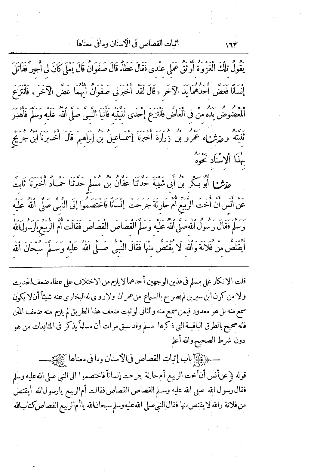 [1675] قَوْلُهُ (عَنْ أَنَسٍ أَنَّ أُخْتَ الرُّبَيِّعِ أُمَّ حَارِثَةَ جَرَحَتْ إِنْسَانًا فَاخْتَصَمُوا إِلَى النَّبِيِّ صَلَّى اللَّهُ عَلَيْهِ وَسَلَّمَ فَقَالَ رَسُولُ اللَّهِ صَلَّى اللَّهُ عَلَيْهِ وَسَلَّمَ الْقِصَاصَ الْقِصَاصَ فَقَالَتْ أُمُّ الرُّبَيِّعِ يَا رَسُولَ اللَّهِ أَيُقْتَصُّ مِنْ فُلَانَةَ وَاللَّهِ لَا يُقْتَصُّ مِنْهَا فَقَالَ النَّبِيُّ صَلَّى اللَّهُ عَلَيْهِ وَسَلَّمَ سُبْحَانَ اللَّهِ يَا أُمَّ الرُّبَيِّعِ الْقِصَاصُ كِتَابُ اللَّهِ)