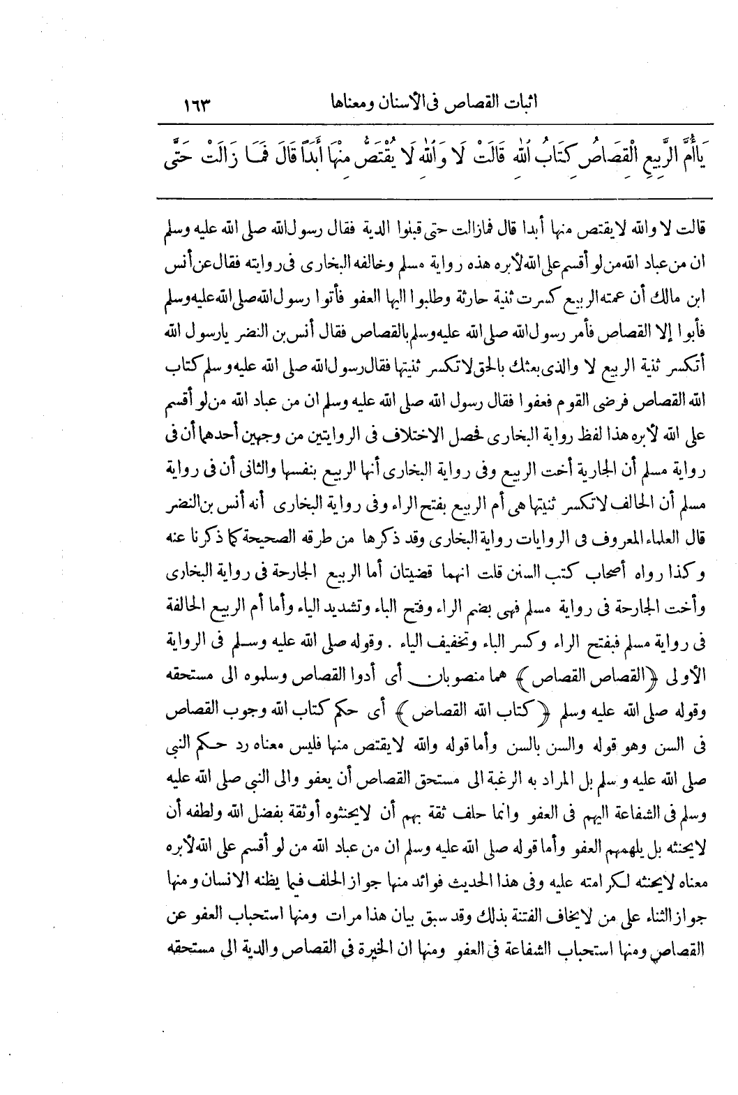 قَالَتْ لَا وَاللَّهِ لَا يُقْتَصُّ مِنْهَا أَبَدًا قَالَ فَمَا زَالَتْ حَتَّى قَبِلُوا الدِّيَةَ فَقَالَ رَسُولُ اللَّهِ صَلَّى اللَّهُ عَلَيْهِ وَسَلَّمَ إن مِنْ عِبَادِ اللَّهِ مَنْ لَوْ أَقْسَمَ عَلَى اللَّهِ لَأَبَرَّهُ هَذِهِ رِوَايَةُ مُسْلِمٍ وَخَالَفَهُ الْبُخَارِيُّ فِي رِوَايَتِهِ فَقَالَ عَنْ أَنَسِ بْنِ مَالِكٍ أن عمته الربيع كسرت ثنية حارثة وَطَلَبُوا إِلَيْهَا الْعَفْوَ فَأَتَوْا رَسُولَ اللَّهِ صَلَّى اللَّهُ عَلَيْهِ وَسَلَّمَ فَأَبَوْا إِلَّا الْقِصَاصَ فَأَمَرَ رَسُولُ اللَّهِ صَلَّى اللَّهُ عَلَيْهِ وَسَلَّمَ بِالْقِصَاصِ فَقَالَ أَنَسُ بْنُ النَّضْرِ يَا رَسُولَ اللَّهِ أَتُكْسَرُ ثَنِيَّةُ الرُّبَيِّعِ لَا وَالَّذِي بَعَثَكَ بِالْحَقِّ لَا تُكْسَرُ ثَنِيَّتُهَا فَقَالَ رَسُولُ اللَّهِ صَلَّى اللَّهُ عَلَيْهِ وَسَلَّمَ كِتَابُ اللَّهِ الْقِصَاصُ فَرَضِيَ الْقَوْمُ فَعَفَوْا فَقَالَ رَسُولُ اللَّهِ صَلَّى اللَّهُ عَلَيْهِ وَسَلَّمَ إِنَّ مِنْ عِبَادِ اللَّهِ مَنْ لَوْ أَقْسَمَ عَلَى اللَّهِ لَأَبَرَّهُ هَذَا لَفْظُ رِوَايَةِ الْبُخَارِيِّ فَحَصَلَ الِاخْتِلَافُ فِي الرِّوَايَتَيْنِ مِنْ وَجْهَيْنِ أَحَدُهُمَا أَنَّ فِي رِوَايَةِ مُسْلِمٍ أَنَّ الْجَارِيَةَ أُخْتُ الرُّبَيِّعِ وَفِي رِوَايَةِ الْبُخَارِيِّ أَنَّهَا الرُّبَيِّعُ بِنَفْسِهَا وَالثَّانِي أَنَّ فِي رِوَايَةِ مُسْلِمٍ أَنَّ الْحَالِفَ لَا تُكْسَرُ ثَنِيَّتُهَا هِيَ أُمُّ الرَّبِيعِ بِفَتْحِ الرَّاءِ وَفِي رِوَايَةِ الْبُخَارِيِّ أَنَّهُ أَنَسُ بْنُ النَّضْرِ قَالَ الْعُلَمَاءُ الْمَعْرُوفُ فِي الرِّوَايَاتِ رِوَايَةُ الْبُخَارِيِّ وَقَدْ ذَكَرَهَا مِنْ طُرُقِهِ الصَّحِيحَةِ كَمَا ذَكَرْنَا عَنْهُ وَكَذَا رَوَاهُ أَصْحَابُ كُتُبِ السُّنَنِ قُلْتُ إِنَّهُمَا قَضِيَّتَانِ أَمَّا الرُّبَيِّعُ الجارحة في رواية البخاري وأخت الجارحة فِي رِوَايَةِ مُسْلِمٍ فَهِيَ بِضَمِّ الرَّاءِ وَفَتْحِ الْبَاءِ وَتَشْدِيدِ الْيَاءِ وَأَمَّا أُمُّ الرَّبِيعِ الْحَالِفَةُ فِي رِوَايَةِ مُسْلِمٍ فَبِفَتْحِ الرَّاءِ وَكَسْرِ الْبَاءِ وَتَخْفِيفِ الْيَاءِ وَقَوْلُهُ صَلَّى اللَّهُ عَلَيْهِ وَسَلَّمَ فِي الرِّوَايَةِ الْأُولَى (الْقِصَاصَ الْقِصَاصَ) هُمَا مَنْصُوبَانِ أَيْ أَدُّوا الْقِصَاصَ وَسَلِّمُوهُ إِلَى مُسْتَحِقِّهِ وَقَوْلُهُ صَلَّى اللَّهُ عَلَيْهِ وَسَلَّمَ (كِتَابُ اللَّهِ الْقِصَاصُ) أَيْ حُكْمُ كِتَابِ اللَّهِ وُجُوبُ الْقِصَاصِ فِي السن وهو قوله والسن بالسن وَأَمَّا قَوْلُهُ وَاللَّهِ لَا يُقْتَصُّ مِنْهَا فَلَيْسَ مَعْنَاهُ رَدَّ حُكْمِ النَّبِيِّ صَلَّى اللَّهُ عَلَيْهِ وَسَلَّمَ بَلِ الْمُرَادُ بِهِ الرَّغْبَةُ إِلَى مُسْتَحِقِّ الْقِصَاصِ أَنْ يَعْفُوَ وَإِلَى النَّبِيِّ صَلَّى اللَّهُ عَلَيْهِ وَسَلَّمَ فِي الشَّفَاعَةِ إِلَيْهِمْ فِي الْعَفْوِ وإنما حلف ثقة بهم أن لا يحنثوه أو ثقة بفضل الله ولطفه أن لا يُحْنِثَهُ بَلْ يُلْهِمُهُمُ الْعَفْوَ وَأَمَّا قَوْلُهُ صَلَّى اللَّهُ عَلَيْهِ وَسَلَّمَ إِنَّ مِنْ عِبَادِ اللَّهِ مَنْ لَوْ أَقْسَمَ عَلَى اللَّهِ لَأَبَرَّهُ مَعْنَاهُ لَا يُحْنِثُهُ لِكَرَامَتِهِ عَلَيْهِ وَفِي هَذَا الْحَدِيثِ فَوَائِدُ مِنْهَا 1 جَوَازُ الْحَلِفِ فِيمَا يَظُنُّهُ الْإِنْسَانُ وَمِنْهَا جَوَازُ الثَّنَاءِ عَلَى مَنْ لَا يَخَافُ الْفِتْنَةَ بِذَلِكَ وَقَدْ سَبَقَ بَيَانُ هَذَا مَرَّاتٍ 2 وَمِنْهَا اسْتِحْبَابُ الْعَفْوِ عَنِ الْقِصَاصِ 3 وَمِنْهَا اسْتِحْبَابُ الشَّفَاعَةِ فِي الْعَفْوِ 4 وَمِنْهَا أَنَّ الْخِيَرَةَ فِي الْقِصَاصِ وَالدِّيَةِ إِلَى مُسْتَحِقِّهِ لَا إِلَى الْمُسْتَحَقِّ عليه