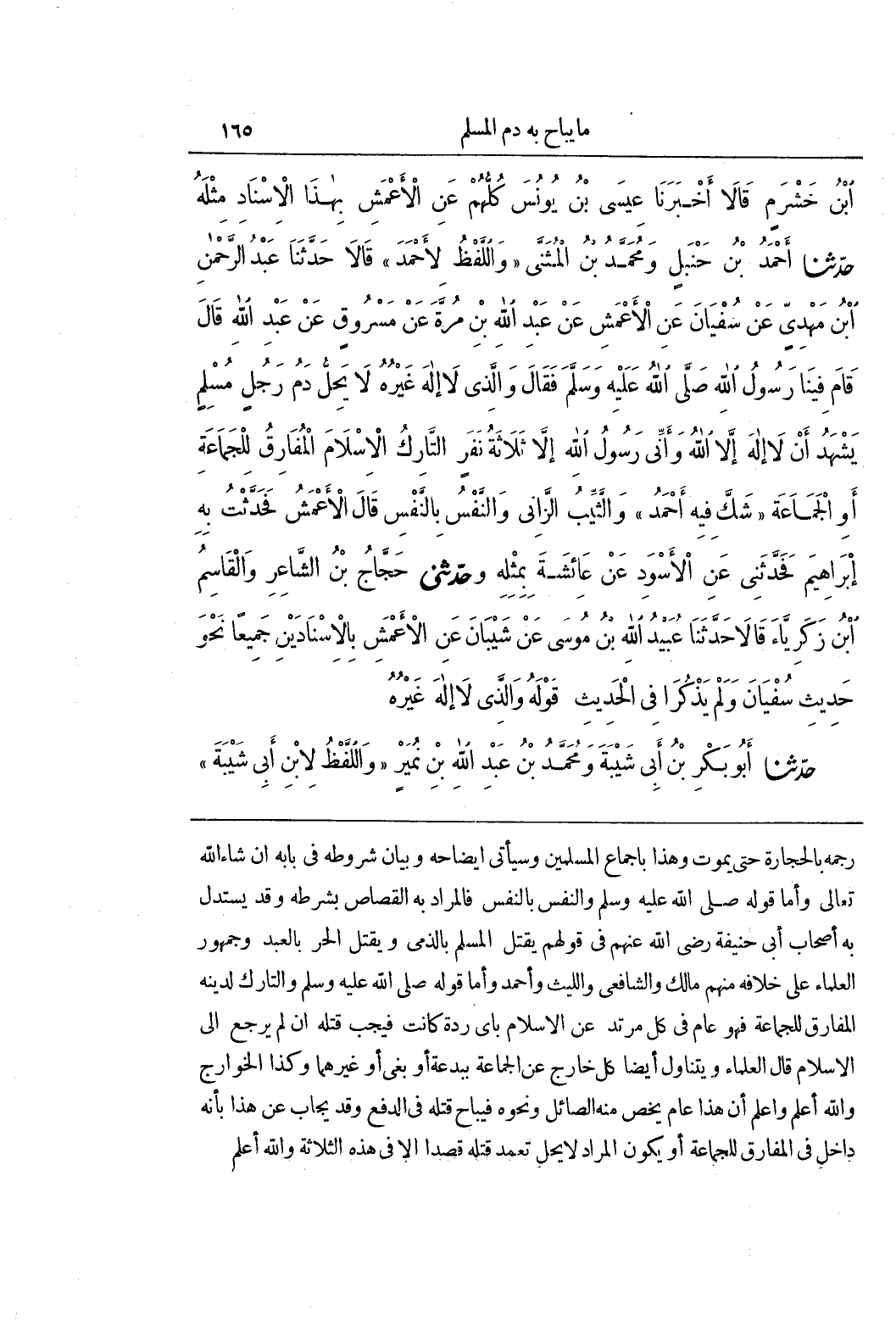 رَجْمُهُ بِالْحِجَارَةِ حَتَّى يَمُوتَ وَهَذَا بِإِجْمَاعِ الْمُسْلِمِينَ وَسَيَأْتِي إِيضَاحُهُ وَبَيَانُ شُرُوطِهِ فِي بَابِهِ إِنْ شَاءَ اللَّهُ تَعَالَى وَأَمَّا قَوْلُهُ صَلَّى اللَّهُ عَلَيْهِ وَسَلَّمَ (وَالنَّفْسُ بِالنَّفْسِ فَالْمُرَادُ بِهِ الْقِصَاصُ بِشَرْطِهِ وَقَدْ يَسْتَدِلُّ بِهِ أَصْحَابُ أَبِي حَنِيفَةَ رَضِيَ اللَّهُ عَنْهُمْ فِي قَوْلِهِمْ يُقْتَلُ الْمُسْلِمُ بِالذِّمِّيِّ وَيُقْتَلُ الْحُرُّ بِالْعَبْدِ وَجُمْهُورُ الْعُلَمَاءِ عَلَى خِلَافِهِ مِنْهُمْ مَالِكٌ وَالشَّافِعِيُّ وَاللَّيْثُ وَأَحْمَدُ وَأَمَّا قَوْلُهُ صَلَّى اللَّهُ عَلَيْهِ وَسَلَّمَ وَالتَّارِكُ لِدِينِهِ الْمُفَارِقُ لِلْجَمَاعَةِ فَهُوَ عَامٌّ فِي كُلِّ مُرْتَدٍّ عَنِ الْإِسْلَامِ بِأَيِّ رِدَّةٍ كَانَتْ فَيَجِبُ قَتْلُهُ إِنْ لَمْ يَرْجِعْ إِلَى الْإِسْلَامِ قَالَ الْعُلَمَاءُ وَيَتَنَاوَلُ أَيْضًا كُلَّ خَارِجٍ عَنِ الْجَمَاعَةِ بِبِدْعَةٍ أو بغي أوغيرهما وَكَذَا الْخَوَارِجُ وَاللَّهُ أَعْلَمُ وَاعْلَمْ أَنَّ هَذَا عَامٌّ يُخَصُّ مِنْهُ الصَّائِلُ وَنَحْوُهُ فَيُبَاحُ قَتْلُهُ فِي الدَّفْعِ وَقَدْ يُجَابُ عَنْ هَذَا بِأَنَّهُ دَاخِلٌ فِي الْمُفَارِقِ لِلْجَمَاعَةِ أَوْ يَكُونُ الْمُرَادُ لَا يَحِلُّ تَعَمُّدُ قَتْلِهِ قَصْدًا إِلَّا فِي هذه الثلاثة والله أعلم