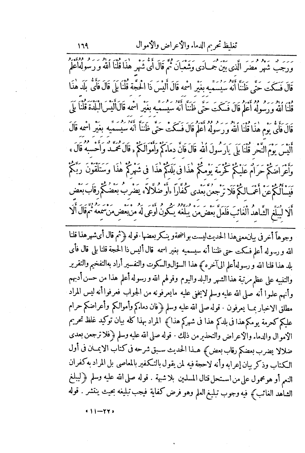 وُجُوهًا أُخَرَ فِي بَيَانِ مَعْنَى هَذَا الْحَدِيثِ لَيْسَتْ بِوَاضِحَةٍ وَيُنْكَرُ بَعْضُهَا قَوْلُهُ (ثُمَّ قَالَ أَيُّ شَهْرٍ هَذَا قُلْنَا اللَّهُ وَرَسُولُهُ أَعْلَمُ فَسَكَتَ حَتَّى ظَنَنَّا أَنَّهُ سَيُسَمِّيهِ بِغَيْرِ اسْمِهِ قَالَ أَلَيْسَ ذَا الْحِجَّةَ قُلْنَا بَلَى قَالَ فَأَيُّ بَلَدٍ هَذَا قُلْنَا اللَّهُ وَرَسُولُهُ أَعْلَمُ إِلَى آخِرِهِ) هَذَا السُّؤَالُ وَالسُّكُوتُ وَالتَّفْسِيرُ أَرَادَ بِهِ التَّفْخِيمَ وَالتَّقْرِيرَ وَالتَّنْبِيهَ عَلَى عِظَمِ مَرْتَبَةِ هَذَا الشَّهْرِ وَالْبَلَدِ وَالْيَوْمِ وَقَوْلُهُمْ اللَّهُ وَرَسُولُهُ أَعْلَمُ هَذَا مِنْ حُسْنِ أَدَبِهِمْ وَأَنَّهُمْ عَلِمُوا أَنَّهُ صَلَّى اللَّهُ عَلَيْهِ وَسَلَّمَ لَا يَخْفَى عَلَيْهِ مَا يَعْرِفُونَهُ مِنَ الْجَوَابِ فَعَرَفُوا أَنَّهُ لَيْسَ الْمُرَادُ مُطْلَقَ الْإِخْبَارِ بِمَا يَعْرِفُونَ قَوْلُهُ صَلَّى اللَّهُ عَلَيْهِ وَسَلَّمَ (فَإِنَّ دِمَاءَكُمْ وَأَمْوَالَكُمْ وَأَعْرَاضَكُمْ حَرَامٌ عَلَيْكُمْ كَحُرْمَةِ يَوْمِكُمْ هَذَا فِي بَلَدِكُمْ هَذَا فِي شَهْرِكُمْ هَذَا) الْمُرَادُ بِهَذَا كُلِّهِ بَيَانُ تَوْكِيدِ غِلَظِ تَحْرِيمِ الْأَمْوَالِ وَالدِّمَاءِ وَالْأَعْرَاضِ وَالتَّحْذِيرُ مِنْ ذَلِكَ قَوْلُهُ صَلَّى اللَّهُ عَلَيْهِ وَسَلَّمَ (فَلَا تَرْجِعُنَّ بَعْدِي ضُلَّالًا يَضْرِبُ بَعْضُكُمْ رِقَابَ بَعْضٍ) هَذَا الْحَدِيثُ سَبَقَ شَرْحُهُ فِي كِتَابِ الْإِيمَانِ فِي أَوَّلِ الْكِتَابِ وَذِكْرُ بَيَانِ إِعْرَابِهِ وَأَنَّهُ لَا حُجَّةَ فِيهِ لِمَنْ يَقُولُ بِالتَّكْفِيرِ بِالْمَعَاصِي بَلِ الْمُرَادُ بِهِ كُفْرَانُ النِّعَمِ أَوْ هُوَ مَحْمُولٌ عَلَى مَنِ اسْتَحَلَّ قِتَالَ الْمُسْلِمِينَ بِلَا شُبْهَةٍ قَوْلُهُ صَلَّى اللَّهُ عَلَيْهِ وَسَلَّمَ (لِيُبَلِّغِ الشَّاهِدُ الْغَائِبَ) فِيهِ وُجُوبُ تَبْلِيغِ الْعِلْمِ وَهُوَ فَرْضُ كِفَايَةٍ فَيَجِبُ تَبْلِيغُهُ بِحَيْثُ يَنْتَشِرُ قَوْلُهُ