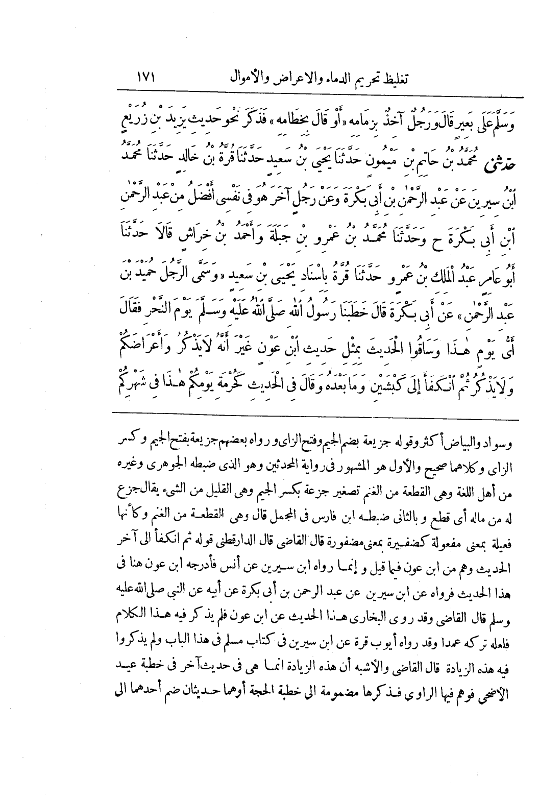 وَسَوَادٌ وَالْبَيَاضُ أَكْثَرُ وَقَوْلُهُ جُزَيْعَةٌ بِضَمِّ الْجِيمِ وَفَتْحِ الزَّايِ وَرَوَاهُ بَعْضُهُمْ جَزِيعَةٌ بِفَتْحِ الْجِيمِ وَكَسْرِ الزَّايِ وَكِلَاهُمَا صَحِيحٌ وَالْأَوَّلُ هُوَ الْمَشْهُورُ فِي رِوَايَةِ الْمُحَدِّثِينَ وَهُوَ الَّذِي ضَبَطَهُ الْجَوْهَرِيُّ وَغَيْرُهُ مِنْ أَهْلِ اللُّغَةِ وَهِيَ الْقِطْعَةُ مِنَ الْغَنَمِ تَصْغِيرُ جِزْعَةٍ بِكَسْرِ الْجِيمِ وَهِيَ الْقَلِيلُ مِنَ الشَّيْءِ يُقَالُ جَزَعَ لَهُ مِنْ مَالِهِ أي قطع وبالثاني ضبطه بن فَارِسٍ فِي الْمُجْمَلِ قَالَ وَهِيَ الْقِطْعَةُ مِنَ الغنم وكأنها فَعِيلَةٌ بِمَعْنَى مَفْعُولَةٍ كَضَفِيرَةٍ بِمَعْنَى مَضْفُورَةٍ قَالَ الْقَاضِي قَالَ الدَّارَقُطْنِيُّ قَوْلُهُ ثُمَّ انْكَفَأَ إِلَى آخر الحديث وهم من بن عون فيما قيل وإنما رواه بن سيرين عن أنس فأدرجه بن عَوْنٍ هُنَا فِي هَذَا الْحَدِيثِ فَرَوَاهُ عَنِ بن سِيرِينَ عَنْ عَبْدِ الرَّحْمَنِ بْنِ أَبِي بَكْرَةَ عَنْ أَبِيهِ عَنِ النَّبِيِّ صَلَّى اللَّهُ عَلَيْهِ وَسَلَّمَ قَالَ الْقَاضِي وَقَدْ رَوَى الْبُخَارِيُّ هَذَا الحديث عن بن عَوْنٍ فَلَمْ يَذْكُرْ فِيهِ هَذَا الْكَلَامَ فَلَعَلَّهُ تركه عمدا وقد رواه أيوب وقرة عن بن سِيرِينَ فِي كِتَابِ مُسْلِمٍ فِي هَذَا الْبَابِ وَلَمْ يَذْكُرُوا فِيهِ هَذِهِ الزِّيَادَةَ قَالَ الْقَاضِي وَالْأَشْبَهُ أَنَّ هَذِهِ الزِّيَادَةَ إِنَّمَا هِيَ فِي حَدِيثٍ آخَرَ فِي خُطْبَةِ عِيدِ الْأَضْحَى فَوَهِمَ فِيهَا الرَّاوِي فَذَكَرَهَا مَضْمُومَةً إِلَى خُطْبَةِ الْحَجَّةِ أوهما حَدِيثَانِ ضُمَّ أَحَدُهُمَا إِلَى