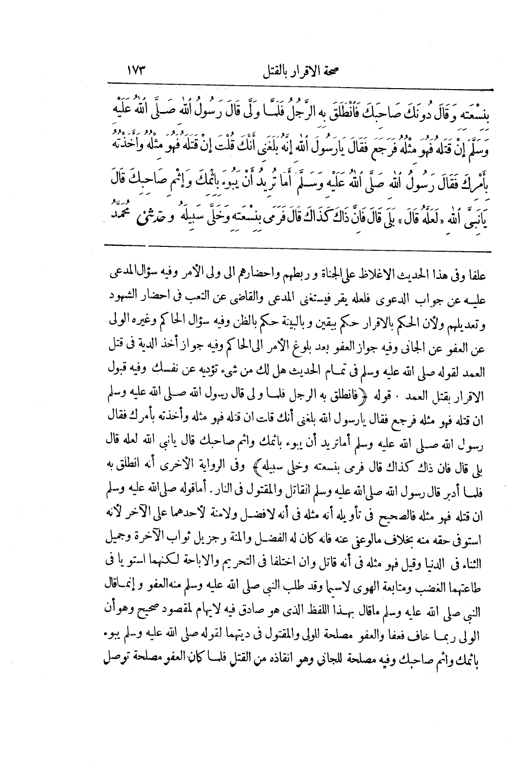 عَلَفًا وَفِي هَذَا الْحَدِيثِ الْإِغْلَاظُ عَلَى الْجُنَاةِ وَرَبْطِهِمْ وَإِحْضَارِهِمْ إِلَى وَلِيِّ الْأَمْرِ وَفِيهِ سُؤَالُ الْمُدَّعَى عَلَيْهِ عَنْ جَوَابِ الدَّعْوَى فَلَعَلَّهُ يُقِرُّ فَيَسْتَغْنِي الْمُدَّعِي وَالْقَاضِي عَنِ التَّعَبِ فِي إِحْضَارِ الشُّهُودِ وَتَعْدِيلِهِمْ وَلِأَنَّ الْحُكْمَ بِالْإِقْرَارِ حُكْمٌ بِيَقِينٍ وَبِالْبَيِّنَةِ حُكْمٌ بِالظَّنِّ وَفِيهِ سُؤَالُ الْحَاكِمِ وَغَيْرِهِ الْوَلِيَّ عَنِ الْعَفْوِ عَنِ الْجَانِي وَفِيهِ جَوَازُ الْعَفْوِ بَعْدَ بُلُوغِ الْأَمْرِ إِلَى الْحَاكِمِ وَفِيهِ جَوَازُ أَخْذِ الدِّيَةِ فِي قَتْلِ الْعَمْدِ لِقَوْلِهِ صَلَّى اللَّهُ عَلَيْهِ وَسَلَّمَ فِي تَمَامِ الْحَدِيثِ هَلْ لَكَ مِنْ شَيْءٍ تُؤَدِّيهِ عَنْ نَفْسِكَ وَفِيهِ قَبُولُ الْإِقْرَارِ بِقَتْلِ الْعَمْدِ قَوْلُهُ (فَانْطَلَقَ بِهِ الرَّجُلُ فَلَمَّا وَلَّى قَالَ رَسُولُ اللَّهِ صَلَّى اللَّهُ عَلَيْهِ وَسَلَّمَ إِنْ قَتَلَهُ فَهُوَ مِثْلُهُ فَرَجَعَ فَقَالَ يَا رَسُولَ اللَّهِ بَلَغَنِي أَنَّكَ قُلْتَ إِنْ قَتَلَهُ فَهُوَ مِثْلُهُ وَأَخَذْتُهُ بِأَمْرِكَ فَقَالَ رَسُولُ اللَّهِ صَلَّى اللَّهُ عَلَيْهِ وَسَلَّمَ أَمَا تُرِيدُ أَنْ يَبُوءَ بِإِثْمِكَ وَإِثْمِ صَاحِبِكَ قَالَ يَا نَبِيَّ اللَّهِ لَعَلَّهُ قَالَ بَلَى قَالَ فَإِنَّ ذَاكَ كَذَاكَ قَالَ فَرَمَى بِنِسْعَتِهِ وَخَلَّى سَبِيلَهُ) وَفِي الرِّوَايَةِ الْأُخْرَى إِنَّهُ انْطَلَقَ بِهِ فَلَمَّا أَدْبَرَ قَالَ رَسُولُ اللَّهِ صَلَّى اللَّهُ عَلَيْهِ وَسَلَّمَ الْقَاتِلُ وَالْمَقْتُولُ فِي النَّارِ أَمَّا قَوْلُهُ صَلَّى اللَّهُ عَلَيْهِ وَسَلَّمَ إِنْ قَتَلَهُ فَهُوَ مِثْلُهُ فَالصَّحِيحُ فِي تَأْوِيلِهِ أَنَّهُ مِثْلُهُ فِي أَنَّهُ لَا فَضْلَ وَلَا مِنَّةً لِأَحَدِهِمَا عَلَى الْآخَرِ لِأَنَّهُ اسْتَوْفَى حَقَّهُ منه بخلاف ما لو عفى عَنْهُ فَإِنَّهُ كَانَ لَهُ الْفَضْلُ وَالْمِنَّةُ وَجَزِيلُ ثَوَابِ الْآخِرَةِ وَجَمِيلُ الثَّنَاءِ فِي الدُّنْيَا وَقِيلَ فَهُوَ مِثْلُهُ فِي أَنَّهُ قَاتِلٌ وَإِنِ اخْتَلَفَا في التحريم والإباحة لكنهما استويا في طاعتهما الْغَضَبَ وَمُتَابَعَةِ الْهَوَى لَا سِيَّمَا وَقَدْ طَلَبَ النَّبِيُّ صَلَّى اللَّهُ عَلَيْهِ وَسَلَّمَ مِنْهُ الْعَفْوَ وَإِنَّمَا قَالَ النَّبِيُّ صَلَّى اللَّهُ عَلَيْهِ وَسَلَّمَ مَا قَالَ بِهَذَا اللَّفْظِ الَّذِي هُوَ صَادِقٌ فيه لا يهام لمقصود صَحِيحٍ وَهُوَ أَنَّ الْوَلِيَّ رُبَّمَا خَافَ فَعَفَا وَالْعَفْوُ مَصْلَحَةٌ لِلْوَلِيِّ وَالْمَقْتُولِ فِي دِيَتِهِمَا لِقَوْلِهِ صَلَّى اللَّهُ عَلَيْهِ وَسَلَّمَ يَبُوءُ بِإِثْمِكَ وَإِثْمِ صَاحِبِكَ وَفِيهِ مَصْلَحَةٌ لِلْجَانِي وَهُوَ إِنْقَاذُهُ مِنَ الْقَتْلِ فَلَمَّا كَانَ الْعَفْوُ مَصْلَحَةً تَوَصَّلَ