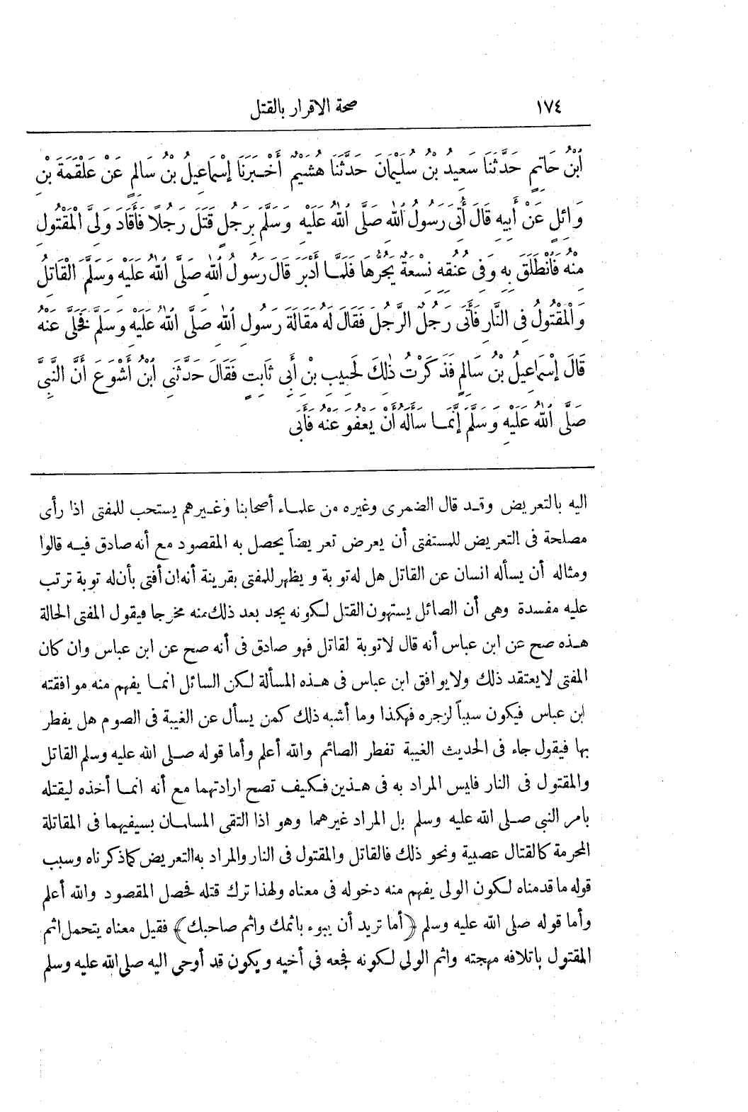 إِلَيْهِ بِالتَّعْرِيضِ وَقَدْ قَالَ الضَّمْرِيُّ وَغَيْرُهُ مِنْ عُلَمَاءِ أَصْحَابِنَا وَغَيْرِهِمْ يُسْتَحَبُّ لِلْمُفْتِي إِذَا رَأَى مَصْلَحَةً فِي التَّعْرِيضِ لِلْمُسْتَفْتِي أَنْ يُعَرِّضَ تَعْرِيضًا يَحْصُلُ بِهِ الْمَقْصُودُ مَعَ أَنَّهُ صَادِقٌ فِيهِ قَالُوا وَمِثَالُهُ أَنْ يَسْأَلَهُ إِنْسَانٌ عَنِ الْقَاتِلِ هَلْ لَهُ تَوْبَةٌ وَيَظْهَرُ لِلْمُفْتِي بِقَرِينَةٍ أَنَّهُ إِنْ أَفْتَى بِأَنَّ لَهُ تَوْبَةً تَرَتَّبَ عَلَيْهِ مَفْسَدَةٌ وَهِيَ أَنَّ الصَّائِلَ يَسْتَهْوِنُ الْقَتْلَ لِكَوْنِهِ يَجِدُ بَعْدَ ذَلِكَ مِنْهُ مَخْرَجًا فَيَقُولُ الْمُفْتِي الحالة هذه صح عن بن عَبَّاسٍ أَنَّهُ قَالَ لَا تَوْبَةَ لِقَاتِلٍ فَهُوَ صادق في أنه صح عن بن عَبَّاسٍ وَإِنْ كَانَ الْمُفْتِي لَا يَعْتَقِدُ ذَلِكَ ولا يوافق بن عَبَّاسٍ فِي هَذِهِ الْمَسْأَلَةِ لَكِنَّ السَّائِلَ إِنَّمَا يفهم منه موافقته بن عَبَّاسٍ فَيَكُونُ سَبَبًا لِزَجْرِهِ فَهَكَذَا وَمَا أَشْبَهَ ذَلِكَ كَمَنْ يَسْأَلُ عَنِ الْغِيبَةِ فِي الصَّوْمِ هل يُفْطِرُ بِهَا فَيَقُولُ جَاءَ فِي الْحَدِيثِ الْغِيبَةُ تُفْطِرُ الصَّائِمَ وَاللَّهُ أَعْلَمُ وَأَمَّا قَوْلُهُ صَلَّى اللَّهُ عَلَيْهِ وَسَلَّمَ الْقَاتِلُ وَالْمَقْتُولُ فِي النَّارِ فَلَيْسَ الْمُرَادُ بِهِ فِي هَذَيْنِ فَكَيْفَ تَصِحُّ إِرَادَتُهُمَا مَعَ أَنَّهُ إِنَّمَا أَخَذَهُ لِيَقْتُلَهُ بِأَمْرِ النَّبِيِّ صَلَّى اللَّهُ عَلَيْهِ وَسَلَّمَ بَلِ الْمُرَادُ غَيْرُهُمَا وَهُوَ إِذَا الْتَقَى الْمُسْلِمَانِ بِسَيْفَيْهِمَا فِي الْمُقَاتَلَةِ الْمُحَرَّمَةِ كَالْقِتَالِ عَصَبِيَّةً وَنَحْوِ ذَلِكَ فَالْقَاتِلُ وَالْمَقْتُولُ فِي النَّارِ وَالْمُرَادُ بِهِ التَّعْرِيضُ كَمَا ذكرناه وسبب قوله ما قدمناه لكون الْوَلِيِّ يَفْهَمُ مِنْهُ دُخُولَهُ فِي مَعْنَاهُ وَلِهَذَا تَرَكَ قَتْلَهُ فَحَصَلَ الْمَقْصُودُ وَاللَّهُ أَعْلَمُ وَأَمَّا قَوْلُهُ صَلَّى اللَّهُ عَلَيْهِ وَسَلَّمَ (أَمَا تُرِيدُ أَنْ يَبُوءَ بِإِثْمِكَ وَإِثْمِ صَاحِبِكَ) فَقِيلَ مَعْنَاهُ يتحمل إثم المقتول باتلافه مهمته وَإِثْمَ الْوَلِيِّ لِكَوْنِهِ فَجَعَهُ فِي أَخِيهِ وَيَكُونُ قد أوحى إليه ص