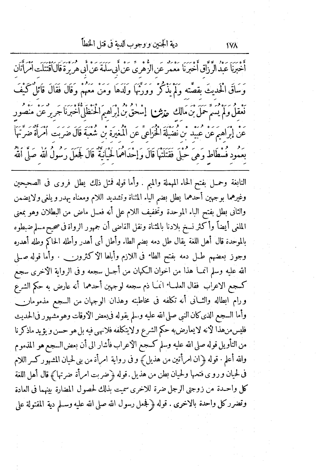 النَّابِغَةِ وَحَمَلٌ بِفَتْحِ الْحَاءِ الْمُهْمَلَةِ وَالْمِيمِ وَأَمَّا قَوْلُهُ فَمِثْلُ ذَلِكَ يُطَلُّ فَرُوِيَ فِي الصَّحِيحَيْنِ وَغَيْرِهِمَا بِوَجْهَيْنِ أَحَدُهُمَا يُطَلُّ بِضَمِّ الْيَاءِ الْمُثَنَّاةِ وَتَشْدِيدِ اللَّامِ وَمَعْنَاهُ يُهْدَرُ وَيُلْغَى وَلَا يُضْمَنُ وَالثَّانِي بَطَلَ بِفَتْحِ الْبَاءِ الْمُوَحَّدَةِ وَتَخْفِيفِ اللَّامِ عَلَى أَنَّهُ فِعْلٌ مَاضٍ مِنَ الْبُطْلَانِ وَهُوَ بِمَعْنَى الْمُلْغَى أَيْضًا وَأَكْثَرُ نُسَخِ بِلَادِنَا بِالْمُثَنَّاةِ وَنَقَلَ الْقَاضِي أَنَّ جُمْهُورَ الرُّوَاةِ فِي صَحِيحِ مُسْلِمٍ ضَبَطُوهُ بِالْمُوَحَّدَةِ قَالَ أَهْلُ اللُّغَةِ يُقَالُ طُلَّ دَمُهُ بِضَمِّ الطَّاءِ وَأَطَلَّ أَيْ أَهْدَرَ وَأَطَلَّهُ الْحَاكِمُ وَطَلَّهُ أَهْدَرَهُ وَجَوَّزَ بَعْضُهُمْ طَلَّ دَمُهُ بِفَتْحِ الطَّاءِ فِي اللَّازِمِ وَأَبَاهَا الْأَكْثَرُونَ وَأَمَّا قَوْلُهُ صَلَّى اللَّهُ عَلَيْهِ وَسَلَّمَ إِنَّمَا هَذَا مِنْ إِخْوَانِ الْكُهَّانِ مِنْ أَجْلِ سَجْعِهِ وَفِي الرِّوَايَةِ الْأُخْرَى سَجْعٌ كَسَجْعِ الْأَعْرَابِ فَقَالَ الْعُلَمَاءُ إِنَّمَا ذَمَّ سَجْعَهُ لِوَجْهَيْنِ أَحَدُهُمَا أَنَّهُ عَارَضَ بِهِ حُكْمَ الشَّرْعِ وَرَامَ إِبْطَالَهُ وَالثَّانِي أَنَّهُ تَكَلَّفَهُ فِي مُخَاطَبَتِهِ وَهَذَانِ الْوَجْهَانِ مِنَ السَّجْعِ مَذْمُومَانِ وَأَمَّا السَّجْعُ الَّذِي كَانَ النَّبِيُّ صَلَّى اللَّهُ عَلَيْهِ وَسَلَّمَ يَقُولُهُ فِي بَعْضِ الْأَوْقَاتِ وَهُوَ مَشْهُورٌ فِي الْحَدِيثِ فَلَيْسَ مِنْ هَذَا لِأَنَّهُ لَا يُعَارِضُ بِهِ حُكْمَ الشَّرْعِ وَلَا يَتَكَلَّفُهُ فَلَا نَهْيَ فِيهِ بَلْ هُوَ حَسَنٌ وَيُؤَيِّدُ مَا ذَكَرْنَا مِنَ التَّأْوِيلِ قَوْلُهُ صَلَّى اللَّهُ عَلَيْهِ وَسَلَّمَ كَسَجْعِ الْأَعْرَابِ فَأَشَارَ إِلَى أَنَّ بَعْضَ السَّجْعِ هُوَ الْمَذْمُومُ وَاللَّهُ أعلم (قَوْلُهُ