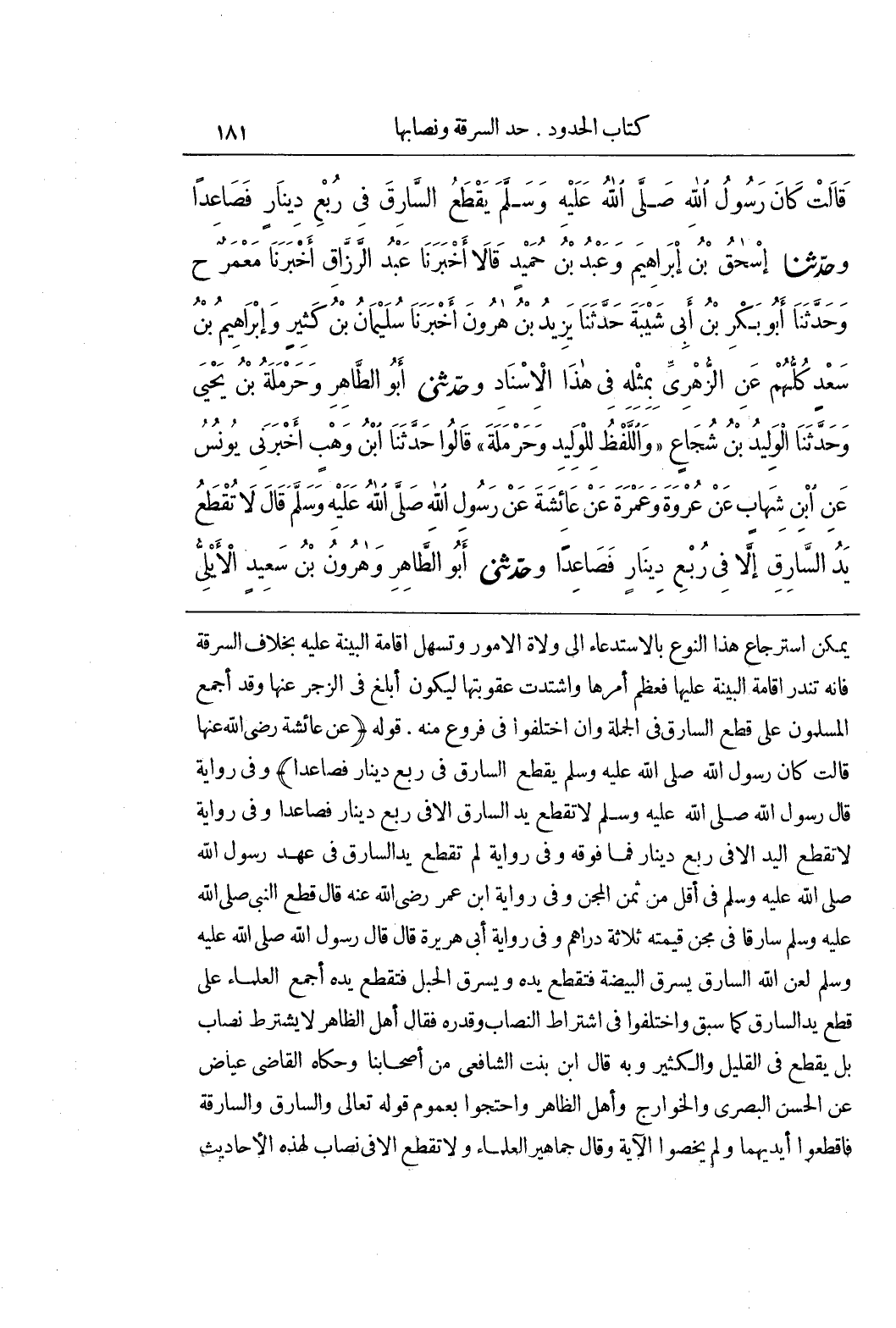 [1684] قَالَتْ كَانَ رَسُولُ اللَّهِ صَلَّى اللَّهُ عَلَيْهِ وَسَلَّمَ يَقْطَعُ السَّارِقَ فِي رُبْعِ دِينَارٍ فَصَاعِدًا) وَفِي رِوَايَةٍ قَالَ رَسُولُ اللَّهِ صَلَّى اللَّهُ عَلَيْهِ وَسَلَّمَ لَا تُقْطَعُ يَدُ السَّارِقِ إِلَّا فِي رُبْعِ دِينَارٍ فَصَاعِدًا وَفِي رِوَايَةٍ لَا تُقْطَعُ الْيَدُ إِلَّا فِي رُبْعِ دِينَارٍ فَمَا فَوْقَهُ وَفِي رِوَايَةٍ لَمْ تُقْطَعْ يَدُ السَّارِقِ فِي عَهْدِ رَسُولِ اللَّهِ صَلَّى اللَّهُ عَلَيْهِ وَسَلَّمَ في أقل من ثمن المجن وفي رواية بن عُمَرَ رَضِيَ اللَّهُ عَنْهُ قَالَ قَطَعَ النَّبِيُّ صَلَّى اللَّهُ عَلَيْهِ وَسَلَّمَ سَارِقًا فِي مِجَنٍّ قِيمَتُهُ ثَلَاثَةُ دَرَاهِمَ وَفِي رِوَايَةِ أَبِي هُرَيْرَةَ قَالَ قَالَ رَسُولُ اللَّهِ صَلَّى اللَّهُ عَلَيْهِ وَسَلَّمَ لَعَنَ اللَّهُ السَّارِقَ يَسْرِقُ الْبَيْضَةَ فَتُقْطَعُ يَدُهُ وَيَسْرِقُ الْحَبْلَ فَتُقْطَعُ يَدُهُ أَجْمَعَ الْعُلَمَاءُ عَلَى قَطْعِ يَدِ السَّارِقِ كَمَا سَبَقَ وَاخْتَلَفُوا فِي اشْتِرَاطِ النِّصَابِ وَقَدْرِهِ فَقَالَ أَهْلُ الظَّاهِرِ لَا يُشْتَرَطُ نِصَابٌ بَلْ يُقْطَعُ فِي الْقَلِيلِ والكثير وبه قال بن بِنْتِ الشَّافِعِيِّ مِنْ أَصْحَابِنَا وَحَكَاهُ الْقَاضِي عِيَاضٌ عَنِ الْحَسَنِ الْبَصْرِيِّ وَالْخَوَارِجِ وَأَهْلِ الظَّاهِرِ وَاحْتَجُّوا بِعُمُومِ قَوْلِهِ تَعَالَى وَالسَّارِقُ وَالسَّارِقَةُ فَاقْطَعُوا أَيْدِيَهُمَا وَلَمْ يَخُصُّوا الْآيَةَ وَقَالَ جَمَاهِيرُ الْعُلَمَاءِ وَلَا تُقْطَعُ إِلَّا فِي نِصَابٍ لِهَذِهِ الْأَحَادِيثِ