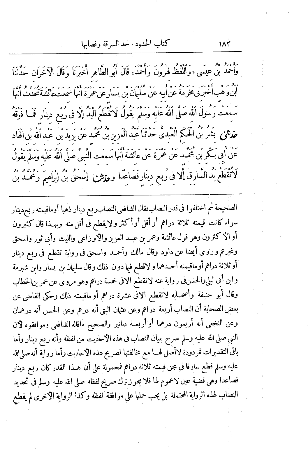 الصَّحِيحَةِ ثُمَّ اخْتَلَفُوا فِي قَدْرِ النِّصَابِ فَقَالَ الشَّافِعِيُّ النِّصَابُ رُبْعُ دِينَارٍ ذَهَبًا أَوْ مَا قِيمَتُهُ رُبْعُ دِينَارٍ سَوَاءٌ كَانَتْ قِيمَتُهُ ثَلَاثَةَ دَرَاهِمَ أَوْ أَقَلَّ أَوْ أَكْثَرَ وَلَا يُقْطَعُ فِي أَقَلَّ مِنْهُ وَبِهَذَا قَالَ كَثِيرُونَ أَوِ الْأَكْثَرُونَ وَهُوَ قَوْلُ عَائِشَةَ وَعُمَرَ بْنِ عَبْدِ الْعَزِيزِ وَالْأَوْزَاعِيِّ وَاللَّيْثِ وَأَبِي ثَوْرٍ وَإِسْحَاقَ وَغَيْرِهِمْ وَرُوِيَ أَيْضًا عَنْ دَاوُدَ وَقَالَ مَالِكٌ وَأَحْمَدُ وَإِسْحَاقُ فِي رِوَايَةٍ تُقْطَعُ فِي رُبْعِ دِينَارٍ أَوْ ثَلَاثَةِ دَرَاهِمَ أَوْ مَا قِيمَتُهُ أَحَدُهُمَا ولا قطع فِيمَا دُونَ ذَلِكَ وَقَالَ سُلَيْمَانُ بْنُ يَسَارٍ وبن شبرمة وبن أَبِي لَيْلَى وَالْحَسَنُ فِي رِوَايَةٍ عَنْهُ لَا تُقْطَعُ إِلَّا فِي خَمْسَةِ دَرَاهِمَ وَهُوَ مَرْوِيٌّ عَنْ عُمَرَ بْنِ الْخَطَّابِ وَقَالَ أَبُو حَنِيفَةَ وَأَصْحَابُهُ لَا تُقْطَعُ إِلَّا فِي عَشَرَةِ دَرَاهِمَ أو ماقيمته ذَلِكَ وَحَكَى الْقَاضِي عَنْ بَعْضِ الصَّحَابَةِ أَنَّ النِّصَابَ أَرْبَعَةُ دَرَاهِمَ وَعَنْ عُثْمَانَ الْبَتِّيِّ أَنَّهُ دِرْهَمٌ وَعَنِ الْحَسَنِ أَنَّهُ دِرْهَمَانِ وَعَنِ النَّخَعِيِّ أَنَّهُ أَرْبَعُونَ دِرْهَمًا أَوْ أَرْبَعَةُ دَنَانِيرَ وَالصَّحِيحُ مَا قَالَهُ الشَّافِعِيُّ وَمُوَافِقُوهُ لِأَنَّ النَّبِيَّ صَلَّى اللَّهُ عَلَيْهِ وَسَلَّمَ صَرَّحَ بِبَيَانِ النِّصَابِ فِي هَذِهِ الْأَحَادِيثِ مِنْ لَفْظِهِ وَأَنَّهُ رُبْعُ دِينَارٍ وَأَمَّا بَاقِي التَّقْدِيرَاتِ فَمَرْدُودَةٌ لَا أَصْلَ لَهَا مَعَ مُخَالَفَتِهَا لِصَرِيحِ هَذِهِ الْأَحَادِيثِ وَأَمَّا رِوَايَةُ أَنَّهُ صَلَّى اللَّهُ عَلَيْهِ وَسَلَّمَ قَطَعَ سَارِقًا فِي مِجَنٍّ قِيمَتُهُ ثَلَاثَةُ دَرَاهِمَ فَمَحْمُولَةٌ عَلَى أَنَّ هَذَا الْقَدْرَ كَانَ رُبْعَ دِينَارٍ فَصَاعِدًا وَهِيَ قَضِيَّةُ عَيْنٍ لَا عُمُومَ لَهَا فَلَا يَجُوزُ تَرْكُ صَرِيحِ لَفْظِهِ صَلَّى اللَّهُ عَلَيْهِ وَسَلَّمَ فِي تَحْدِيدِ النِّصَابِ لِهَذِهِ الرِّوَايَةِ الْمُحْتَمَلَةِ بَلْ يَجِبُ حَمْلُهَا عَلَى مُوَافَقَةِ لَفْظِهِ وَكَذَا الرِّوَايَةُ الْأُخْرَى لَمْ يَقْطَعْ
