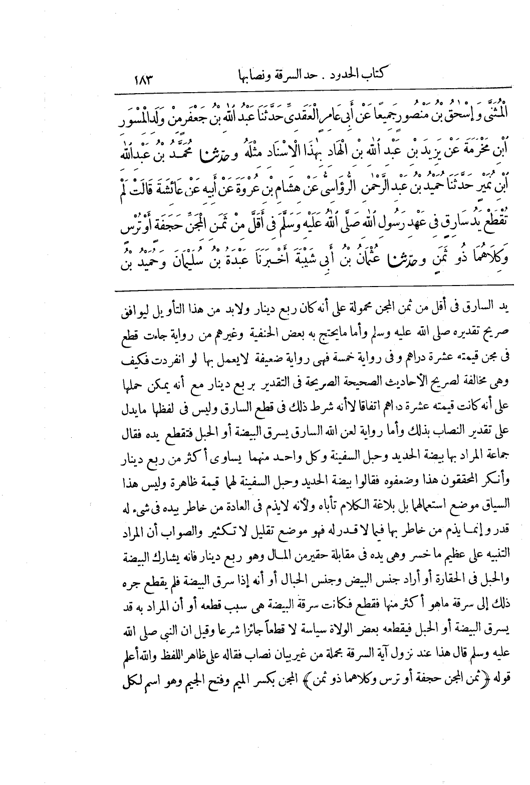 يَدَ السَّارِقِ فِي أَقَلَّ مِنْ ثَمَنِ الْمِجَنِّ مَحْمُولَةٌ عَلَى أَنَّهُ كَانَ رُبْعَ دِينَارٍ وَلَا بُدَّ مِنْ هَذَا التَّأْوِيلِ لِيُوَافِقَ صَرِيحَ تَقْدِيرِهِ صَلَّى اللَّهُ عَلَيْهِ وَسَلَّمَ وَأَمَّا مَا يَحْتَجُّ بِهِ بَعْضُ الْحَنَفِيَّةِ وَغَيْرُهُمْ مِنْ رِوَايَةٍ جَاءَتْ قَطَعَ فِي مِجَنٍّ قِيمَتُهُ عَشَرَةُ دَرَاهِمَ وَفِي رِوَايَةٍ خَمْسَةُ فَهِيَ رِوَايَةٌ ضَعِيفَةٌ لَا يُعْمَلُ بِهَا لَوِ انْفَرَدَتْ فَكَيْفَ وَهِيَ مُخَالِفَةٌ لِصَرِيحِ الْأَحَادِيثِ الصَّحِيحَةِ الصَّرِيحَةِ فِي التَّقْدِيرِ بِرُبْعِ دِينَارٍ مَعَ أَنَّهُ يُمْكِنُ حَمْلُهَا عَلَى أَنَّهُ كَانَتْ قِيمَتُهُ عَشَرَةَ دَرَاهِمَ اتِّفَاقًا لَا أَنَّهُ شَرَطَ ذَلِكَ فِي قَطْعِ السَّارِقِ وَلَيْسَ فِي لَفْظِهَا مَا يَدُلُّ عَلَى تَقْدِيرِ النِّصَابِ بِذَلِكَ وَأَمَّا رِوَايَةُ لَعَنَ اللَّهُ السَّارِقَ يَسْرِقُ الْبَيْضَةَ أَوِ الْحَبْلَ فَتُقْطَعُ يَدُهُ فَقَالَ جَمَاعَةٌ الْمُرَادُ بِهَا بَيْضَةُ الْحَدِيدِ وَحَبْلُ السَّفِينَةِ وَكُلُّ وَاحِدٍ مِنْهُمَا يُسَاوِي أَكْثَرَ مِنْ رُبْعِ دِينَارٍ وَأَنْكَرَ الْمُحَقِّقُونَ هَذَا وَضَعَّفُوهُ فَقَالُوا بَيْضَةُ الْحَدِيدِ وَحَبْلُ السَّفِينَةِ لَهُمَا قِيمَةٌ ظَاهِرَةٌ وَلَيْسَ هَذَا السِّيَاقُ مَوْضِعَ اسْتِعْمَالِهِمَا بَلْ بَلَاغَةُ الْكَلَامِ تَأْبَاهُ وَلِأَنَّهُ لَا يُذَمُّ فِي الْعَادَةِ مَنْ خَاطَرَ بِيَدِهِ فِي شَيْءٍ لَهُ قَدْرٌ وَإِنَّمَا يُذَمُّ مَنْ خَاطَرَ بِهَا فِيمَا لَا قَدْرَ لَهُ فَهُوَ مَوْضِعُ تَقْلِيلٍ لَا تَكْثِيرٍ وَالصَّوَابُ أَنَّ الْمُرَادَ التَّنْبِيهُ عَلَى عَظِيمِ مَا خَسِرَ وَهِيَ يَدُهُ فِي مُقَابَلَةِ حَقِيرٍ مِنَ الْمَالِ وَهُوَ رُبْعُ دِينَارٍ فَإِنَّهُ يُشَارِكُ الْبَيْضَةَ وَالْحَبْلَ فِي الْحَقَارَةِ أَوْ أَرَادَ جِنْسَ الْبَيْضِ وَجِنْسَ الْحِبَالِ أَوْ أَنَّهُ إِذَا سَرَقَ الْبَيْضَةَ فَلَمْ يُقْطَعْ جَرَّهُ ذَلِكَ إِلَى سَرِقَةِ مَا هُوَ أَكْثَرُ مِنْهَا فَقُطِعَ فَكَانَتْ سَرِقَةُ الْبَيْضَةِ هِيَ سَبَبُ قَطْعِهِ أَوْ أن المراد به قد يسرق البيضة أوالحبل فَيَقْطَعُهُ بَعْضُ الْوُلَاةِ سِيَاسَةً لَا قَطْعًا جَائِزًا شَرْعًا وَقِيلَ أَنَّ النَّبِيَّ صَلَّى اللَّهُ عَلَيْهِ وَسَلَّمَ قَالَ هَذَا عِنْدَ نُزُولِ آيَةِ السَّرِقَةِ مُجْمَلَةً مِنْ غَيْرِ بَيَانِ نِصَابٍ فَقَالَهُ عَلَى ظَاهِرِ اللَّفْظِ وَاللَّهُ أَعْلَمُ