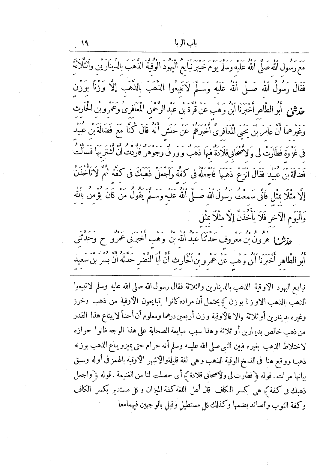 نُبَايِعُ الْيَهُودَ الْأُوقِيَّةَ الذَّهَبَ بِالدِّينَارَيْنِ وَالثَّلَاثَةِ فَقَالَ رَسُولُ اللَّهِ صَلَّى اللَّهُ عَلَيْهِ وَسَلَّمَ (لَا تَبِيعُوا الذَّهَبَ بِالذَّهَبِ إِلَّا وَزْنًا بِوَزْنٍ) يُحْتَمَلُ أَنَّ مُرَادَهُ كَانُوا يَتَبَايَعُونَ الْأُوقِيَّةَ مِنْ ذَهَبٍ وَخَرَزٍ وَغَيْرِهِ بِدِينَارَيْنِ أَوْ ثَلَاثَةٍ وَإِلَّا فَالْأُوقِيَّةُ وَزْنُ أَرْبَعِينَ دِرْهَمًا وَمَعْلُومٌ أَنَّ أَحَدًا لَا يَبْتَاعُ هَذَا الْقَدْرَ مِنْ ذَهَبٍ خَالِصٍ بِدِينَارَيْنِ أَوْ ثَلَاثَةٍ وَهَذَا سَبَبُ مُبَايَعَةِ الصَّحَابَةِ عَلَى هَذَا الْوَجْهِ ظَنُّوا جَوَازَهُ لِاخْتِلَاطِ الذَّهَبِ بِغَيْرِهِ فَبَيَّنَ النَّبِيُّ صَلَّى اللَّهُ عَلَيْهِ وَسَلَّمَ أَنَّهُ حرام حتى يميز وَيُبَاعَ الذَّهَبُ بِوَزْنِهِ ذَهَبًا وَوَقَعَ هُنَا فِي النُّسَخِ الْوُقِيَّةَ الذَّهَبَ وَهِيَ لُغَةٌ قَلِيلَةٌ وَالْأَشْهُرُ الْأُوقِيَّةُ بِالْهَمْزِ فِي أَوَّلِهِ وَسَبَقَ بَيَانُهَا مَرَّاتٍ قَوْلُهُ (فَطَارَتْ لِي وَلِأَصْحَابِي قِلَادَةٌ) أَيْ حَصَلَتْ لَنَا مِنَ الْغَنِيمَةِ قَوْلُهُ (وَاجْعَلْ ذَهَبَكَ فِي كِفَّةٍ) هِيَ بِكَسْرِ الْكَافِ قَالَ أَهْلُ اللُّغَةِ كِفَّةُ الْمِيزَانِ وَكُلُّ مُسْتَدِيرٍ بِكَسْرِ الْكَافِ وَكُفَّةُ الثَّوْبِ وَالصَّائِدِ بِضَمِّهَا وَكَذَلِكَ كُلُّ مُسْتَطِيلٍ وَقِيلَ بالوجهين فيهما معا