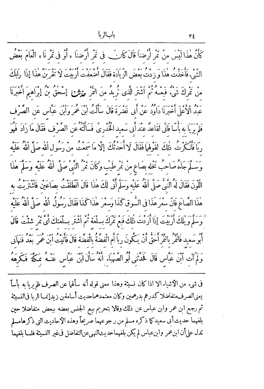 فِي شَيْءٍ مِنَ الْأَشْيَاءِ إِلَّا إِذَا كَانَ نَسِيئَةً وَهَذَا مَعْنَى قَوْلِهِ إِنَّهُ سَأَلَهُمَا عَنِ الصَّرْفِ فَلَمْ يَرَيَا بِهِ بَأْسًا يَعْنِي الصَّرْفَ مُتَفَاضِلًا كَدِرْهَمٍ بِدِرْهَمَيْنِ وَكَانَ مُعْتَمَدَهُمَا حَدِيثُ أُسَامَةَ بْنِ زَيْدٍ إِنَّمَا الرِّبَا فِي النَّسِيئَةِ ثُمَّ رجع بن عمر وبن عَبَّاسٍ عَنْ ذَلِكَ وَقَالَا بِتَحْرِيمِ بَيْعِ الْجِنْسِ بَعْضِهِ بِبَعْضٍ مُتَفَاضِلًا حِينَ بَلَغَهُمَا حَدِيثُ أَبِي سَعِيدٍ كَمَا ذَكَرَهُ مُسْلِمٌ مِنْ رُجُوعِهِمَا صَرِيحًا وَهَذِهِ الْأَحَادِيثُ الَّتِي ذَكَرَهَا مُسْلِمٌ تَدُلُّ عَلَى أن بن عمر وبن عَبَّاسٍ لَمْ يَكُنْ بَلَغَهُمَا حَدِيثُ النَّهْيِ عَنِ التَّفَاضُلِ فِي غَيْرِ النَّسِيئَةِ فَلَمَّا بَلَغَهُمَا
