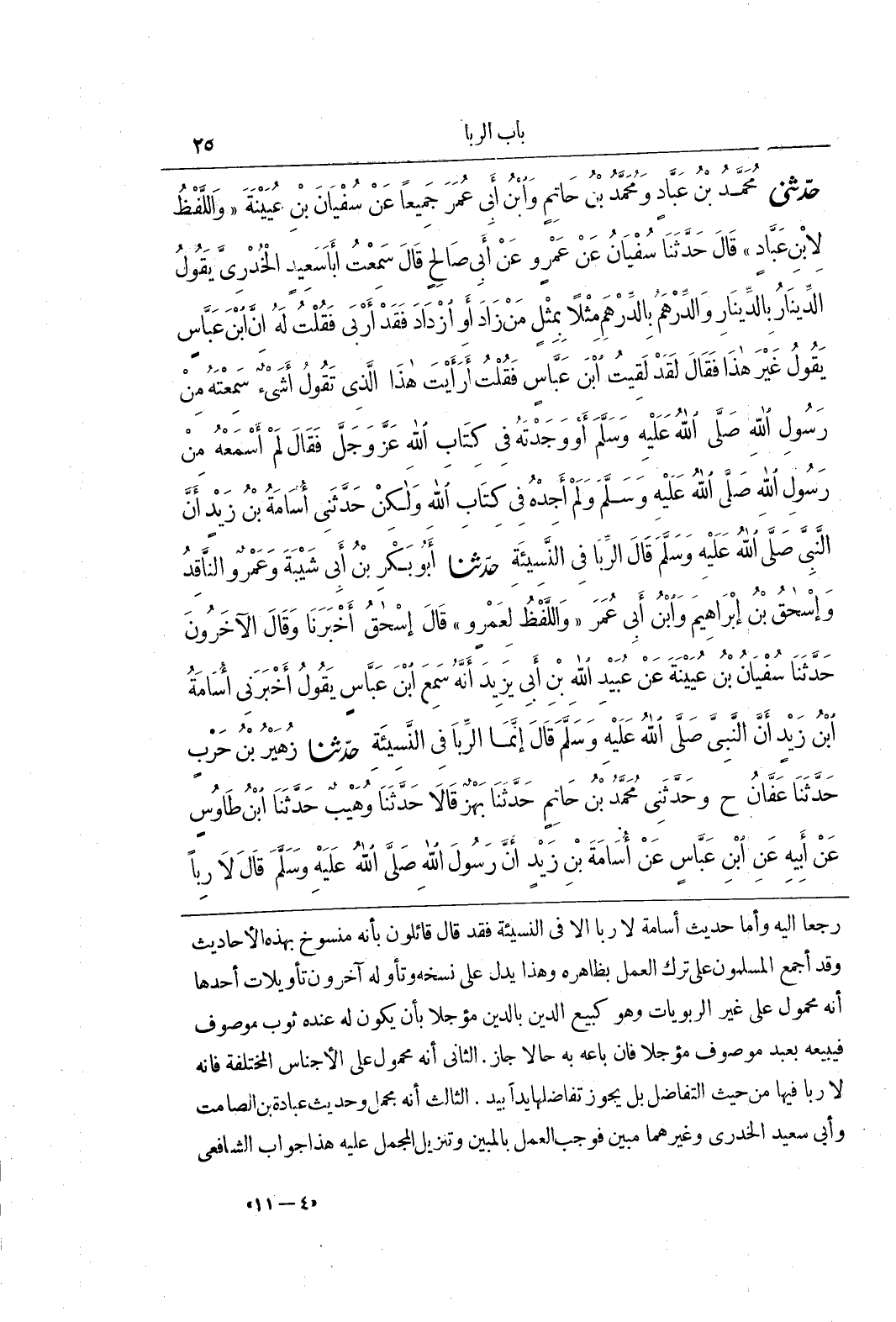 رَجَعَا إِلَيْهِ وَأَمَّا حَدِيثُ أُسَامَةَ لَا رِبًا إِلَّا فِي النَّسِيئَةِ فَقَدْ قَالَ قَائِلُونَ بِأَنَّهُ مَنْسُوخٌ بِهَذِهِ الْأَحَادِيثِ وَقَدْ أَجْمَعَ الْمُسْلِمُونَ عَلَى تَرْكِ الْعَمَلِ بِظَاهِرِهِ وَهَذَا يَدُلُّ عَلَى نَسْخِهِ وَتَأَوَّلَهُ آخَرُونَ تَأْوِيلَاتٍ أَحَدُهَا أَنَّهُ مَحْمُولٌ عَلَى غَيْرِ الرِّبَوِيَّاتِ وَهُوَ كَبَيْعِ الدَّيْنِ بِالدَّيْنِ مُؤَجَّلًا بِأَنْ يَكُونَ لَهُ عِنْدَهُ ثَوْبٌ مَوْصُوفٌ فَيَبِيعُهُ بِعَبْدٍ مَوْصُوفٍ مُؤَجَّلًا فَإِنْ بَاعَهُ بِهِ حَالًّا جَازَ الثَّانِي أَنَّهُ مَحْمُولٌ عَلَى الْأَجْنَاسِ الْمُخْتَلِفَةِ فَإِنَّهُ لَا رِبًا فِيهَا مِنْ حَيْثُ التَّفَاضُلِ بَلْ يَجُوزُ تَفَاضُلُهَا يَدًا بِيَدٍ الثَّالِثُ أَنَّهُ مُجْمَلٌ وَحَدِيثُ عُبَادَةَ بْنِ الصَّامِتِ وَأَبِي سَعِيدٍ الْخُدْرِيِّ وَغَيْرِهِمَا مُبَيِّنٌ فَوَجَبَ الْعَمَلُ بِالْمُبَيِّنِ وَتَنْزِيلُ الْمُجْمَلِ عَلَيْهِ هَذَا جَوَابُ الشَّافِعِيِّ