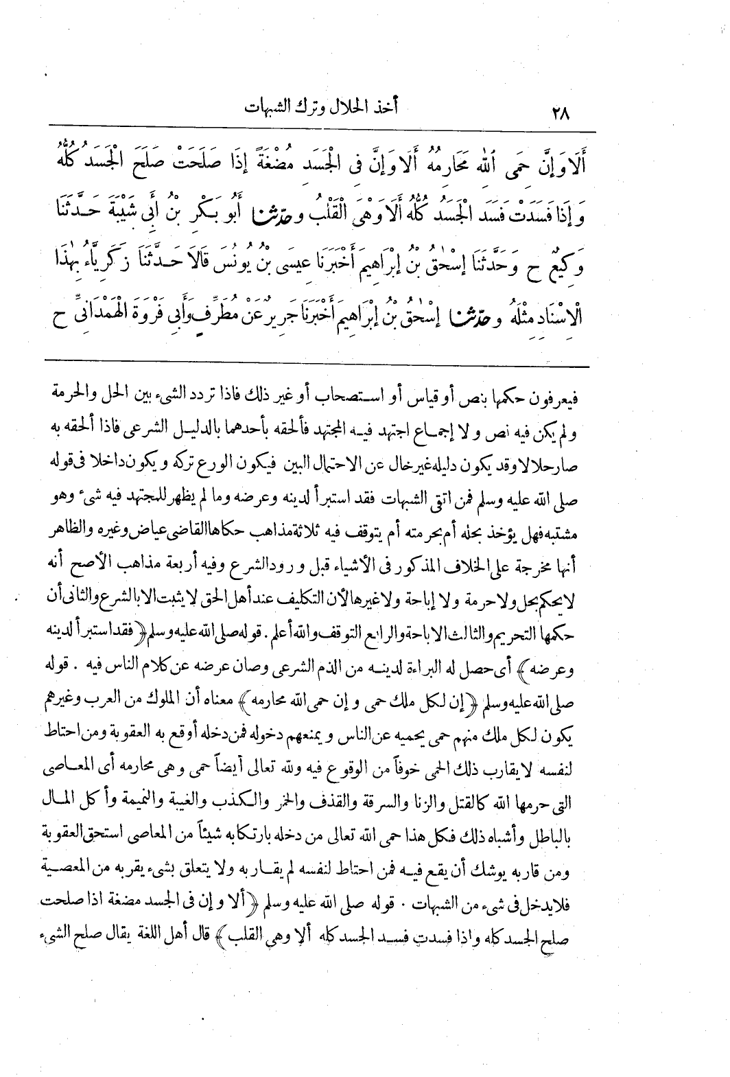 فَيَعْرِفُونَ حُكْمَهَا بِنَصٍّ أَوْ قِيَاسٍ أَوِ اسْتِصْحَابٍ أَوْ غَيْرِ ذَلِكَ فَإِذَا تَرَدَّدَ الشَّيْءُ بَيْنَ الْحِلِّ وَالْحُرْمَةِ وَلَمْ يَكُنْ فِيهِ نَصٌّ وَلَا إِجْمَاعٌ اجْتَهَدَ فِيهِ الْمُجْتَهِدُ فَأَلْحَقَهُ بِأَحَدِهِمَا بِالدَّلِيلِ الشرعي فإذا الحقه به صار حلالا وقد يكون دليله غَيْرَ خَالٍ عَنِ الِاحْتِمَالِ الْبَيِّنِ فَيَكُونُ الْوَرَعُ تَرْكَهُ وَيَكُونُ دَاخِلًا فِي قَوْلِهِ صَلَّى اللَّهُ عَلَيْهِ وَسَلَّمَ فَمَنِ اتَّقَى الشُّبُهَاتِ فَقَدِ اسْتَبْرَأَ لِدِينِهِ وَعِرْضِهِ وَمَا لَمْ يَظْهَرْ لِلْمُجْتَهِدِ فِيهِ شَيْءٌ وَهُوَ مُشْتَبَهٌ فَهَلْ يُؤْخَذُ بِحِلِّهِ أَمْ بِحُرْمَتِهِ أَمْ يُتَوَقَّفُ فِيهِ ثَلَاثَةُ مَذَاهِبَ حَكَاهَا الْقَاضِي عِيَاضٌ وَغَيْرُهُ وَالظَّاهِرُ أَنَّهَا مُخَرَّجَةٌ عَلَى الْخِلَافِ الْمَذْكُورِ فِي الْأَشْيَاءِ قَبْلَ وُرُودِ الشَّرْعِ وَفِيهِ أَرْبَعَةُ مَذَاهِبَ الْأَصَحُّ أَنَّهُ لَا يُحْكَمُ بِحِلٍّ وَلَا حُرْمَةٍ وَلَا إِبَاحَةٍ وَلَا غَيْرِهَا لِأَنَّ التَّكْلِيفَ عِنْدَ أَهْلِ الْحَقِّ لَا يَثْبُتُ إِلَّا بِالشَّرْعِ وَالثَّانِي أَنَّ حُكْمَهَا التَّحْرِيمُ وَالثَّالِثُ الْإِبَاحَةُ وَالرَّابِعُ التَّوَقُّفُ وَاللَّهُ أَعْلَمُ قَوْلُهُ صَلَّى اللَّهُ عَلَيْهِ وَسَلَّمَ (فَقَدِ اسْتَبْرَأَ لِدِينِهِ وَعِرْضِهِ) أَيْ حَصَلَ لَهُ الْبَرَاءَةُ لِدِينِهِ مِنَ الذَّمِّ الشَّرْعِيِّ وَصَانَ عِرْضَهُ عَنْ كَلَامِ النَّاسِ فِيهِ قَوْلُهُ صَلَّى اللَّهُ عَلَيْهِ وَسَلَّمَ (إِنَّ لِكُلِّ مَلِكٍ حِمًى وَإِنْ حِمَى اللَّهِ مَحَارِمُهُ) مَعْنَاهُ أَنَّ الْمُلُوكَ مِنَ الْعَرَبِ وَغَيْرِهِمْ يَكُونُ لِكُلِّ مَلِكٍ مِنْهُمْ حِمًى يَحْمِيهِ عَنِ النَّاسِ وَيَمْنَعُهُمْ دُخُولَهُ فَمَنْ دَخَلَهُ أَوْقَعَ بِهِ الْعُقُوبَةَ وَمَنِ احْتَاطَ لِنَفْسِهِ لَا يُقَارِبُ ذَلِكَ الْحِمَى خَوْفًا مِنَ الْوُقُوعِ فِيهِ وَلِلَّهِ تَعَالَى أَيْضًا حِمًى وَهِيَ مَحَارِمُهُ أَيْ الْمَعَاصِي الَّتِي حَرَّمَهَا اللَّهُ كَالْقَتْلِ وَالزِّنَا وَالسَّرِقَةِ وَالْقَذْفِ وَالْخَمْرِ وَالْكَذِبِ وَالْغِيبَةِ وَالنَّمِيمَةِ وَأَكْلِ الْمَالِ بِالْبَاطِلِ وَأَشْبَاهِ ذَلِكَ فَكُلُّ هَذَا حِمَى اللَّهِ تَعَالَى مَنْ دَخَلَهُ بِارْتِكَابِهِ شَيْئًا مِنَ الْمَعَاصِي اسْتَحَقَّ الْعُقُوبَةَ وَمَنْ قَارَبَهُ يُوشِكُ أَنْ يَقَعَ فِيهِ فَمَنِ احْتَاطَ لِنَفْسِهِ لم يقاربه ولا يتعلق بشئ يقربه من المعصية فلا يدخل في شئ مِنَ الشُّبُهَاتِ قَوْلُهُ صَلَّى اللَّهُ عَلَيْهِ وَسَلَّمَ (أَلَا وَإِنَّ فِي الْجَسَدِ مُضْغَةً إِذَا صَلَحَتْ صَلَحَ الْجَسَدُ كُلُّهُ وَإِذَا فَسَدَتْ فَسَدَ الْجَسَدُ كُلُّهُ أَلَا وَهِيَ الْقَلْبُ) قَالَ أَهْلُ اللُّغَةِ يقال صلح الشئ