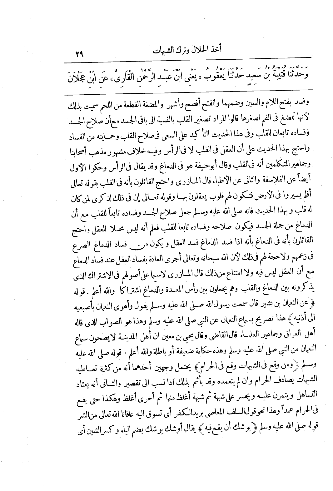 وَفَسَدَ بِفَتْحِ اللَّامِ وَالسِّينِ وَضَمِّهِمَا وَالْفَتْحُ أَفْصَحُ وَأَشْهَرُ وَالْمُضْغَةُ الْقِطْعَةُ مِنَ اللَّحْمِ سُمِّيَتْ بِذَلِكَ لِأَنَّهَا تُمْضَغُ فِي الْفَمِ لِصِغَرِهَا قَالُوا الْمُرَادُ تَصْغِيرُ الْقَلْبِ بِالنِّسْبَةِ إِلَى بَاقِي الْجَسَدِ مَعَ أَنَّ صَلَاحَ الْجَسَدِ وَفَسَادَهُ تَابِعَانِ لِلْقَلْبِ وَفِي هذا الحديث التأكيد عَلَى السَّعْيِ فِي صَلَاحِ الْقَلْبِ وَحِمَايَتِهِ مِنَ الْفَسَادِ وَاحْتُجَّ بِهَذَا الْحَدِيثِ عَلَى أَنَّ الْعَقْلَ فِي الْقَلْبِ لَا فِي الرَّأْسِ وَفِيهِ خِلَافٌ مشهور مذهب أَصْحَابِنَا وَجَمَاهِيرِ الْمُتَكَلِّمِينَ أَنَّهُ فِي الْقَلْبِ وَقَالَ أَبُو حَنِيفَةَ هُوَ فِي الدِّمَاغِ وَقَدْ يُقَالُ فِي الرَّأْسِ وَحَكَوُا الْأَوَّلَ أَيْضًا عَنِ الْفَلَاسِفَةِ وَالثَّانِي عَنِ الْأَطِبَّاءِ قَالَ الْمَازِرِيُّ وَاحْتَجَّ الْقَائِلُونَ بِأَنَّهُ فِي الْقَلْبِ بِقَوْلِهِ تَعَالَى أَفَلَمْ يَسِيرُوا فِي الْأَرْضِ فَتَكُونَ لَهُمْ قُلُوبٌ يَعْقِلُونَ بِهَا وَقَوْلِهِ تَعَالَى إِنَّ فِي ذَلِكَ لَذِكْرَى لِمَنْ كان له قلب وَبِهَذَا الْحَدِيثِ فَإِنَّهُ صَلَّى اللَّهُ عَلَيْهِ وَسَلَّمَ جَعَلَ صَلَاحَ الْجَسَدِ وَفَسَادَهُ تَابِعًا لِلْقَلْبِ مَعَ أَنَّ الدِّمَاغَ مِنْ جُمْلَةِ الْجَسَدِ فَيَكُونُ صَلَاحُهُ وَفَسَادُهُ تَابِعًا لِلْقَلْبِ فَعُلِمَ أَنَّهُ لَيْسَ مَحِلًّا لِلْعَقْلِ وَاحْتَجَّ الْقَائِلُونَ بِأَنَّهُ فِي الدِّمَاغِ بِأَنَّهُ إِذَا فَسَدَ الدِّمَاغُ فَسَدَ الْعَقْلُ وَيَكُونُ مِنْ فَسَادِ الدِّمَاغِ الصَّرَعُ فِي زَعْمِهِمْ وَلَا حُجَّةَ لَهُمْ فِي ذَلِكَ لِأَنَّ اللَّهَ سُبْحَانَهُ وَتَعَالَى أَجْرَى الْعَادَةَ بِفَسَادِ الْعَقْلِ عِنْدَ فَسَادِ الدِّمَاغِ مَعَ أَنَّ الْعَقْلَ لَيْسَ فِيهِ وَلَا امْتِنَاعَ مِنْ ذَلِكَ قَالَ الْمَازِرِيُّ لَا سِيَّمَا عَلَى أُصُولِهِمْ فِي الِاشْتِرَاكِ الَّذِي يَذْكُرُونَهُ بَيْنَ الدِّمَاغِ والقلب وهم يجعلون بين رأس المعدة وَالدِّمَاغِ اشْتِرَاكًا وَاللَّهُ أَعْلَمُ قَوْلُهُ (عَنِ النُّعْمَانِ بْنِ بَشِيرٍ قَالَ سَمِعْتُ رَسُولَ اللَّهِ صَلَّى اللَّهُ عَلَيْهِ وَسَلَّمَ يَقُولُ وَأَهْوَى النُّعْمَانُ بِإِصْبَعَيْهِ إِلَى أُذُنَيْهِ) هَذَا تَصْرِيحٌ بِسَمَاعِ النُّعْمَانِ عَنِ النَّبِيِّ صَلَّى اللَّهُ عَلَيْهِ وَسَلَّمَ وَهَذَا هُوَ الصَّوَابُ الَّذِي قَالَهُ أَهْلُ الْعِرَاقِ وَجَمَاهِيرُ الْعُلَمَاءِ قَالَ الْقَاضِي وَقَالَ يَحْيَى بْنُ مَعِينٍ إِنَّ أَهْلَ الْمَدِينَةِ لَا يُصِحُّونَ سَمَاعَ النُّعْمَانِ مِنَ النَّبِيِّ صَلَّى اللَّهُ عَلَيْهِ وَسَلَّمَ وَهَذِهِ حِكَايَةٌ ضَعِيفَةٌ أَوْ بَاطِلَةٌ وَاللَّهُ أَعْلَمُ قَوْلُهُ صَلَّى اللَّهُ عَلَيْهِ وَسَلَّمَ (وَمَنْ وَقَعَ فِي الشُّبُهَاتِ وَقَعَ فِي الْحَرَامِ) يَحْتَمِلُ وَجْهَيْنِ أَحَدُهُمَا أَنَّهُ مِنْ كَثْرَةِ تَعَاطِيهِ الشُّبُهَاتِ يُصَادِفُ الْحَرَامَ وَإِنْ لَمْ يَتَعَمَّدْهُ وَقَدْ يَأْثَمُ بِذَلِكَ إِذَا نُسِبَ إِلَى تَقْصِيرٍ وَالثَّانِي أَنَّهُ يَعْتَادُ التَّسَاهُلَ وَيَتَمَرَّنُ عَلَيْهِ وَيَجْسُرُ عَلَى شُبْهَةٍ ثُمَّ شُبْهَةٍ أَغْلَظَ مِنْهَا ثُمَّ أُخْرَى أَغْلَظَ وَهَكَذَا حَتَّى يَقَعَ فِي الْحَرَامِ عَمْدًا وَهَذَا نَحْوَ قَوْلِ السَّلَفِ الْمَعَاصِي بَرِيدُ الْكُفْرِ أَيْ تَسُوقُ إِلَيْهِ عَافَانَا اللَّهُ تَعَالَى مِنَ الشَّرِّ قَوْلُهُ صَلَّى اللَّهُ عَلَيْهِ وَسَلَّمَ (يُوشِكُ أَنْ يَقَعَ فِيهِ) يُقَالُ أَوْشَكَ يُوشِكُ بِضَمِّ الْيَاءِ وَكَسْرِ الشِّينِ أَيْ
