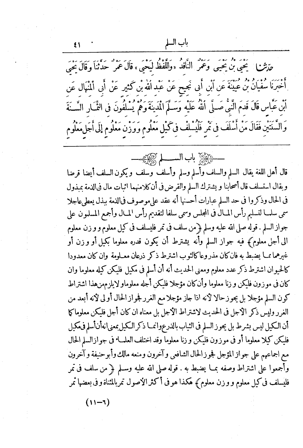 [1604] قَوْلُهُ صَلَّى اللَّهُ عَلَيْهِ وَسَلَّمَ مَنْ سَلَّفَ فِي تَمْرٍ فَلْيُسْلِفْ فِي كَيْلٍ مَعْلُومٍ وَوَزْنٍ مَعْلُومٍ إِلَى أَجَلٍ مَعْلُومٍ) فِيهِ جَوَازُ السَّلَمِ وَأَنَّهُ يُشْتَرَطُ أَنْ يَكُونَ قَدْرُهُ مَعْلُومًا بِكَيْلٍ أَوْ وَزْنٍ أَوْ غَيْرِهِمَا مِمَّا يُضْبَطُ بِهِ فَإِنْ كَانَ مَذْرُوعًا كَالثَّوْبِ اشْتُرِطَ ذِكْرُ ذُرْعَانٍ مَعْلُومَةٍ وَإِنْ كَانَ مَعْدُودًا كَالْحَيَوَانِ اشْتُرِطَ ذِكْرُ عَدَدٍ مَعْلُومٍ وَمَعْنَى الْحَدِيثِ أَنَّهُ إِنْ أَسْلَمَ فِي مَكِيلٍ فَلْيَكُنْ كَيْلُهُ مَعْلُومًا وَإِنْ كَانَ فِي مَوْزُونٍ فَليَكُنْ وَزْنًا مَعْلُومًا وَإِنْ كَانَ مُؤَجَّلًا فَلْيَكُنْ أَجَلُهُ مَعْلُومًا وَلَا يَلْزَمُ مِنْ هَذَا اشْتِرَاطُ كَوْنِ السَّلَمِ مُؤَجَّلًا بَلْ يَجُوزُ حَالًّا لِأَنَّهُ إِذَا جَازَ مؤجلا مع الغرر فجراز الْحَالِّ أَوْلَى لِأَنَّهُ أَبْعَدُ مِنَ الْغَرَرِ وَلَيْسَ ذِكْرُ الْأَجَلِ فِي الْحَدِيثِ لِاشْتِرَاطِ الْأَجَلِ بَلْ مَعْنَاهُ إِنْ كَانَ أَجَلٌ فَليَكُنْ مَعْلُومًا كَمَا أَنَّ الْكَيْلَ لَيْسَ بِشَرْطٍ بَلْ يَجُوزُ السَّلَمُ فِي الثِّيَابِ بِالذَّرْعِ وَإِنَّمَا ذَكَرَ الْكَيْلَ بِمَعْنَى أَنَّهُ إِنْ أَسْلَمَ فِي مَكِيلٍ فَلْيَكُنْ كَيْلًا مَعْلُومًا أَوْ فِي مَوْزُونٍ فَلْيَكُنْ وَزْنًا مَعْلُومًا وَقَدِ اخْتَلَفَ الْعُلَمَاءُ فِي جَوَازِ السَّلَمِ الْحَالِّ مَعَ إِجْمَاعِهِمْ عَلَى جَوَازِ الْمُؤَجَّلِ فَجَوَّزَ الْحَالَّ الشَّافِعِيُّ وَآخَرُونَ وَمَنَعَهُ مَالِكٌ وَأَبُو حَنِيفَةَ وَآخَرُونَ وَأَجْمَعُوا عَلَى اشْتِرَاطِ وَصْفِهِ بِمَا يُضْبَطُ بِهِ قَوْلُهُ صَلَّى اللَّهُ عَلَيْهِ وَسَلَّمَ (مَنْ سَلَّفَ فِي تَمْرٍ فَلْيُسْلِفْ فِي كَيْلٍ مَعْلُومٍ وَوَزْنٍ مَعْلُومٍ) هَكَذَا هُوَ فِي أَكْثَرِ الْأُصُولِ تَمْرٌ بِالْمُثَنَّاةِ وَفِي بَعْضِهَا ثَمَرٌ)