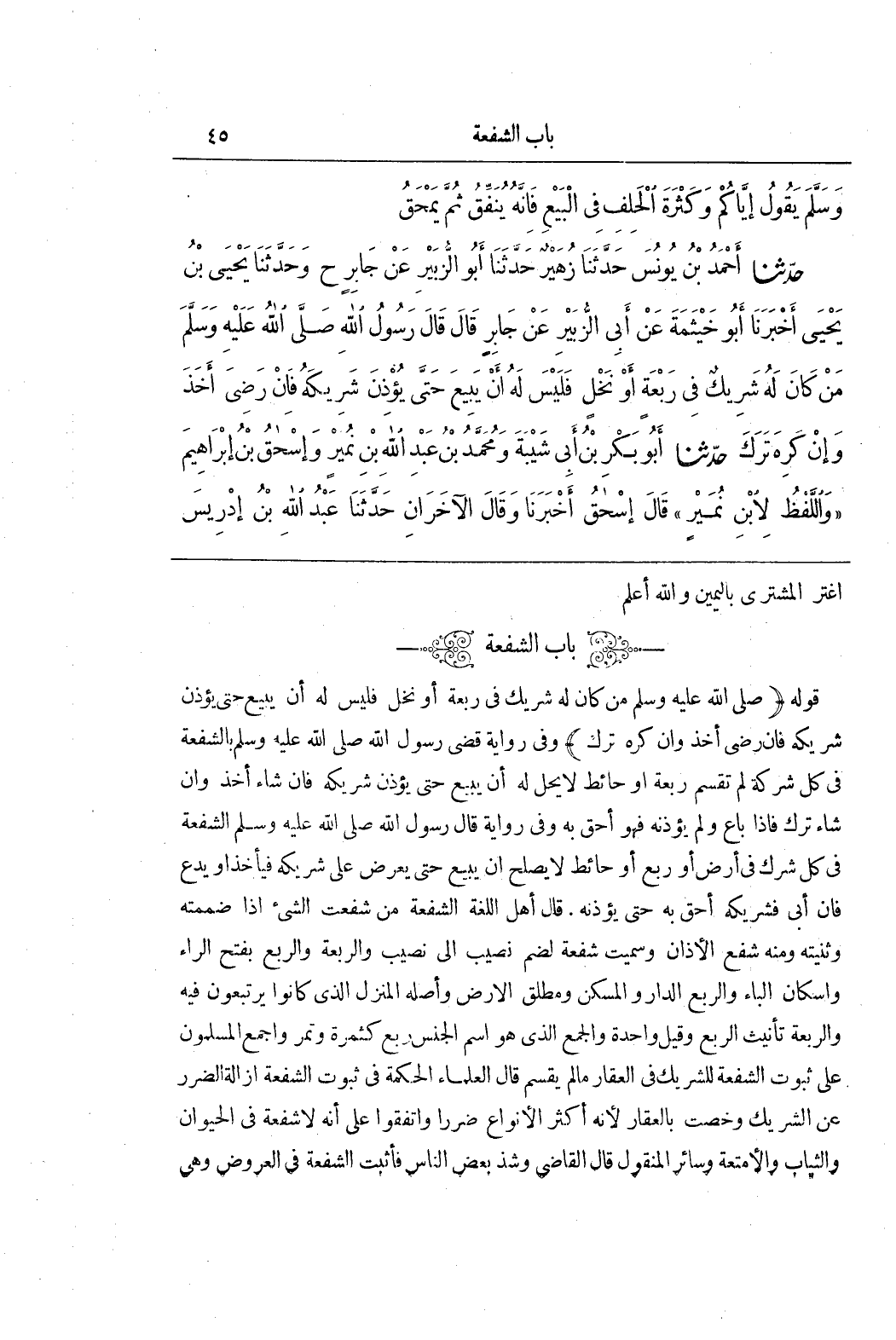 [1608] قَوْلُهُ (صَلَّى اللَّهُ عَلَيْهِ وَسَلَّمَ مَنْ كَانَ لَهُ شَرِيكٌ فِي رَبْعَةٍ أَوْ نَخْلٍ فَلَيْسَ لَهُ أَنْ يَبِيعَ حَتَّى يُؤْذِنَ شَرِيكَهُ فَإِنْ رَضِيَ أَخَذَ وَإِنْ كَرِهَ تَرَكَ) وَفِي رِوَايَةٍ قَضَى رَسُولُ اللَّهِ صَلَّى اللَّهُ عَلَيْهِ وَسَلَّمَ بِالشُّفْعَةِ فِي كُلِّ شَرِكَةٍ لَمْ تُقْسَمْ رَبْعَةٍ أَوْ حَائِطٍ لَا يَحِلُّ لَهُ أَنْ يَبِيعَ حَتَّى يُؤْذِنَ شَرِيكَهُ فَإِنْ شَاءَ أَخَذَ وَإِنْ شَاءَ تَرَكَ فَإِذَا بَاعَ وَلَمْ يُؤْذِنْهُ فَهُوَ أَحَقُّ بِهِ وَفِي رِوَايَةٍ قَالَ رَسُولُ اللَّهِ صَلَّى اللَّهُ عَلَيْهِ وَسَلَّمَ الشُّفْعَةُ فِي كُلِّ شِرْكٍ فِي أَرْضٍ أَوْ رَبْعٍ أَوْ حَائِطٍ لَا يَصْلُحُ أَنْ يَبِيعَ حَتَّى يَعْرِضَ عَلَى شَرِيكِهِ فَيَأْخُذَ أَوْ يَدَعَ فَإِنْ أَبَى فَشَرِيكُهُ أَحَقُّ بِهِ حَتَّى يُؤْذِنَهُ قَالَ أَهْلُ اللُّغَةِ الشُّفْعَةُ مِنْ شَفَعْتُ الشَّيْءَ إِذَا ضَمَمْتُهُ وَثَنَيْتُهُ وَمِنْهُ شَفَعَ الْأَذَانَ وَسُمِّيَتْ شُفْعَةً لِضَمِّ نَصِيبٍ إِلَى نَصِيبٍ وَالرَّبْعَةُ وَالرَّبْعُ بِفَتْحِ الرَّاءِ وَإِسْكَانِ الباء والربع الدار والمسكن وَمُطْلَقُ الْأَرْضِ وَأَصْلُهُ الْمَنْزِلُ الَّذِي كَانُوا يَرْتَبِعُونَ فِيهِ وَالرَّبْعَةُ تَأْنِيثُ الرَّبْعِ وَقِيلَ وَاحِدَةٌ وَالْجَمْعُ الذي هو اسم الجنس ربع كثمرة وتمر وَأَجْمَعَ الْمُسْلِمُونَ عَلَى ثُبُوتِ الشُّفْعَةِ لِلشَّرِيكِ فِي العقار مالم يُقْسَّمْ قَالَ الْعُلَمَاءُ الْحِكْمَةُ فِي ثُبُوتِ الشُّفْعَةِ إزالة الضرر عن الشريك وحصت بِالْعَقَارِ لِأَنَّهُ أَكْثَرُ الْأَنْوَاعِ ضَرَرًا وَاتَّفَقُوا عَلَى أَنَّهُ لَا شُفْعَةَ فِي الْحَيَوَانِ وَالثِّيَابِ وَالْأَمْتِعَةِ وَسَائِرِ الْمَنْقُولِ قَالَ الْقَاضِي وَشَذَّ بَعْضُ النَّاسِ فَأَثْبَتَ الشُّفْعَةَ فِي الْعُرُوضِ وَهِيَ)