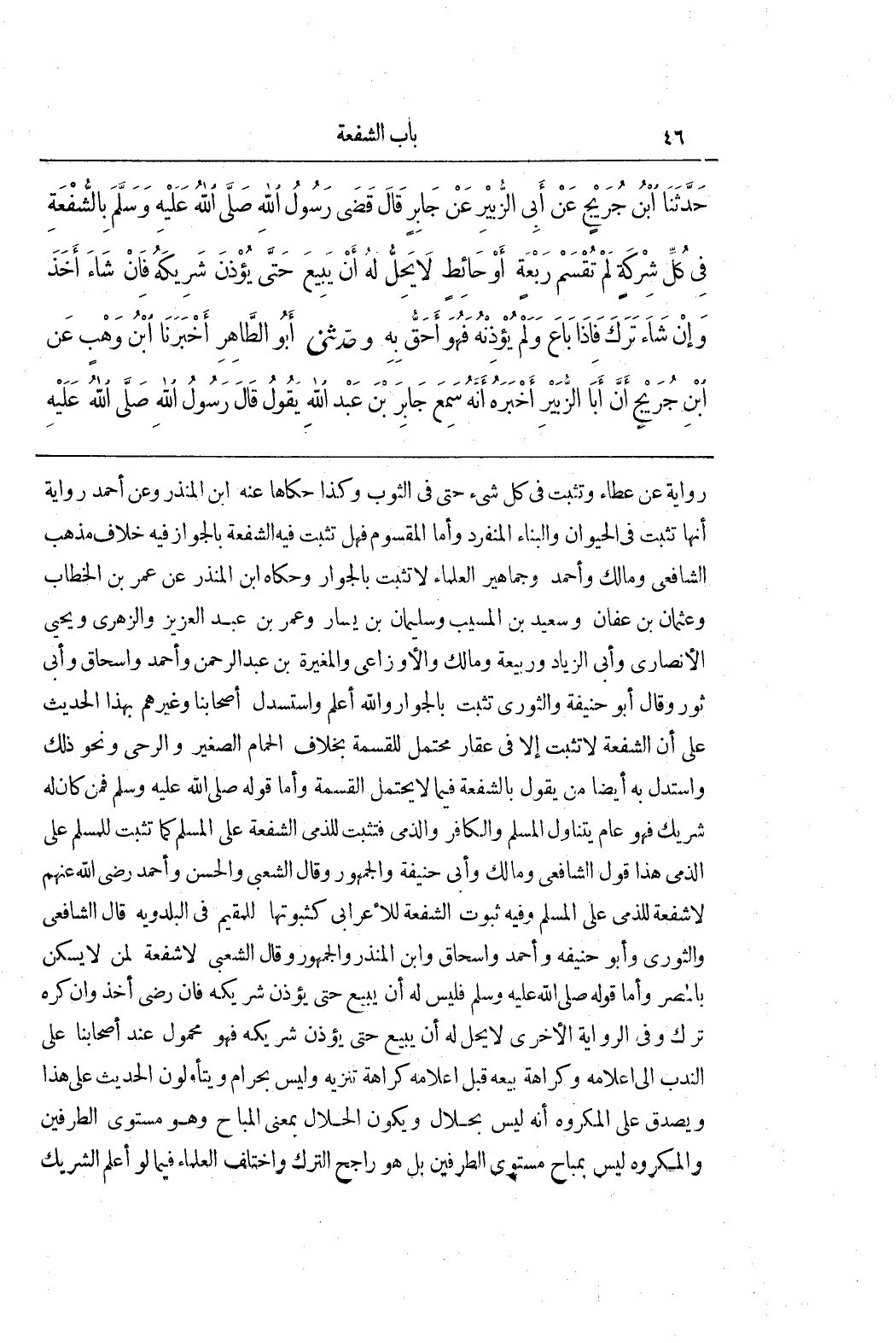 رواية عن عطاء وتثبت في كل شئ حتى في الثوب وكذا حكاها عنه بن الْمُنْذِرِ وَعَنْ أَحْمَدَ رِوَايَةٌ أَنَّهَا تَثْبُتُ فِي الْحَيَوَانِ وَالْبِنَاءِ الْمُنْفَرِدِ وَأَمَّا الْمَقْسُومُ فَهَلْ تَثْبُتُ فيه الشفعة بالجواز فِيهِ خِلَافٌ مَذْهَبُ الشَّافِعِيِّ وَمَالِكٍ وَأَحْمَدَ وَجَمَاهِيرِ العلماء لا تثبت بالجوار وحكاه بن الْمُنْذِرِ عَنْ عُمَرَ بْنِ الْخَطَّابِ وَعُثْمَانَ بْنِ عَفَّانَ وَسَعِيدِ بْنِ الْمُسَيِّبِ وَسُلَيْمَانَ بْنِ يَسَارٍ وَعُمَرَ بْنِ عَبْدِ الْعَزِيزِ وَالزُّهْرِيِّ وَيَحْيَى الْأَنْصَارِيِّ وَأَبِي الزِّيَادِ وَرَبِيعَةَ وَمَالِكٍ وَالْأَوْزَاعِيِّ وَالْمُغِيرَةِ بْنِ عَبْدِ الرَّحْمَنِ وَأَحْمَدَ وَإِسْحَاقَ وَأَبِي ثَوْرٍ وَقَالَ أَبُو حَنِيفَةَ وَالثَّوْرِيُّ تَثْبُتُ بِالْجِوَارِ وَاللَّهُ أَعْلَمُ وَاسْتَدَلَّ أَصْحَابُنَا وَغَيْرُهُمْ بِهَذَا الْحَدِيثِ عَلَى أَنَّ الشُّفْعَةَ لَا تَثْبُتُ إِلَّا فِي عَقَارٍ مُحْتَمِلٍ لِلْقِسْمَةِ بِخِلَافِ الْحَمَّامِ الصَّغِيرِ وَالرَّحَى وَنَحْوِ ذَلِكَ وَاسْتَدَلَّ بِهِ أَيْضًا مَنْ يَقُولُ بِالشُّفْعَةِ فِيمَا لَا يَحْتَمِلُ الْقِسْمَةَ وَأَمَّا قَوْلُهُ صَلَّى اللَّهُ عَلَيْهِ وَسَلَّمَ فَمَنْ كَانَ لَهُ شَرِيكٌ فَهُوَ عام يتناول المسلم والكافر والذمي فتثبت للذمي الشفعة على المسلم كما تثبت للمسلم على الذمي هَذَا قَوْلُ الشَّافِعِيِّ وَمَالِكٍ وَأَبِي حَنِيفَةَ وَالْجُمْهُورِ وَقَالَ الشَّعْبِيُّ وَالْحَسَنُ وَأَحْمَدُ رَضِيَ اللَّهُ عَنْهُمْ لَا شُفْعَةَ لِلذِّمِّيِّ عَلَى الْمُسْلِمِ وَفِيهِ ثُبُوتُ الشفعة للأعرابي كثبوتها للمقيم في البلدويه قَالَ الشَّافِعِيُّ وَالثَّوْرِيُّ وَأَبُو حَنِيفَةَ وَأَحْمَدُ وَإِسْحَاقُ وبن الْمُنْذِرِ وَالْجُمْهُورُ وَقَالَ الشَّعْبِيُّ لَا شُفْعَةَ لِمَنْ لَا يَسْكُنُ بِالْمِصْرِ وَأَمَّا قَوْلُهُ صَلَّى اللَّهُ عَلَيْهِ وَسَلَّمَ فَلَيْسَ لَهُ أَنْ يَبِيعَ حَتَّى يُؤْذِنَ شَرِيكَهُ فَإِنْ رَضِيَ أَخَذَ وَإِنْ كَرِهَ تَرَكَ وَفِي الرِّوَايَةِ الْأُخْرَى لَا يَحِلُّ لَهُ أَنْ يَبِيعَ حَتَّى يُؤْذِنَ شَرِيكَهُ فَهُوَ مَحْمُولٌ عِنْدَ أَصْحَابِنَا عَلَى النَّدْبِ إِلَى إِعْلَامِهِ وَكَرَاهَةِ بَيْعِهِ قَبْلَ إِعْلَامِهِ كَرَاهَةَ تَنْزِيهٍ وَلَيْسَ بِحَرَامٍ وَيَتَأَوَّلُونَ الْحَدِيثَ عَلَى هَذَا وَيَصْدُقُ عَلَى الْمَكْرُوهِ أَنَّهُ لَيْسَ بِحَلَالٍ وَيَكُونُ الْحَلَالُ بِمَعْنَى الْمُبَاحِ وَهُوَ مُسْتَوِي الطَّرَفَيْنِ وَالْمَكْرُوهُ لَيْسَ بِمُبَاحٍ مُسْتَوِي الطَّرَفَيْنِ بَلْ هُوَ رَاجِحُ التَّرْكِ وَاخْتَلَفَ الْعُلَمَاءُ فِيمَا لَوْ أَعْلَمَ الشَّرِيكَ