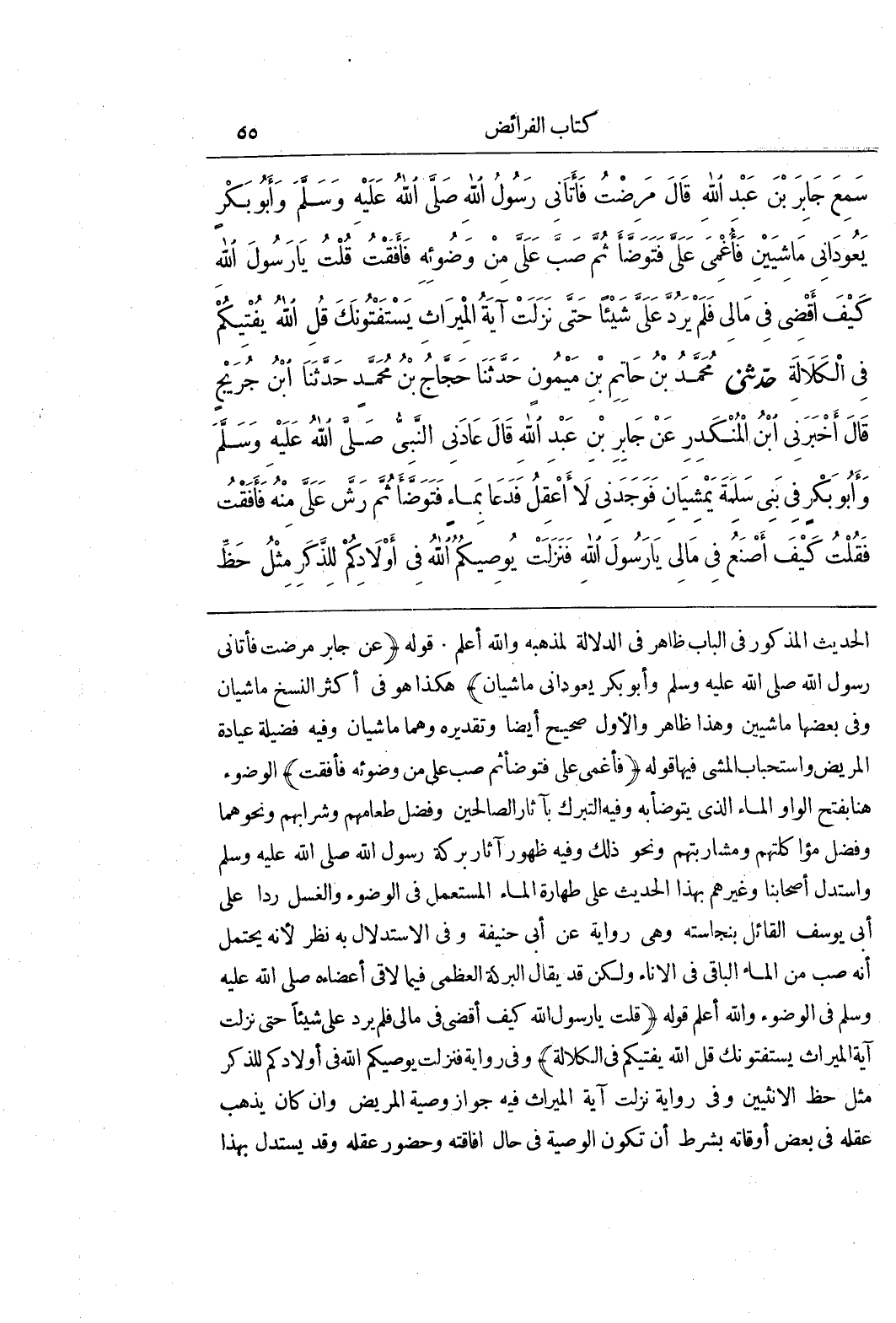 [1616] (عَنْ جَابِرٍ مَرِضْتُ فَأَتَانِي رَسُولُ اللَّهِ صَلَّى اللَّهُ عَلَيْهِ وَسَلَّمَ وَأَبُو بَكْرٍ يَعُودَانِي مَاشِيَانِ) هَكَذَا هُوَ فِي أَكْثَرِ النُّسَخِ مَاشِيَانِ وَفِي بَعْضِهَا مَاشِيَيْنِ وَهَذَا ظَاهِرٌ وَالْأَوَّلُ صَحِيحٌ أَيْضًا وَتَقْدِيرُهُ وَهُمَا مَاشِيَانِ وَفِيهِ فَضِيلَةُ عِيَادَةِ الْمَرِيضِ وَاسْتِحْبَابُ الْمَشْيِ فِيهَا قَوْلُهُ (فَأُغْمِيَ عَلَيَّ فَتَوَضَّأَ ثُمَّ صَبَّ عَلَيَّ مِنْ وَضُوئِهِ فَأَفَقْتُ) الْوَضُوءُ هُنَا بِفَتْحِ الْوَاوِ الْمَاءُ الَّذِي يُتَوَضَّأُ بِهِ وَفِيهِ التَّبَرُّكُ بِآثَارِ الصَّالِحِينَ وَفَضْلُ طَعَامِهِمْ وَشَرَابِهِمْ وَنَحْوِهِمَا وَفَضْلُ مُؤَاكَلَتِهِمْ وَمُشَارَبَتِهِمْ وَنَحْوِ ذَلِكَ وَفِيهِ ظُهُورُ آثَارِ بَرَكَةِ رَسُولِ اللَّهِ صَلَّى اللَّهُ عَلَيْهِ وَسَلَّمَ وَاسْتَدَلَّ أَصْحَابُنَا وَغَيْرُهُمْ بِهَذَا الْحَدِيثِ عَلَى طَهَارَةِ الْمَاءِ الْمُسْتَعْمَلِ فِي الْوُضُوءِ وَالْغُسْلِ رَدًّا عَلَى أَبِي يُوسُفَ الْقَائِلِ بِنَجَاسَتِهِ وَهِيَ رِوَايَةٌ عَنْ أَبِي حَنِيفَةَ وَفِي الِاسْتِدْلَالِ بِهِ نَظَرٌ لِأَنَّهُ يَحْتَمِلُ أَنَّهُ صَبَّ مِنْ الْمَاءِ الْبَاقِي فِي الْإِنَاءِ وَلَكِنْ قَدْ يُقَالُ الْبَرَكَةُ الْعُظْمَى فِيمَا لَاقَى أَعْضَاءَهُ صَلَّى اللَّهُ عَلَيْهِ وَسَلَّمَ فِي الْوُضُوءِ والله أعلم قوله (قلت يارسول اللَّهِ كَيْفَ أَقْضِي فِي مَالِي فَلَمْ يَرُدَّ عَلَيَّ شَيْئًا حَتَّى نَزَلَتْ آيَةُ الْمِيرَاثِ يَسْتَفْتُونَكَ قل الله يفتيكم في الكلالة) وَفِي رِوَايَةٍ فَنَزَلَتْ يُوصِيكُمُ اللَّهُ فِي أَوْلَادِكُمْ للذكر مثل حظ الانثيين وَفِي رِوَايَةٍ نَزَلَتْ آيَةُ الْمِيرَاثِ فِيهِ جَوَازُ وَصِيَّةِ الْمَرِيضِ وَإِنْ كَانَ يَذْهَبُ عَقْلُهُ فِي بَعْضِ أَوْقَاتِهِ بِشَرْطِ أَنْ تَكُونَ الْوَصِيَّةُ فِي حَالِ إِفَاقَتِهِ وَحُضُورِ عَقْلِهِ وَقَدْ يَسْتَدِلُّ بِهَذَا
