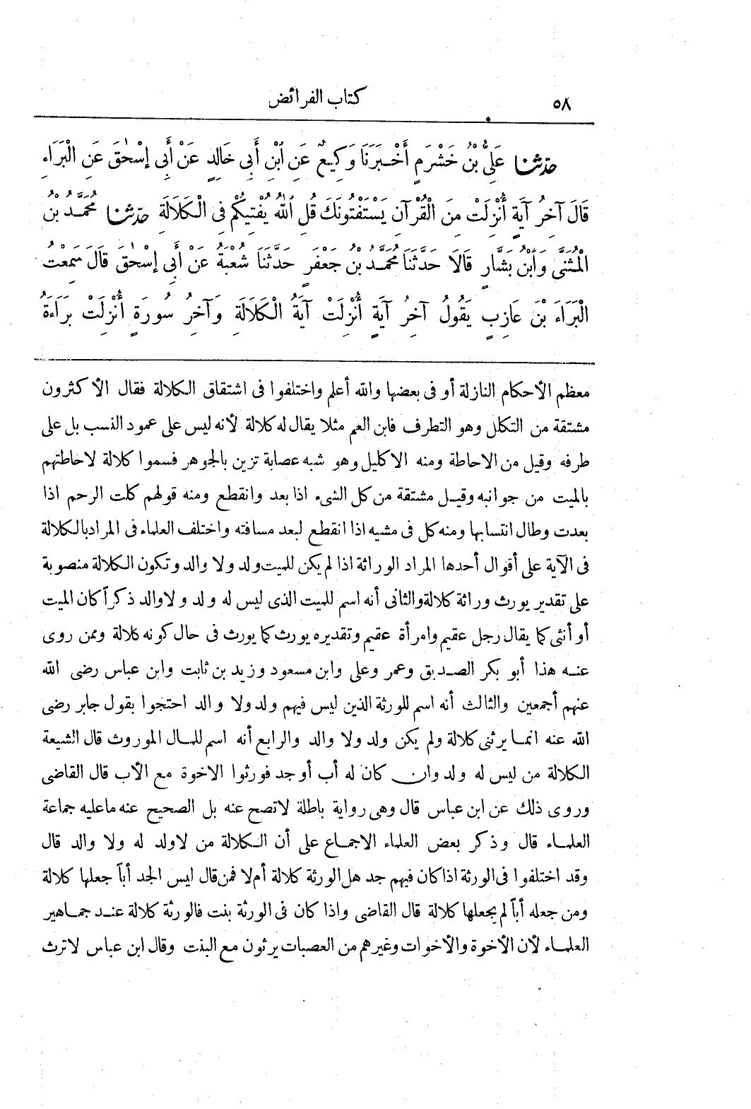 [1618] وَاخْتَلَفُوا فِي اشْتِقَاقِ الْكَلَالَةِ فَقَالَ الْأَكْثَرُونَ مُشْتَقَّةٌ مِنَ التَّكَلُّلِ وَهُوَ التَّطَرُّفُ فَابْنُ الْعَمِّ مَثَلًا يُقَالُ لَهُ كَلَالَةٌ لِأَنَّهُ لَيْسَ عَلَى عَمُودِ النَّسَبِ بَلْ عَلَى طَرَفِهِ وَقِيلَ مِنَ الْإِحَاطَةِ وَمِنْهُ الْإِكْلِيلُ وَهُوَ شِبْهُ عِصَابَةٍ تُزَيَّنُ بِالْجَوْهَرِ فَسُمُّوا كَلَالَةً لِإِحَاطَتِهِمْ بِالْمَيِّتِ مِنْ جَوَانِبِهِ وَقِيلَ مُشْتَقَّةٌ مِنْ كَلَّ الشَّيْءُ إِذَا بَعُدَ وَانْقَطَعَ وَمِنْهُ قَوْلُهُمْ كَلَّتِ الرَّحِمُ إِذَا بَعُدَتْ وَطَالَ انْتِسَابُهَا وَمِنْهُ كَلَّ فِي مَشْيِهِ إِذَا انْقَطَعَ لِبُعْدِ مَسَافَتِهِ وَاخْتَلَفَ الْعُلَمَاءُ فِي الْمُرَادِ بِالْكَلَالَةِ فِي الْآيَةِ عَلَى أَقْوَالٍ أَحَدُهَا الْمُرَادُ الْوِرَاثَةُ إِذَا لَمْ يَكُنْ لِلْمَيِّتِ وَلَدٌ وَلَا وَالِدٌ وَتَكُونُ الْكَلَالَةُ مَنْصُوبَةً عَلَى تَقْدِيرِ يُورَثُ وِرَاثَةً كَلَالَةً وَالثَّانِي أَنَّهُ اسْمٌ لِلْمَيِّتِ الَّذِي لَيْسَ لَهُ وَلَدٌ وَلَا وَالِدٌ ذَكَرًا كَانَ الْمَيِّتُ أَوْ أُنْثَى كَمَا يُقَالُ رَجُلٌ عَقِيمٌ وَامْرَأَةٌ عَقِيمٌ وَتَقْدِيرُهُ يُورَثُ كَمَا يُورَثُ فِي حَالِ كَوْنِهِ كَلَالَةً وَمِمَّنْ رُوِيَ عَنْهُ هَذَا أبو بكر الصديق وعمر وعلي وبن مسعود وزيد بن ثابت وبن عَبَّاسٍ رَضِيَ اللَّهُ عَنْهُمْ أَجْمَعِينَ وَالثَّالِثُ أَنَّهُ اسْمٌ لِلْوَرَثَةِ الَّذِينَ لَيْسَ فِيهِمْ وَلَدٌ وَلَا وَالِدٌ احْتَجُّوا بِقَوْلِ جَابِرٍ رَضِيَ اللَّهُ عَنْهُ إِنَّمَا يَرِثُنِي كَلَالَةٌ وَلَمْ يَكُنْ وَلَدٌ وَلَا وَالِدٌ وَالرَّابِعُ أَنَّهُ اسْمٌ لِلْمَالِ الْمَوْرُوثِ قَالَ الشِّيعَةُ الْكَلَالَةُ مَنْ لَيْسَ لَهُ وَلَدٌ وَإِنْ كَانَ لَهُ أَبٌ أَوْ جَدٌّ فَوَرَّثُوا الْإِخْوَةَ مَعَ الْأَبِ قَالَ الْقَاضِي وَرُوِيَ ذَلِكَ عَنِ بن عَبَّاسٍ قَالَ وَهِيَ رِوَايَةٌ بَاطِلَةٌ لَا تَصِحُّ عَنْهُ بَلِ الصَّحِيحُ عَنْهُ مَا عَلَيْهِ جَمَاعَةُ الْعُلَمَاءِ قَالَ وَذَكَرَ بَعْضُ الْعُلَمَاءِ الْإِجْمَاعَ عَلَى أَنَّ الْكَلَالَةَ مَنْ لَا وَلَدَ لَهُ وَلَا وَالِدَ قَالَ وَقَدِ اخْتَلَفُوا فِي الْوَرَثَةِ إِذَا كان فيهم جد هل الورثة كلالة أم لَا فَمَنْ قَالَ لَيْسَ الْجَدُّ أَبًا جَعَلَهَا كَلَالَةً وَمَنْ جَعَلَهُ أَبًا لَمْ يَجْعَلْهَا كَلَالَةً قَالَ الْقَاضِي وَإِذَا كَانَ فِي الْوَرَثَةِ بِنْتٌ فَالْوَرَثَةُ كَلَالَةٌ عِنْدَ جَمَاهِيرِ الْعُلَمَاءِ لِأَنَّ الْإِخْوَةَ وَالْأَخَوَاتِ وَغَيْرَهُمْ مِنَ الْعَصَبَاتِ يَرِثُونَ مَعَ الْبِنْتِ وقال بن عَبَّاسٍ لَا تَرِثُ