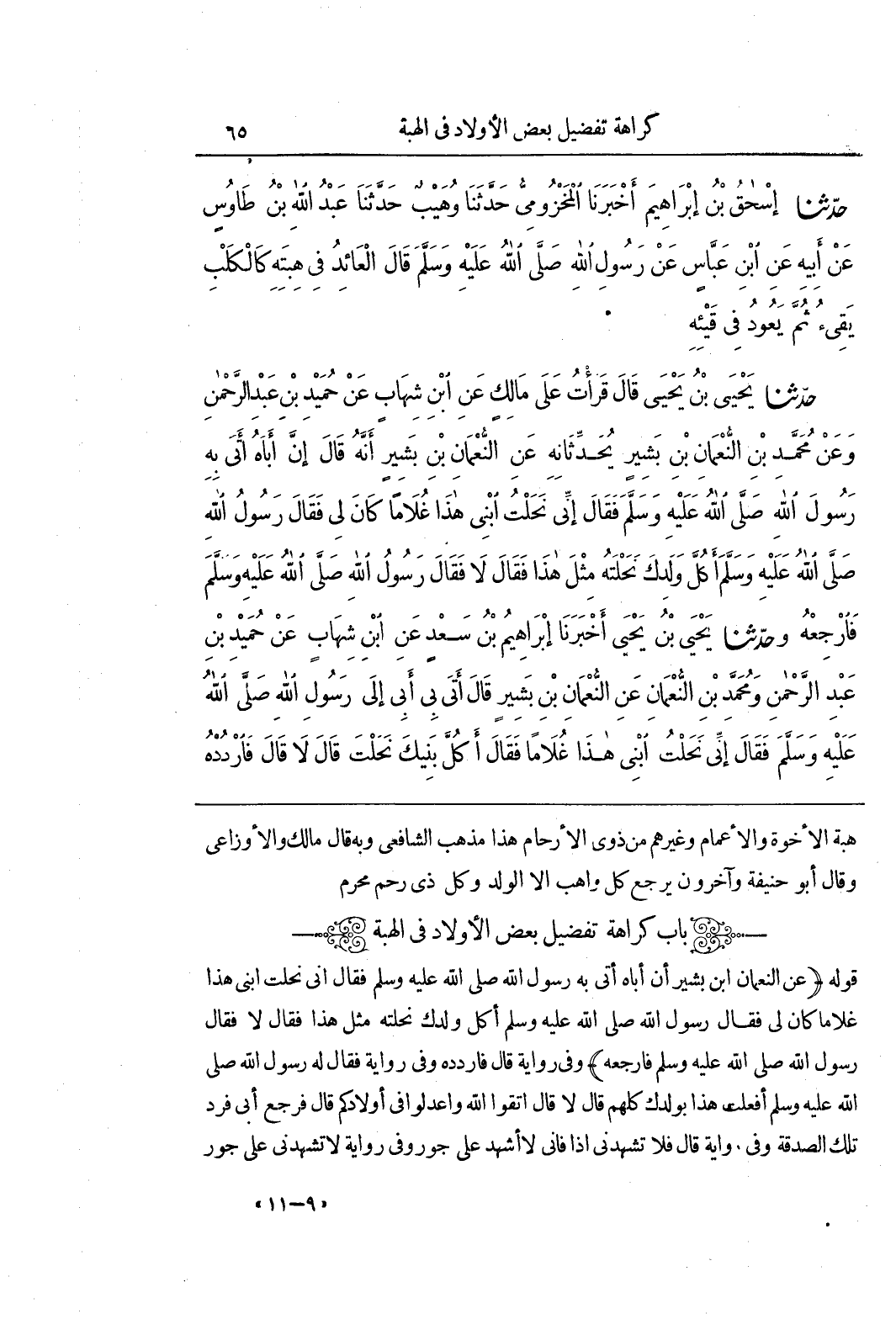 [1623] قَوْلُهُ (عَنِ النُّعْمَانِ بْنِ بَشِيرٍ أَنَّ أَبَاهُ أَتَى بِهِ رَسُولُ اللَّهِ صَلَّى اللَّهُ عَلَيْهِ وَسَلَّمَ فَقَالَ إِنِّي نَحَلْتُ ابْنِي هَذَا غُلَامًا كَانَ لِي فَقَالَ رَسُولُ اللَّهِ صَلَّى اللَّهُ عَلَيْهِ وَسَلَّمَ أَكُلَّ وَلَدِكَ نَحَلْتَهُ مِثْلَ هَذَا فَقَالَ لَا فَقَالَ رَسُولُ اللَّهِ صَلَّى اللَّهُ عَلَيْهِ وَسَلَّمَ فَارْجِعْهُ) وَفِي رِوَايَةٍ قَالَ فَارْدُدْهُ وَفِي رِوَايَةٍ فَقَالَ لَهُ رَسُولُ اللَّهِ صَلَّى اللَّهُ عَلَيْهِ وَسَلَّمَ أَفَعَلْتَ هَذَا بِوَلَدِكَ كُلِّهِمْ قَالَ لَا قَالَ اتَّقُوا اللَّهَ وَاعْدِلُوا فِي أَوْلَادِكُمْ قَالَ فَرَجَعَ أَبِي فَرَدَّ تِلْكَ الصَّدَقَةَ وَفِي رِوَايَةٍ قَالَ فَلَا تُشْهِدْنِي إذًا فَإِنِّي لَا أَشْهَدُ عَلَى جَوْرٍ وَفِي رِوَايَةٍ لَا تُشْهِدْنِي على جور)