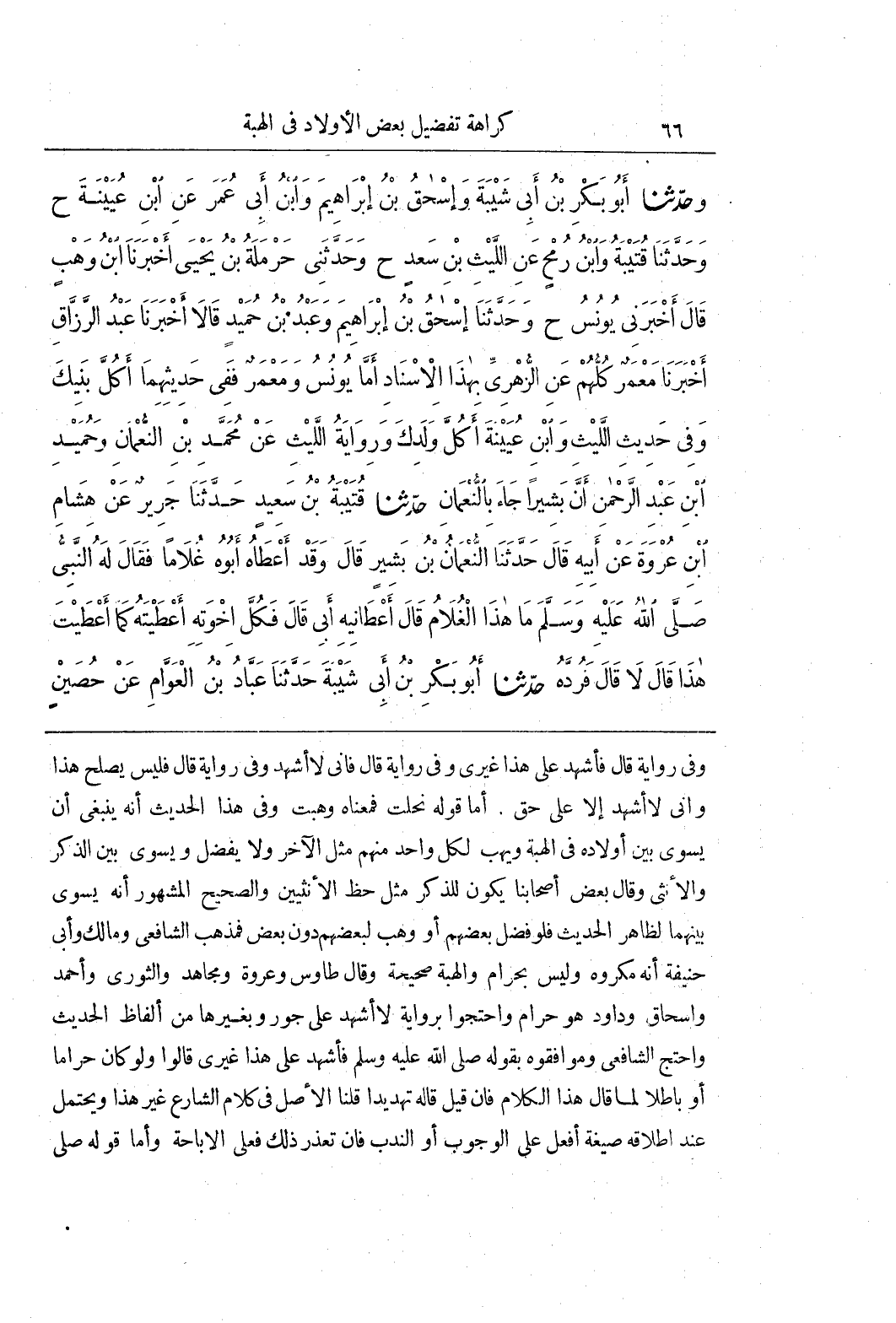 وَفِي رِوَايَةٍ قَالَ فَأَشْهِدْ عَلَى هَذَا غَيْرِي وَفِي رِوَايَةٍ قَالَ فَإِنِّي لَا أَشْهَدُ وَفِي رِوَايَةٍ قَالَ فَلَيْسَ يَصْلُحُ هَذَا وَإِنِّي لَا أَشْهَدُ إِلَّا عَلَى حَقٍّ أَمَّا قَوْلُهُ نَحَلْتُ فَمَعْنَاهُ وَهَبْتُ وَفِي هَذَا الْحَدِيثِ أَنَّهُ يَنْبَغِي أَنْ يُسَوِّيَ بَيْنَ أَوْلَادِهِ فِي الْهِبَةِ وَيَهَبَ لِكُلِّ وَاحِدٍ مِنْهُمْ مِثْلَ الْآخَرِ وَلَا يُفَضِّلَ وَيُسَوِّيَ بَيْنَ الذَّكَرِ وَالْأُنْثَى وَقَالَ بَعْضُ أَصْحَابِنَا يَكُونُ لِلذَّكَرِ مِثْلُ حَظِّ الْأُنْثَيَيْنِ وَالصَّحِيحُ الْمَشْهُورُ أَنَّهُ يُسَوِّي بَيْنَهُمَا لِظَاهِرِ الْحَدِيثِ فَلَوْ فَضَّلَ بَعْضَهُمْ أَوْ وَهَبَ لِبَعْضِهِمْ دُونَ بَعْضٍ فَمَذْهَبُ الشَّافِعِيِّ وَمَالِكٍ وَأَبِي حَنِيفَةَ أَنَّهُ مَكْرُوهٌ وَلَيْسَ بِحَرَامٍ وَالْهِبَةُ صَحِيحَةٌ وَقَالَ طَاوُسٌ وَعُرْوَةُ وَمُجَاهِدٌ وَالثَّوْرِيُّ وَأَحْمَدُ وَإِسْحَاقُ وَدَاوُدُ هُوَ حَرَامٌ وَاحْتَجُّوا بِرِوَايَةِ لَا أَشْهَدُ عَلَى جَوْرٍ وَبِغَيْرِهَا مِنْ أَلْفَاظِ الْحَدِيثِ وَاحْتَجَّ الشَّافِعِيُّ وَمُوَافِقُوهُ بِقَوْلِهِ صَلَّى اللَّهُ عَلَيْهِ وَسَلَّمَ فَأَشْهِدْ عَلَى هَذَا غَيْرِي قَالُوا وَلَوْ كَانَ حَرَامًا أَوْ بَاطِلًا لَمَا قَالَ هَذَا الْكَلَامَ فَإِنْ قِيلَ قَالَهُ تَهْدِيدًا قُلْنَا الْأَصْلُ فِي كَلَامِ الشَّارِعِ غَيْرُ هَذَا وَيَحْتَمِلُ عِنْدَ إِطْلَاقِهِ صِيغَةَ أَفْعِلْ عَلَى الْوُجُوبِ أَوِ النَّدْبِ فَإِنْ تَعَذَّرَ ذَلِكَ فَعَلَى الْإِبَاحَةِ وَأَمَّا قَوْلُهُ صَلَّى اللَّهُ عَلَيْهِ وَسَلَّمَ