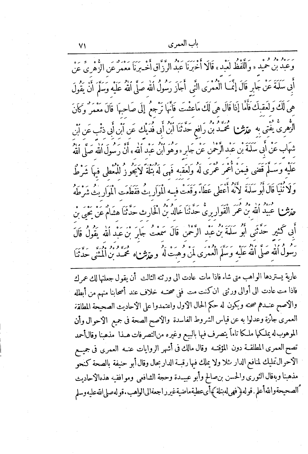 عَارِيَةٌ يَسْتَرِدُّهَا الْوَاهِبُ مَتَى شَاءَ فَإِذَا مَاتَ عَادَتْ إِلَى وَرَثَتِهِ الثَّالِثُ أَنْ يَقُولَ جَعَلْتُهَا لَكَ عُمْرَكَ فَإِذَا مِتَّ عَادَتْ إِلَيَّ أَوْ إِلَى وَرَثَتِي إِنْ كُنْتُ مِتُّ فَفِي صِحَّتِهِ خِلَافٌ عِنْدَ أَصْحَابِنَا مِنْهُمْ مَنْ أَبْطَلَهُ وَالْأَصَحُّ عِنْدَهُمْ صِحَّتُهُ وَيَكُونُ لَهُ حُكْمُ الْحَالِ الْأَوَّلِ وَاعْتَمَدُوا عَلَى الْأَحَادِيثِ الصَّحِيحَةِ الْمُطْلَقَةِ الْعُمْرَى جَائِزَةٌ وَعَدَلُوا بِهِ عَنْ قِيَاسِ الشُّرُوطِ الْفَاسِدَةِ وَالْأَصَحُّ الصِّحَّةُ فِي جَمِيعِ الْأَحْوَالِ وَأَنَّ الْمَوْهُوبَ لَهُ يَمْلِكُهَا مِلْكًا تَامًّا يَتَصَرَّفُ فِيهَا بِالْبَيْعِ وَغَيْرِهِ مِنَ التَّصَرُّفَاتِ هَذَا مَذْهَبُنَا وَقَالَ أَحْمَدُ تَصِحُّ الْعُمْرَى الْمُطْلَقَةُ دُونَ الْمُؤَقَّتَةِ وَقَالَ مَالِكٌ فِي أَشْهَرِ الرِّوَايَاتِ عَنْهُ الْعُمْرَى فِي جَمِيعِ الْأَحْوَالِ تَمْلِيكٌ لِمَنَافِعِ الدَّارِ مَثَلًا وَلَا يَمْلِكُ فِيهَا رَقَبَةَ الدَّارِ بِحَالٍ وَقَالَ أَبُو حَنِيفَةَ بِالصِّحَّةِ كَنَحْوِ مَذْهَبِنَا وَبِهِ قَالَ الثَّوْرِيُّ وَالْحَسَنُ بْنُ صَالِحٍ وَأَبُو عُبَيْدَةَ وَحُجَّةُ الشَّافِعِيِّ وَمُوَافِقِيهِ هَذِهِ الْأَحَادِيثُ الصَّحِيحَةُ وَاللَّهُ أَعْلَمُ قَوْلُهُ (فَهِيَ لَهُ بتلة) أي عطية ماضية غَيْرُ رَاجِعَةٍ إِلَى الْوَاهِبِ قَوْلُهُ صَلَّى اللَّهُ عليه وسلم
