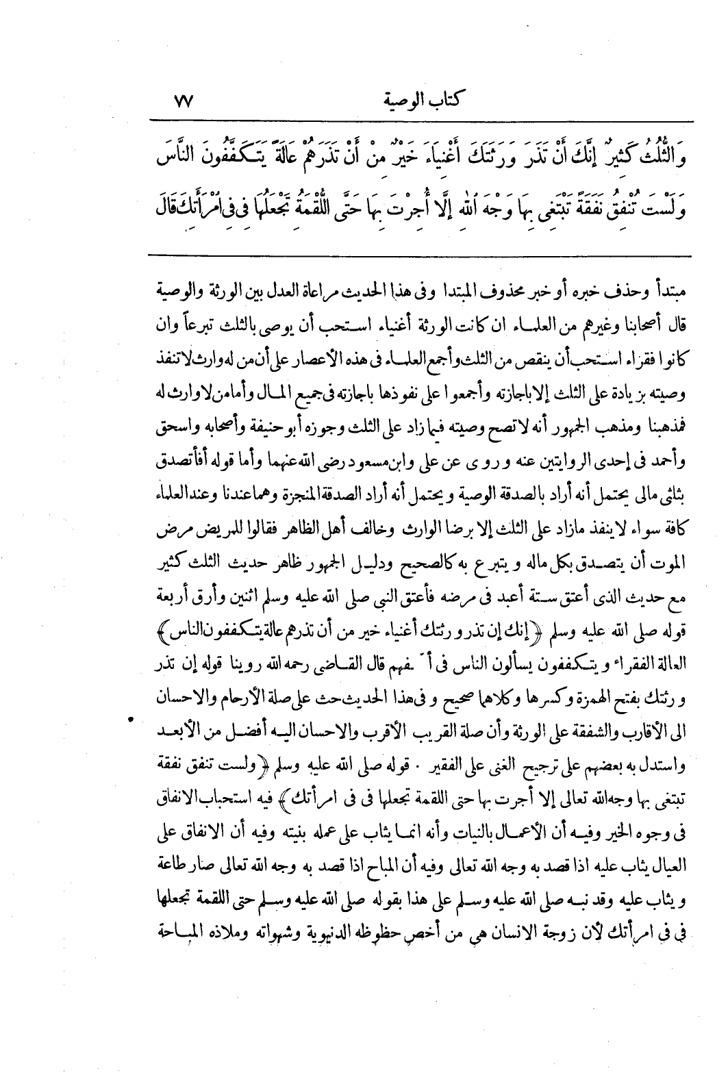 مُبْتَدَأٌ وَحُذِفَ خَبَرُهُ أَوْ خَبَرٌ مَحْذُوفُ الْمُبْتَدَأِ وَفِي هَذَا الْحَدِيثِ مُرَاعَاةُ الْعَدْلِ بَيْنَ الْوَرَثَةِ وَالْوَصِيَّةِ قَالَ أَصْحَابُنَا وَغَيْرُهُمْ مِنَ الْعُلَمَاءِ إِنْ كَانَتِ الْوَرَثَةُ أَغْنِيَاءَ اسْتُحِبَّ أَنْ يُوصِيَ بِالثُّلُثِ تَبَرُّعًا وَإِنْ كَانُوا فُقَرَاءَ اسْتُحِبَّ أَنْ يُنْقِصَ مِنَ الثُّلُثِ وَأَجْمَعَ الْعُلَمَاءُ فِي هَذِهِ الْأَعْصَارِ عَلَى أَنَّ مَنْ لَهُ وَارِثٌ لَا تَنْفُذُ وَصِيَّتُهُ بِزِيَادَةٍ عَلَى الثُّلُثِ إِلَّا بِإِجَازَتِهِ وَأَجْمَعُوا عَلَى نُفُوذِهَا بِإِجَازَتِهِ فِي جَمِيعِ الْمَالِ وَأَمَّا مَنْ لَا وَارِثَ لَهُ فَمَذْهَبُنَا وَمَذْهَبُ الْجُمْهُورِ أَنَّهُ لَا تَصِحُّ وَصِيَّتُهُ فِيمَا زَادَ عَلَى الثُّلُثِ وَجَوَّزَهُ أَبُو حَنِيفَةَ وَأَصْحَابُهُ وَإِسْحَاقُ وَأَحْمَدُ فِي إِحْدَى الرِّوَايَتَيْنِ عَنْهُ وَرُوِيَ عَنْ علي وبن مَسْعُودٍ رَضِيَ اللَّهُ عَنْهُمَا وَأَمَّا قَوْلُهُ أَفَأَتَصَدَّقُ بِثُلُثَيْ مَالِي يَحْتَمِلُ أَنَّهُ أَرَادَ بِالصَّدَقَةِ الْوَصِيَّةَ وَيَحْتَمِلُ أَنَّهُ أَرَادَ الصَّدَقَةَ الْمُنَجَّزَةَ وَهُمَا عِنْدَنَا وَعِنْدَ الْعُلَمَاءِ كَافَّةً سَوَاءٌ لَا يَنْفُذُ مَا زَادَ عَلَى الثُّلُثِ إِلَّا بِرِضَا الْوَارِثِ وَخَالَفَ أَهْلُ الظَّاهِرِ فَقَالُوا لِلْمَرِيضِ مَرَضَ الْمَوْتِ أَنْ يَتَصَدَّقَ بِكُلِّ مَالِهِ وَيَتَبَرَّعُ بِهِ كَالصَّحِيحِ وَدَلِيلُ الْجُمْهُورِ ظَاهِرُ حَدِيثِ الثُّلُثُ كَثِيرٌ مَعَ حَدِيثِ الَّذِي أَعْتَقَ سِتَّةَ أَعْبُدٍ فِي مَرَضِهِ فَأَعْتَقَ النَّبِيُّ صَلَّى اللَّهُ عَلَيْهِ وَسَلَّمَ اثْنَيْنِ وَأَرَقَّ أَرْبَعَةً قَوْلُهُ صَلَّى اللَّهُ عَلَيْهِ وَسَلَّمَ (إِنَّكَ إِنْ تَذَرْ وَرَثَتَكَ أَغْنِيَاءَ خَيْرٌ مِنْ أَنْ تَذَرَهُمْ عَالَةً يَتَكَفَّفُونَ النَّاسَ) الْعَالَةُ الْفُقَرَاءُ وَيَتَكَفَّفُونَ يَسْأَلُونَ النَّاسَ فِي أَكُفِّهِمْ قَالَ الْقَاضِي رَحِمَهُ اللَّهُ رُوِّينَا قَوْلُهُ إِنْ تَذَرْ وَرَثَتَكَ بِفَتْحِ الْهَمْزَةِ وَكَسْرِهَا وَكِلَاهُمَا صَحِيحٌ وَفِي هَذَا الْحَدِيثِ حَثٌّ عَلَى صِلَةِ الْأَرْحَامِ وَالْإِحْسَانِ إِلَى الْأَقَارِبِ وَالشَّفَقَةِ عَلَى الْوَرَثَةِ وَأَنَّ صِلَةَ الْقَرِيبِ الْأَقْرَبِ وَالْإِحْسَانَ إِلَيْهِ أَفْضَلُ مِنَ الْأَبْعَدِ وَاسْتَدَلَّ بِهِ بَعْضُهُمْ عَلَى تَرْجِيحِ الْغَنِيِّ عَلَى الْفَقِيرِ قَوْلُهُ صَلَّى اللَّهُ عَلَيْهِ وَسَلَّمَ (وَلَسْتَ تُنْفِقُ نَفَقَةً تَبْتَغِي بِهَا وَجْهَ اللَّهِ تَعَالَى إِلَّا أُجِرْتَ بِهَا حَتَّى اللُّقْمَةُ تَجْعَلُهَا فِي فِيِ امْرَأَتِكَ) فِيهِ اسْتِحْبَابُ الْإِنْفَاقِ فِي وُجُوهِ الْخَيْرِ وَفِيهِ أَنَّ الْأَعْمَالَ بِالنِّيَّاتِ وَأَنَّهُ إِنَّمَا يُثَابُ عَلَى عَمَلِهِ بِنِيَّتِهِ وَفِيهِ أَنَّ الْإِنْفَاقَ عَلَى الْعِيَالِ يُثَابُ عَلَيْهِ إِذَا قَصَدَ بِهِ وَجْهَ اللَّهِ تَعَالَى وَفِيهِ أَنَّ الْمُبَاحَ إِذَا قُصِدَ بِهِ وَجْهُ اللَّهِ تَعَالَى صَارَ طَاعَةً وَيُثَابُ عَلَيْهِ وَقَدْ نَبَّهَ صَلَّى اللَّهُ عَلَيْهِ وَسَلَّمَ عَلَى هَذَا بِقَوْلِهِ صَلَّى اللَّهُ عَلَيْهِ وَسَلَّمَ حَتَّى اللُّقْمَةُ تَجْعَلُهَا فِي فِيِ امْرَأَتِكَ لِأَنَّ زَوْجَةَ الْإِنْسَانِ هِيَ مِنْ أَخَصِّ حُظُوظِهِ الدُّنْيَوِيَّةِ وَشَهَوَاتِهِ وملاذه المباحة