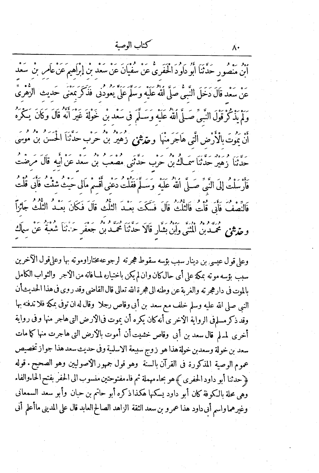 وَعَلَى قَوْلِ عِيسَى بْنِ دِينَارٍ سَبَبُ بُؤْسِهِ سُقُوطُ هِجْرَتِهِ لِرُجُوعِهِ مُخْتَارًا وَمَوْتِهِ بِهَا وَعَلَى قَوْلِ الْآخَرِينَ سَبَبُ بُؤْسِهِ مَوْتُهُ بِمَكَّةَ عَلَى أَيِّ حَالٍ كَانَ وَإِنْ لَمْ يَكُنْ بِاخْتِيَارِهِ لِمَا فَاتَهُ مِنَ الْأَجْرِ وَالثَّوَابِ الْكَامِلِ بِالْمَوْتِ فِي دَارِ هِجْرَتِهِ وَالْغُرْبَةِ عَنْ وَطَنِهِ إِلَى هجرة الله تَعَالَى قَالَ الْقَاضِي وَقَدْ رُوِيَ فِي هَذَا الْحَدِيثِ أَنَّ النَّبِيَّ صَلَّى اللَّهُ عَلَيْهِ وَسَلَّمَ خَلَّفَ مَعَ سَعْدِ بْنِ أَبِي وَقَّاصٍ رَجُلًا وَقَالَ لَهُ إِنْ تُوُفِّيَ بِمَكَّةَ فَلَا تَدْفِنْهُ بِهَا وَقَدْ ذَكَرَ مُسْلِمٌ فِي الرِّوَايَةِ الْأُخْرَى أَنَّهُ كَانَ يَكْرَهُ أَنْ يَمُوتَ فِي الْأَرْضِ الَّتِي هَاجَرَ مِنْهَا وَفِي رِوَايَةٍ أُخْرَى لِمُسْلِمٍ قَالَ سَعْدُ بْنُ أَبِي وَقَّاصٍ خَشِيتُ أَنْ أَمُوتَ بِالْأَرْضِ الَّتِي هَاجَرْتُ مِنْهَا كَمَا مَاتَ سَعْدُ بْنُ خَوْلَةَ وَسَعْدُ بْنُ خَوْلَةَ هَذَا هُوَ زَوْجُ سُبَيْعَةَ الْأَسْلَمِيَّةِ وَفِي حَدِيثِ سَعْدٍ هَذَا جَوَازُ تَخْصِيصِ عُمُومِ الْوَصِيَّةِ الْمَذْكُورَةِ فِي الْقُرْآنِ بِالسُّنَّةِ وَهُوَ قَوْلُ جُمْهُورِ الْأُصُولِيِّينَ وَهُوَ الصَّحِيحُ قَوْلُهُ (حَدَّثَنَا أَبُو دَاوُدَ الْحَفَرِيُّ) هُوَ بِحَاءٍ مُهْمَلَةٍ ثُمَّ فَاءٍ مَفْتُوحَتَيْنِ مَنْسُوبٌ إِلَى الْحَفَرِ بِفَتْحِ الْحَاءِ وَالْفَاءِ وَهِيَ مَحَلَّةٌ بِالْكُوفَةِ كَانَ أَبُو دَاوُدَ يَسْكُنُهَا هَكَذَا ذَكَرَهُ أَبُو حَاتِمِ بْنُ حِبَّانَ وَأَبُو سَعْدٍ السَّمْعَانِيُّ وَغَيْرُهُمَا وَاسْمُ أَبِي دَاوُدَ هَذَا عَمْرُو بْنُ سَعْدٍ الثقة الزاهد الصالح العابد قال علي الْمَدِينِيِّ مَا أَعْلَمُ أَنِّي