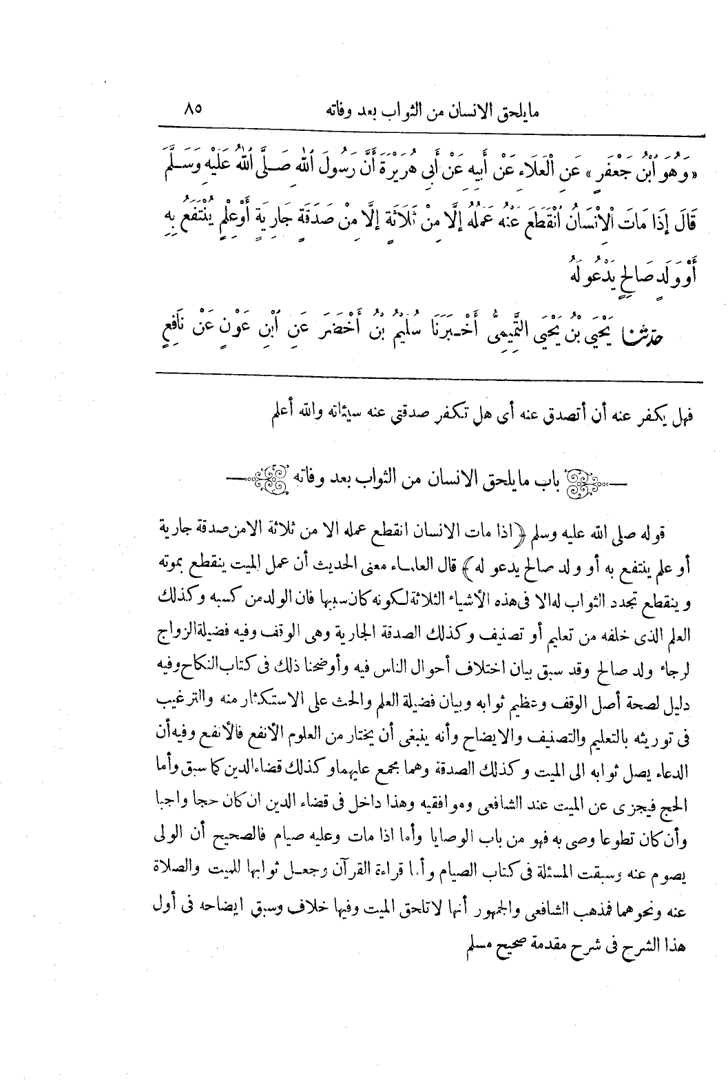 [1631] قَوْلُهُ صَلَّى اللَّهُ عَلَيْهِ وَسَلَّمَ (إِذَا مَاتَ الْإِنْسَانُ انْقَطَعَ عَمَلُهُ إِلَّا مِنْ ثَلَاثَةٍ إِلَّا مِنْ صَدَقَةٍ جَارِيَةٍ أَوْ عِلْمٍ يُنْتَفَعُ بِهِ أَوْ وَلَدٍ صَالِحٍ يَدْعُو لَهُ) قَالَ الْعُلَمَاءُ مَعْنَى الْحَدِيثِ أَنَّ عَمَلَ الْمَيِّتِ يَنْقَطِعُ بِمَوْتِهِ وَيَنْقَطِعُ تَجَدُّدُ الْثوَابِ لَهُ إِلَّا فِي هَذِهِ الْأَشْيَاءِ الثَّلَاثَةِ لِكَوْنِهِ كَانَ سَبَبَهَا فَإِنَّ الْوَلَدَ مِنْ كَسْبِهِ وَكَذَلِكَ الْعِلْمُ الَّذِي خَلَّفَهُ مِنْ تَعْلِيمٍ أَوْ تَصْنِيفٍ وَكَذَلِكَ الصَّدَقَةُ الْجَارِيَةُ وَهِيَ الْوَقْفُ وَفِيهِ فَضِيلَةُ الزَّوَاجِ لِرَجَاءِ وَلَدٍ صَالِحٍ وَقَدْ سَبَقَ بَيَانُ اخْتِلَافِ أَحْوَالِ النَّاسِ فِيهِ وَأَوْضَحْنَا ذَلِكَ فِي كِتَابِ النِّكَاحِ وَفِيهِ دَلِيلٌ لِصِحَّةِ أَصْلِ الْوَقْفِ وَعَظِيمِ ثَوَابِهِ وَبَيَانُ فَضِيلَةِ الْعِلْمِ وَالْحَثُّ عَلَى الِاسْتِكْثَارِ مِنْهُ وَالتَّرْغِيبُ فِي تَوْرِيثِهِ بِالتَّعْلِيمِ وَالتَّصْنِيفِ وَالْإِيضَاحِ وَأَنَّهُ يَنْبَغِي أَنْ يَخْتَارَ مِنَ الْعُلُومِ الْأَنْفَعَ فَالْأَنْفَعَ وَفِيهِ أَنَّ الدُّعَاءَ يَصِلُ ثَوَابُهُ إِلَى الْمَيِّتِ وَكَذَلِكَ الصَّدَقَةُ وَهُمَا مُجْمَعٌ عَلَيْهِمَا وَكَذَلِكَ قَضَاءُ الدَّيْنِ كَمَا سَبَقَ وَأَمَّا الْحَجُّ فَيَجْزِي عَنِ الْمَيِّتِ عِنْدَ الشَّافِعِيِّ وَمُوَافِقِيهِ وَهَذَا دَاخِلٌ فِي قَضَاءِ الدَّيْنِ إِنْ كَانَ حَجًّا وَاجِبًا وَإِنْ كَانَ تَطَوُّعًا وصى به فهو مِنْ بَابِ الْوَصَايَا وَأَمَّا إِذَا مَاتَ وَعَلَيْهِ صِيَامٌ فَالصَّحِيحُ أَنَّ الْوَلِيَّ يَصُومُ عَنْهُ وَسَبَقَتِ الْمَسْأَلَةُ فِي كِتَابِ الصِّيَامِ وَأَمَّا قِرَاءَةُ الْقُرْآنِ وَجَعْلُ ثَوَابِهَا لِلْمَيِّتِ وَالصَّلَاةُ عَنْهُ وَنَحْوُهُمَا فَمَذْهَبُ الشَّافِعِيِّ وَالْجُمْهُورِ أَنَّهَا لَا تَلْحَقُ الْمَيِّتَ وَفِيهَا خِلَافٌ وَسَبَقَ إِيضَاحُهُ فِي أَوَّلِ هَذَا الشَّرْحِ في شرح مقدمة صحيح مسلم)