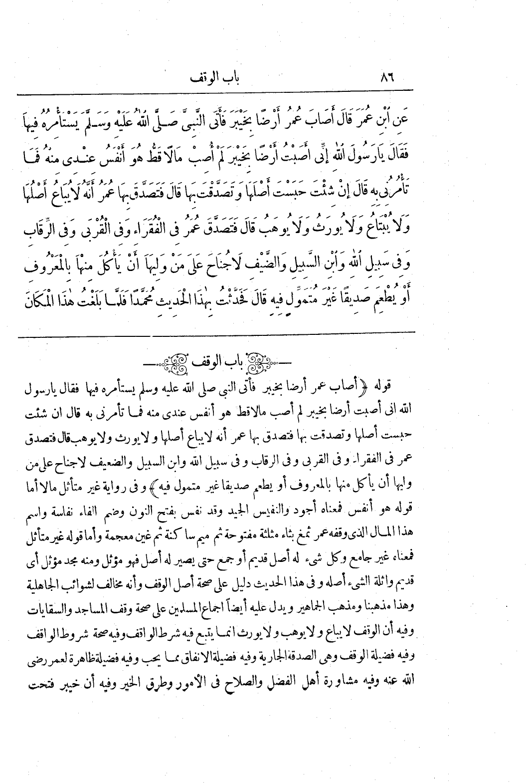 قَوْلُهُ (أَصَابَ عُمَرُ أَرْضًا بِخَيْبَرَ فَأَتَى النَّبِيَّ صَلَّى اللَّهُ عَلَيْهِ وَسَلَّمَ يَسْتَأْمِرُهُ فِيهَا فَقَالَ يَا رَسُولَ اللَّهِ إِنِّي أَصَبْتُ أَرْضًا بِخَيْبَرَ لَمْ أُصِبْ مَالًا قَطُّ هُوَ أَنْفَسُ عِنْدِي مِنْهُ فَمَا تَأْمُرُنِي بِهِ قَالَ إِنْ شِئْتَ حَبَسْتَ أَصْلَهَا وَتَصَدَّقْتَ بِهَا فَتَصَدَّقَ بِهَا عُمَرُ أَنَّهُ لَا يُبَاعُ أَصْلُهَا وَلَا يُورَثُ وَلَا يُوهَبُ قَالَ فَتَصَدَّقَ عُمَرُ فِي الْفُقَرَاءِ وَفِي القربى وفي الرقاب وفي سبيل الله وبن السبيل والضعيف لاجناح عَلَى مَنْ وَلِيَهَا أَنْ يَأْكُلَ مِنْهَا بِالْمَعْرُوفِ أَوْ يُطْعِمَ صَدِيقًا غَيْرَ مُتَمَوِّلٍ فِيهِ) وَفِي رِوَايَةٍ غَيْرَ مُتَأَثِّلٍ مَالًا أَمَّا قَوْلُهُ هُوَ أَنْفَسُ فَمَعْنَاهُ أَجْوَدُ وَالنَّفِيسُ الْجَيِّدُ وَقَدْ نَفُسَ بِفَتْحِ النُّونِ وَضَمِّ الْفَاءِ نَفَاسَةً وَاسْمُ هَذَا الْمَالِ الَّذِي وَقَفَهُ عُمَرُ ثَمْغٌ بِثَاءٍ مُثَلَّثَةٍ مَفْتُوحَةٍ ثُمَّ مِيمٍ سَاكِنَةٍ ثُمَّ غَيْنٍ مُعْجَمَةٍ وَأَمَّا قَوْلُهُ غَيْرَ مُتَأَثِّلٍ فَمَعْنَاهُ غَيْرُ جَامِعٍ وَكُلُّ شَيْءٍ لَهُ أَصْلٌ قَدِيمٌ أَوْ جُمِعَ حَتَّى يَصِيرَ لَهُ أَصْلٌ فَهُوَ مُؤَثَّلٌ وَمِنْهُ مَجْدٌ مُؤَثَّلٌ أَيْ قَدِيمٌ وَأَثْلَةُ الشَّيْءِ أَصْلُهُ وَفِي هَذَا الْحَدِيثِ دَلِيلٌ عَلَى صِحَّةِ أَصْلِ الْوَقْفِ وَأَنَّهُ مُخَالِفٌ لِشَوَائِبِ الْجَاهِلِيَّةِ وَهَذَا مَذْهَبُنَا وَمَذْهَبُ الْجَمَاهِيرِ وَيَدُلُّ عَلَيْهِ أَيْضًا إِجْمَاعُ الْمُسْلِمِينَ عَلَى صِحَّةِ وَقْفِ الْمَسَاجِدِ وَالسِّقَايَاتِ وَفِيهِ أَنَّ الوقف لا يباع ولا يوهب ولا يورث إنما يتبع فيه شرط الواقف وفيه صحة شروط الواقف وَفِيهِ فَضِيلَةُ الْوَقْفِ وَهِيَ الصَّدَقَةُ الْجَارِيَةُ وَفِيهِ فَضِيلَةُ الْإِنْفَاقِ مِمَّا يُحِبُّ وَفِيهِ فَضِيلَةٌ ظَاهِرَةٌ لِعُمَرَ رَضِيَ اللَّهُ عَنْهُ وَفِيهِ مُشَاوَرَةُ أَهْلِ الْفَضْلِ وَالصَّلَاحِ فِي الْأُمُورِ وَطُرُقِ الْخَيْرِ وَفِيهِ أَنَّ خَيْبَرَ فُتِحَتْ)