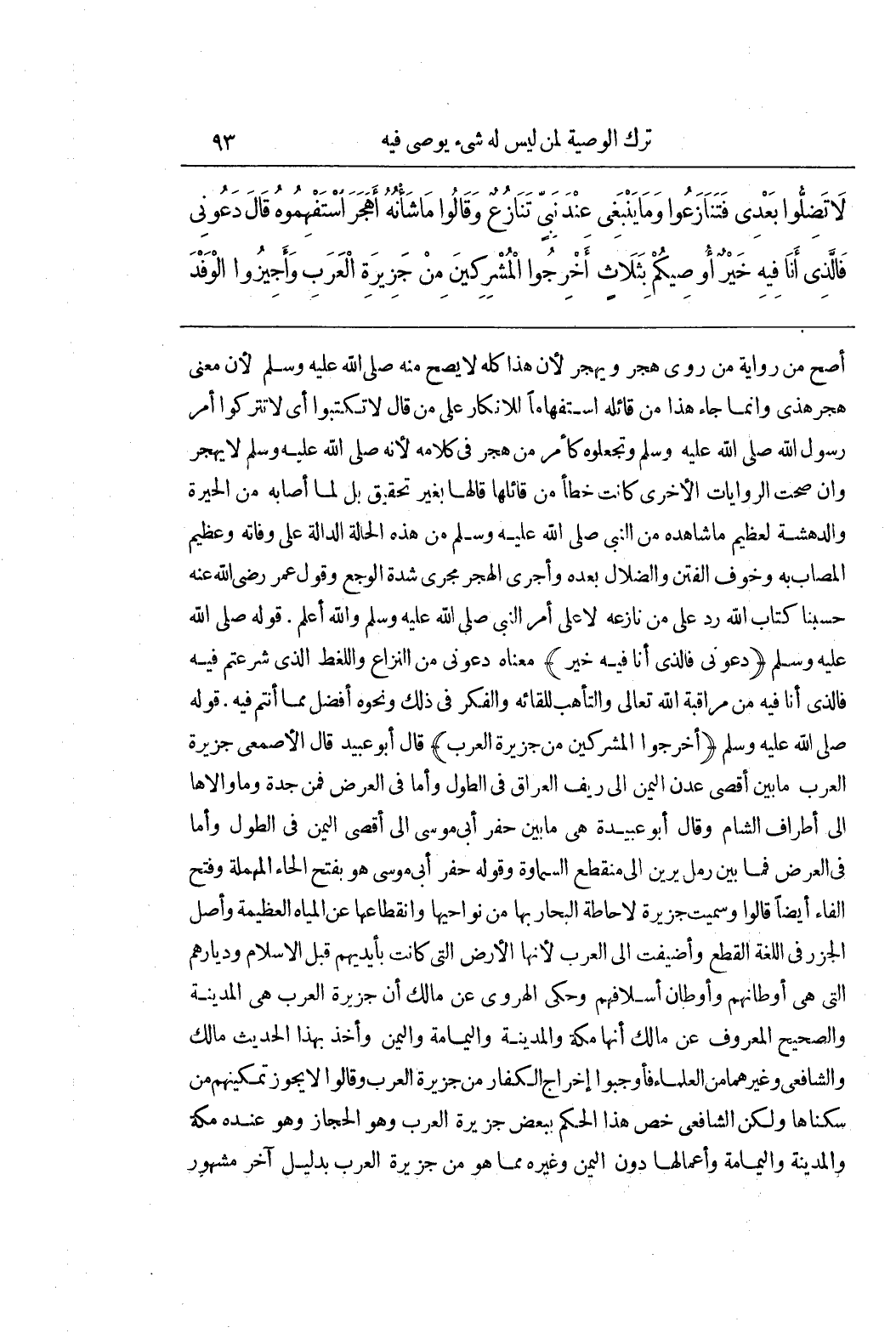 أصح من رواية من روى هَجَرَ وَيَهْجُرُ لِأَنَّ هَذَا كُلَّهُ لَا يَصِحُّ مِنْهُ صَلَّى اللَّهُ عَلَيْهِ وَسَلَّمَ لِأَنَّ مَعْنَى هَجَرَ هَذَى وَإِنَّمَا جَاءَ هَذَا مِنْ قَائِلِهِ اسْتِفْهَامًا لِلْإِنْكَارِ عَلَى مَنْ قَالَ لَا تَكْتُبُوا أَيْ لَا تَتْرُكُوا أَمْرِ رَسُولِ اللَّهِ صَلَّى اللَّهُ عَلَيْهِ وَسَلَّمَ وَتَجْعَلُوهُ كَأَمْرِ مَنْ هَجَرَ فِي كَلَامِهِ لِأَنَّهُ صَلَّى اللَّهُ عَلَيْهِ وَسَلَّمَ لَا يَهْجُرُ وَإِنْ صَحَّتِ الرِّوَايَاتُ الْأُخْرَى كَانَتْ خَطَأً مِنْ قَائِلِهَا قَالَهَا بِغَيْرِ تَحْقِيقٍ بَلْ لِمَا أَصَابَهُ مِنَ الْحَيْرَةِ وَالدَّهْشَةِ لِعَظِيمِ مَا شَاهَدَهُ مِنَ النَّبِيِّ صَلَّى اللَّهُ عَلَيْهِ وَسَلَّمَ مِنْ هَذِهِ الْحَالَةِ الدَّالَّةِ عَلَى وَفَاتِهِ وَعَظِيمِ الْمُصَابِ بِهِ وَخَوْفِ الْفِتَنِ وَالضَّلَالِ بَعْدَهُ وَأَجْرَى الْهُجْرَ مَجْرَى شِدَّةِ الْوَجَعِ وَقَوْلُ عُمَرَ رَضِيَ اللَّهُ عَنْهُ حَسْبُنَا كِتَابُ اللَّهِ رَدٌّ عَلَى مَنْ نَازَعَهُ لَا عَلَى أَمْرِ النَّبِيِّ صَلَّى اللَّهُ عَلَيْهِ وَسَلَّمَ وَاللَّهُ أَعْلَمُ قَوْلُهُ صَلَّى اللَّهُ عَلَيْهِ وَسَلَّمَ (دَعُونِي فَالَّذِي أَنَا فِيهِ خَيْرٌ) مَعْنَاهُ دَعُونِي مِنَ النِّزَاعِ وَاللَّغَطِ الَّذِي شَرَعْتُمْ فِيهِ فَالَّذِي أَنَا فِيهِ مِنْ مُرَاقَبَةِ اللَّهِ تَعَالَى وَالتَّأَهُّبِ لِلِقَائِهِ وَالْفِكْرِ فِي ذَلِكَ وَنَحْوِهِ أَفْضَلُ مِمَّا أَنْتُمْ فِيهِ قَوْلُهُ صَلَّى اللَّهُ عَلَيْهِ وَسَلَّمَ (أَخْرِجُوا الْمُشْرِكِينَ مِنْ جَزِيرَةِ الْعَرَبِ) قَالَ أَبُو عُبَيْدٍ قَالَ الْأَصْمَعِيُّ جَزِيرَةُ الْعَرَبِ مَا بَيْنَ أَقْصَى عَدَنِ الْيَمَنِ إِلَى رِيفِ الْعِرَاقِ فِي الطُّولِ وَأَمَّا فِي الْعَرْضِ فَمِنْ جُدَّةَ وَمَا وَالَاهَا إِلَى أَطْرَافِ الشَّامِ وَقَالَ أَبُو عُبَيْدَةَ هِيَ مَا بَيْنَ حَفَرِ أَبِي مُوسَى إِلَى أَقْصَى الْيَمَنِ فِي الطُّولِ وَأَمَّا فِي الْعَرْضِ فَمَا بَيْنَ رَمْلِ يَرِينَ إِلَى مُنْقَطَعِ السَّمَاوَةِ وَقَوْلُهُ حَفَرُ أَبِي مُوسَى هُوَ بِفَتْحِ الْحَاءِ الْمُهْمَلَةِ وَفَتْحِ الْفَاءِ أَيْضًا قَالُوا وَسُمِّيَتْ جَزِيرَةً لِإِحَاطَةِ الْبِحَارِ بِهَا مِنْ نَوَاحِيهَا وَانْقِطَاعِهَا عَنِ الْمِيَاهِ الْعَظِيمَةِ وَأَصْلُ الْجُزُرِ فِي اللُّغَةِ الْقِطَعُ وَأُضِيفَتْ إِلَى الْعَرَبِ لِأَنَّهَا الْأَرْضُ الَّتِي كَانَتْ بِأَيْدِيهِمْ قَبْلَ الْإِسْلَامِ وَدِيَارُهمُ الَّتِي هِيَ أَوْطَانُهُمْ وَأَوْطَانُ أَسْلَافِهِمْ وَحَكَى الْهَرَوِيُّ عن مالك أن جزيرة العرب هي المجينة وَالصَّحِيحُ الْمَعْرُوفُ عَنْ مَالِكٍ أَنَّهَا مَكَّةُ وَالْمَدِينَةُ واليمامة وَالْيَمَامَةُ وَالْيَمَنُ وَأَخَذَ بِهَذَا الْحَدِيثِ مَالِكٌ وَالشَّافِعِيُّ وَغَيْرُهُمَا مِنَ الْعُلَمَاءِ فَأَوْجَبُوا إِخْرَاجَ الْكُفَّارِ مِنْ جَزِيرَةِ الْعَرَبِ وَقَالُوا لَا يَجُوزُ تَمْكِينُهُمْ مِنْ سُكْنَاهَا وَلَكِنَّ الشَّافِعِيَّ خَصَّ هَذَا الْحُكْمَ بِبَعْضِ جَزِيرَةِ الْعَرَبِ وَهُوَ الْحِجَازُ وَهُوَ عِنْدَهُ مَكَّةُ والمدينة والميامة وَأَعْمَالُهَا دُونَ الْيَمَنِ وَغَيْرِهِ مِمَّا هُوَ مِنْ جَزِيرَةِ الْعَرَبِ بِدَلِيلٍ آخَرَ مَشْهُورٍ