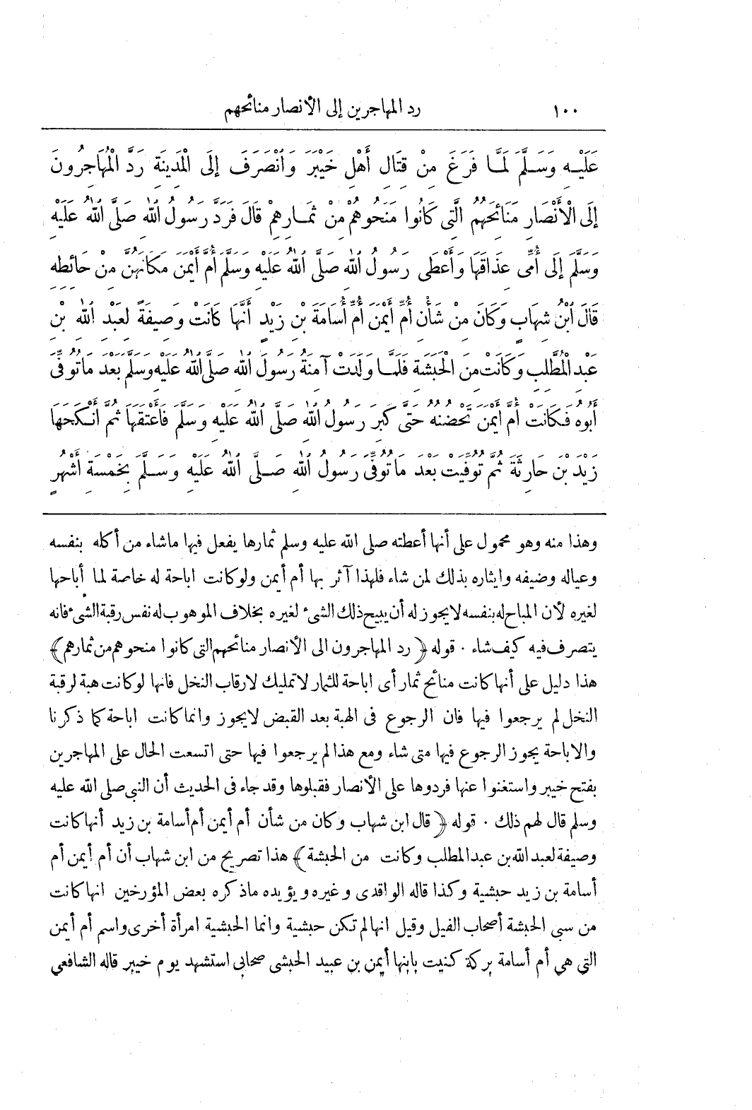 وَهَذَا مِنْهُ وَهُوَ مَحْمُولٌ عَلَى أَنَّهَا أَعْطَتْهُ صَلَّى اللَّهُ عَلَيْهِ وَسَلَّمَ ثِمَارَهَا يَفْعَلُ فِيهَا مَا شَاءَ مِنْ أَكْلِهِ بِنَفْسِهِ وَعِيَالِهِ وَضَيْفِهِ وَإِيثَارِهِ بِذَلِكَ لِمَنْ شَاءَ فَلِهَذَا آثَرَ بِهَا أُمَّ أَيْمَنَ وَلَوْ كَانَتْ إِبَاحَةً لَهُ خَاصَّةً لَمَا أَبَاحَهَا لِغَيْرِهِ لِأَنَّ الْمُبَاحَ لَهُ بِنَفْسِهِ لَا يَجُوزُ لَهُ أَنْ يُبِيحَ ذَلِكَ الشَّيْءَ لِغَيْرِهِ بِخِلَافِ الْمَوْهُوبِ لَهُ نَفْسُ رَقَبَةِ الشَّيْءِ فَإِنَّهُ يَتَصَرَّفُ فِيهِ كَيْفَ شَاءَ قَوْلُهُ (رَدَّ الْمُهَاجِرُونَ إِلَى الْأَنْصَارِ مَنَائِحَهُمُ الَّتِي كَانُوا مَنَحُوهُمْ مِنْ ثِمَارِهِمْ) هَذَا دَلِيلٌ عَلَى أَنَّهَا كَانَتْ منائح ثمار أي إباحة للثمار لا تمليك لا رقاب النَّخْلِ فَإِنَّهَا لَوْ كَانَتْ هِبَةً لِرَقَبَةِ النَّخْلِ لَمْ يَرْجِعُوا فِيهَا فَإِنَّ الرُّجُوعَ فِي الْهِبَةِ بَعْدَ الْقَبْضِ لَا يَجُوزُ وَإِنَّمَا كَانَتْ إِبَاحَةً كَمَا ذَكَرْنَا وَالْإِبَاحَةُ يَجُوزُ الرُّجُوعُ فِيهَا مَتَى شَاءَ وَمَعَ هَذَا لَمْ يَرْجِعُوا فِيهَا حَتَّى اتَّسَعَتِ الْحَالُ عَلَى الْمُهَاجِرِينَ بِفَتْحِ خَيْبَرَ وَاسْتَغْنَوْا عَنْهَا فَرَدُّوهَا عَلَى الْأَنْصَارِ فَقَبِلُوهَا وَقَدْ جَاءَ فِي الْحَدِيثِ أَنَّ النَّبِيَّ صَلَّى اللَّهُ عَلَيْهِ وَسَلَّمَ قال لهم ذلك قوله (قال بن شِهَابٍ وَكَانَ مِنْ شَأْنِ أُمِّ أَيْمَنَ أُمِّ أُسَامَةَ بْنِ زَيْدٍ أَنَّهَا كَانَتْ وَصِيفَةً لِعَبْدِ اللَّهِ بْنِ عَبْدِ الْمُطَّلِبِ وَكَانَتْ مِنَ الْحَبَشَةِ) هذا تصريح من بن شِهَابٍ أَنَّ أُمَّ أَيْمَنَ أُمَّ أُسَامَةَ بْنِ زَيْدٍ حَبَشِيَّةٌ وَكَذَا قَالَهُ الْوَاقِدِيُّ وَغَيْرُهُ وَيُؤَيِّدُهُ مَا ذَكَرَهُ بَعْضُ الْمُؤَرِّخِينَ أَنَّهَا كَانَتْ مِنْ سَبْيِ الْحَبَشَةِ أَصْحَابِ الْفِيلِ وَقِيلَ إِنَّهَا لَمْ تَكُنْ حَبَشِيَّةً وَإِنَّمَا الْحَبَشِيَّةُ امْرَأَةٌ أُخْرَى وَاسْمُ أُمِّ أَيْمَنَ الَّتِي هِيَ أُمُّ أُسَامَةَ بَرَكَةُ كُنِّيَتْ بِابْنِهَا أَيْمَنَ بْنِ عُبَيْدٍ الْحَبَشِيِّ صَحَابِيٌّ اسْتُشْهِدَ يَوْمَ خَيْبَرَ قَالَهُ الشَّافِعِيُّ