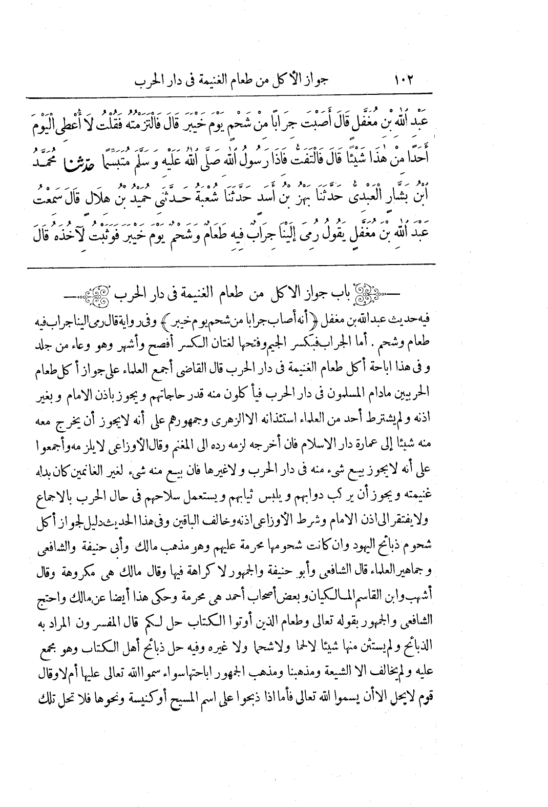 [1772] حَدِيثُ عَبْدِ اللَّهِ بْنِ مُغَفَّلٍ (أَنَّهُ أَصَابَ جِرَابًا مِنْ شَحْمٍ يَوْمَ خَيْبَرَ) وَفِي رِوَايَةٍ قَالَ رُمِيَ إِلَيْنَا جِرَابٌ فِيهِ طَعَامٌ وَشَحْمٌ أَمَّا الْجِرَابُ فَبِكَسْرِ الْجِيمِ وَفَتْحِهَا لُغَتَانِ الْكَسْرُ أَفْصَحُ وَأَشْهَرُ وَهُوَ وِعَاءٌ مِنْ جِلْدٍ وَفِي هَذَا إِبَاحَةُ أَكْلِ طَعَامِ الغنيمة في دار الحرب قال القاضي أجمع العلماء على جواز أكل طعام الحربيين ما دام المسلمون فِي دَارِ الْحَرْبِ فَيَأْكُلُونَ مِنْهُ قَدْرَ حَاجَاتِهِمْ وَيَجُوزُ بِإِذْنِ الْإِمَامِ وَبِغَيْرِ إِذْنِهِ وَلَمْ يَشْتَرِطْ أَحَدٌ مِنَ الْعُلَمَاءِ اسْتِئْذَانَهُ إِلَّا الزُّهْرِيُّ وَجُمْهُورُهُمْ عَلَى أَنَّهُ لَا يَجُوزُ أَنْ يُخْرِجَ مَعَهُ مِنْهُ شَيْئًا إِلَى عِمَارَةِ دَارِ الْإِسْلَامِ فَإِنْ أَخْرَجَهُ لَزِمَهُ رَدُّهُ إِلَى الْمَغْنَمِ وَقَالَ الْأَوْزَاعِيُّ لَا يَلْزَمُهُ وَأَجْمَعُوا عَلَى أَنَّهُ لَا يَجُوزُ بَيْعُ شَيْءٍ مِنْهُ فِي دَارِ الْحَرْبِ وَلَا غَيْرِهَا فَإِنْ بِيعَ مِنْهُ شَيْءٌ لِغَيْرِ الْغَانِمِينَ كَانَ بَدَلُهُ غَنِيمَتَهُ وَيَجُوزُ أَنْ يُرْكَبَ دَوَابُّهُمْ وَيُلْبَسَ ثِيَابُهُمْ وَيُسْتَعْمَلَ سِلَاحُهُمْ فِي حَالِ الْحَرْبِ بِالْإِجْمَاعِ وَلَا يَفْتَقِرُ إِلَى إِذْنِ الْإِمَامِ وَشَرَطَ الْأَوْزَاعِيُّ إِذْنَهُ وَخَالَفَ الْبَاقِينَ وَفِي هَذَا الْحَدِيثِ دَلِيلٌ لِجَوَازِ أَكْلِ شُحُومِ ذَبَائِحِ الْيَهُودِ وَإِنْ كَانَتْ شُحُومُهَا مُحَرَّمَةً عَلَيْهِمْ وَهُوَ مَذْهَبُ مَالِكٍ وَأَبِي حَنِيفَةَ وَالشَّافِعِيِّ وَجَمَاهِيرِ الْعُلَمَاءِ قَالَ الشَّافِعِيُّ وأبو حنيفة والجمهور لا كراهة فيها وقال مالك هي مكروهة وقال أشهب وبن الْقَاسِمِ الْمَالِكِيَّانِ وَبَعْضُ أَصْحَابِ أَحْمَدَ هِيَ مُحَرَّمَةٌ وَحُكِيَ هَذَا أَيْضًا عَنْ مَالِكٍ وَاحْتَجَّ الشَّافِعِيُّ وَالْجُمْهُورُ بِقَوْلِهِ تَعَالَى وَطَعَامُ الَّذِينَ أُوتُوا الْكِتَابَ حل لكم قَالَ الْمُفَسِّرُونَ الْمُرَادُ بِهِ الذَّبَائِحُ وَلَمْ يَسْتَثْنِ مِنْهَا شَيْئًا لَا لَحْمًا وَلَا شَحْمًا وَلَا غَيْرَهُ وَفِيهِ حِلُّ ذَبَائِحِ أَهْلِ الْكِتَابِ وَهُوَ مُجْمَعٌ عَلَيْهِ وَلَمْ يُخَالِفْ إِلَّا الشِّيعَةُ وَمَذْهَبُنَا وَمَذْهَبُ الْجُمْهُورِ إِبَاحَتُهَا سَوَاءٌ سَمَّوْا اللَّهَ تَعَالَى عَلَيْهَا أَمْ لَا وَقَالَ قَوْمٌ لَا يَحِلُّ إِلَّا أَنْ يُسَمُّوا اللَّهَ تَعَالَى فَأَمَّا إِذَا ذَبَحُوا عَلَى اسْمِ الْمَسِيحِ أَوْ كَنِيسَةٍ وَنَحْوِهَا فَلَا تَحِلُّ تِلْكَ)