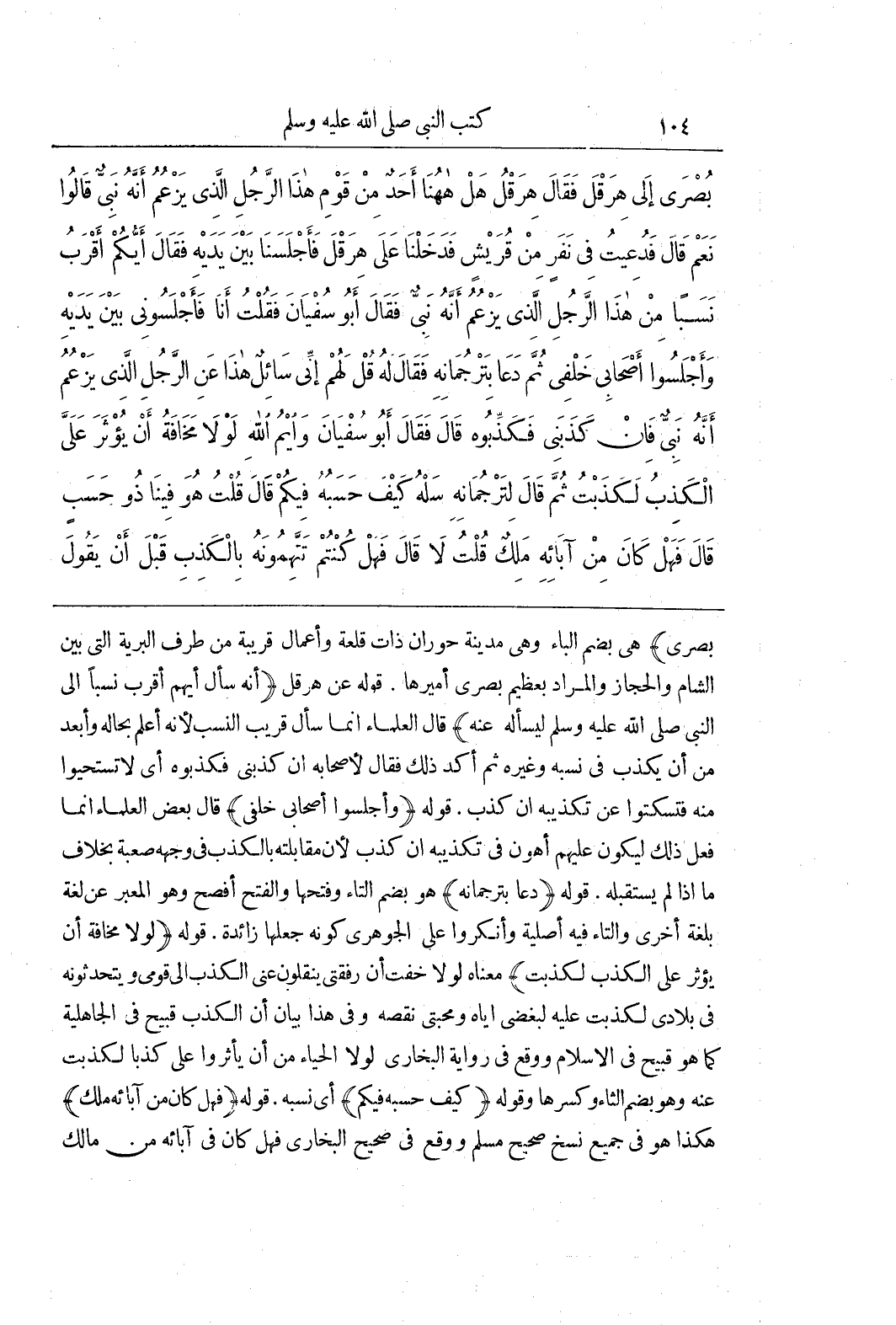 بُصْرَى) هِيَ بِضَمِّ الْبَاءِ وَهِيَ مَدِينَةُ حُورَانَ ذَاتُ قَلْعَةٍ وَأَعْمَالٍ قَرِيبَةٌ مِنْ طَرَفِ الْبَرِّيَّةِ الَّتِي بَيْنَ الشَّامِ وَالْحِجَازِ وَالْمُرَادُ بِعَظِيمِ بُصْرَى أَمِيرُهَا قَوْلُهُ عَنْ هِرَقْلَ (إنَّهُ سَأَلَ أَيُّهُمْ أَقْرَبُ نَسَبًا إِلَى النَّبِيِّ صَلَّى اللَّهُ عَلَيْهِ وَسَلَّمَ لِيَسْأَلَهُ عَنْهُ) قَالَ الْعُلَمَاءُ إِنَّمَا سَأَلَ قَرِيبَ النَّسَبِ لِأَنَّهُ أَعْلَمُ بِحَالِهِ وَأَبْعَدُ مِنْ أَنْ يَكْذِبَ فِي نَسَبِهِ وَغَيْرِهِ ثُمَّ أَكَّدَ ذَلِكَ فَقَالَ لِأَصْحَابِهِ إِنْ كَذَبَنِي فَكَذِّبُوهُ أَيْ لَا تَسْتَحْيُوا مِنْهُ فَتَسْكُتُوا عَنْ تَكْذِيبِهِ إِنْ كَذَبَ قَوْلُهُ (وَأَجْلَسُوا أَصْحَابِي خَلْفِي) قَالَ بَعْضُ الْعُلَمَاءِ إِنَّمَا فَعَلَ ذَلِكَ لِيَكُونَ عَلَيْهِمْ أَهْوَنَ فِي تَكْذِيبِهِ إِنْ كَذَبَ لِأَنَّ مُقَابَلَتَهُ بِالْكَذِبِ فِي وَجْهِهِ صَعْبَةٌ بِخِلَافِ مَا إِذَا لَمْ يَسْتَقْبِلْهُ قَوْلُهُ (دَعَا بِتَرْجُمَانِهِ) هُوَ بِضَمِّ التَّاءِ وَفَتْحِهَا وَالْفَتْحُ أَفْصَحُ وَهُوَ الْمُعَبِّرُ عَنْ لُغَةٍ بِلُغَةٍ أُخْرَى وَالتَّاءُ فِيهِ أَصْلِيَّةٌ وَأَنْكَرُوا عَلَى الْجَوْهَرِيِّ كَوْنَهُ جَعَلَهَا زَائِدَةً قَوْلُهُ (لَوْلَا مَخَافَةُ أَنْ يُؤْثَرَ عَلَيَّ الْكَذِبُ لَكَذَبْتُ) مَعْنَاهُ لَوْلَا خِفْتُ أَنَّ رُفْقَتِي يَنْقُلُونَ عَنِّي الْكَذِبَ إِلَى قَوْمِي وَيَتَحَدَّثُونَهُ فِي بِلَادِي لَكَذَبْتُ عَلَيْهِ لِبُغْضِي إِيَّاهُ وَمَحَبَّتِي نَقْصَهُ وَفِي هَذَا بَيَانُ أَنَّ الْكَذِبَ قَبِيحٌ فِي الْجَاهِلِيَّةِ كَمَا هُوَ قَبِيحٌ فِي الْإِسْلَامِ وَوَقَعَ فِي رِوَايَةِ الْبُخَارِيِّ لَوْلَا الْحَيَاءُ مِنْ أَنْ يَأْثُرُوا عَلَيَّ كَذِبًا لَكَذَبْتُ عَنْهُ وَهُوَ بِضَمِّ الثَّاءِ وَكَسْرِهَا وَقَوْلُهُ (كَيْفَ حَسَبُهُ فِيكُمْ) أَيْ نَسَبُهُ قَوْلُهُ (فَهَلْ كَانَ مِنْ آبَائِهِ مَلِكٌ) هَكَذَا هُوَ فِي جَمِيعِ نُسَخِ صَحِيحِ مُسْلِمٍ وَوَقَعَ فِي صَحِيحِ الْبُخَارِيِّ فَهَلْ كَانَ فِي آبَائِهِ مِنْ مَالِكٍ