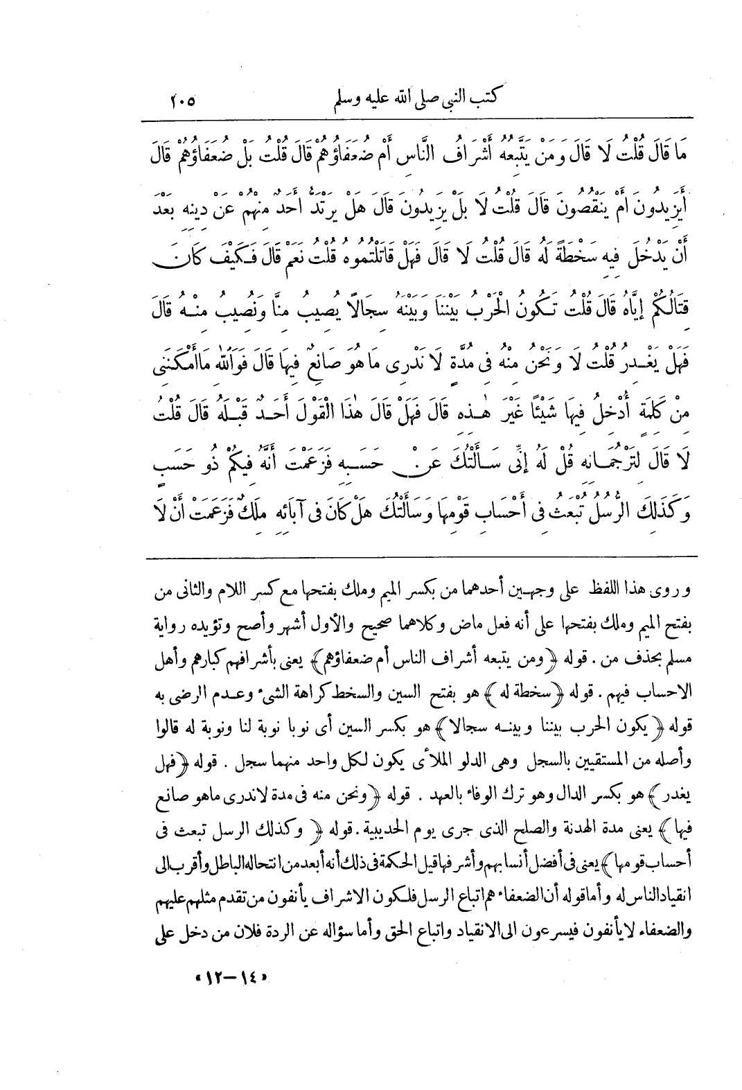 وَرُوِيَ هَذَا اللَّفْظُ عَلَى وَجْهَيْنِ أَحَدُهُمَا مِنْ بكسر الميم وملك بِفَتْحِهَا مَعَ كَسْرِ اللَّامِ وَالثَّانِي مَنْ بِفَتْحِ الميم وملك بِفَتْحِهَا عَلَى أَنَّهُ فِعْلٌ مَاضٍ وَكِلَاهُمَا صَحِيحٌ وَالْأَوَّلُ أَشْهَرُ وَأَصَحُّ وَتُؤَيِّدُهُ رِوَايَةُ مُسْلِمٍ بِحَذْفِ مِنْ قَوْلُهُ (وَمَنْ يَتْبَعُهُ أَشْرَافُ النَّاسِ أَمْ ضُعَفَاؤُهُمْ) يَعْنِي بِأَشْرَافِهِمْ كِبَارَهُمْ وَأَهْلَ الْأَحْسَابِ فِيهِمْ قَوْلُهُ (سَخْطَةً لَهُ) هُوَ بِفَتْحِ السِّينِ وَالسَّخَطُ كراهة الشيء وعدم الرضى بِهِ قَوْلُهُ (يَكُونُ الْحَرْبُ بَيْنَنَا وَبَيْنَهُ سِجَالًا) هُوَ بِكَسْرِ السِّينِ أَيْ نُوَبًا نَوْبَةٌ لَنَا وَنَوْبَةٌ لَهُ قَالُوا وَأَصْلُهُ مِنَ الْمُسْتَقِيِينَ بِالسَّجْلِ وَهِيَ الدَّلْوُ الْمَلْأَى يَكُونُ لِكُلِّ وَاحِدٍ مِنْهُمَا سَجْلٌ قَوْلُهُ (فَهَلْ يَغْدِرُ) هُوَ بِكَسْرِ الدَّالِ وَهُوَ تَرْكُ الْوَفَاءِ بِالْعَهْدِ قَوْلُهُ وَنَحْنُ مِنْهُ فِي مُدَّةٍ لَا نَدْرِي مَا هُوَ صَانِعٌ فِيهَا يَعْنِي مُدَّةَ الْهُدْنَةِ وَالصُّلْحِ الَّذِي جَرَى يَوْمَ الْحُدَيْبِيَةِ قَوْلُهُ (وَكَذَلِكَ الرُّسُلُ تُبْعَثُ فِي أَحْسَابِ قَوْمِهَا) يَعْنِي فِي أَفْضَلِ أَنْسَابِهِمْ وَأَشْرَفِهَا قِيلَ الْحِكْمَةُ فِي ذَلِكَ أَنَّهُ أَبْعَدُ مِنَ انْتِحَالِهِ الْبَاطِلَ وَأَقْرَبُ إِلَى انْقِيَادِ النَّاسِ لَهُ وَأَمَّا قَوْلُهُ إنَّ الضُّعَفَاءَ هُمْ أَتْبَاعُ الرُّسُلِ فَلِكَوْنِ الْأَشْرَافِ يَأْنَفُونَ مِنْ تَقَدُّمِ مِثْلِهِمْ عَلَيْهِمْ وَالضُّعَفَاءُ لَا يَأْنَفُونَ فَيُسْرِعُونَ إِلَى الِانْقِيَادِ وَاتِّبَاعِ الْحَقِّ وَأَمَّا سُؤَالُهُ عَنِ الرِّدَّةِ فَلِأَنَّ مَنْ دخل على