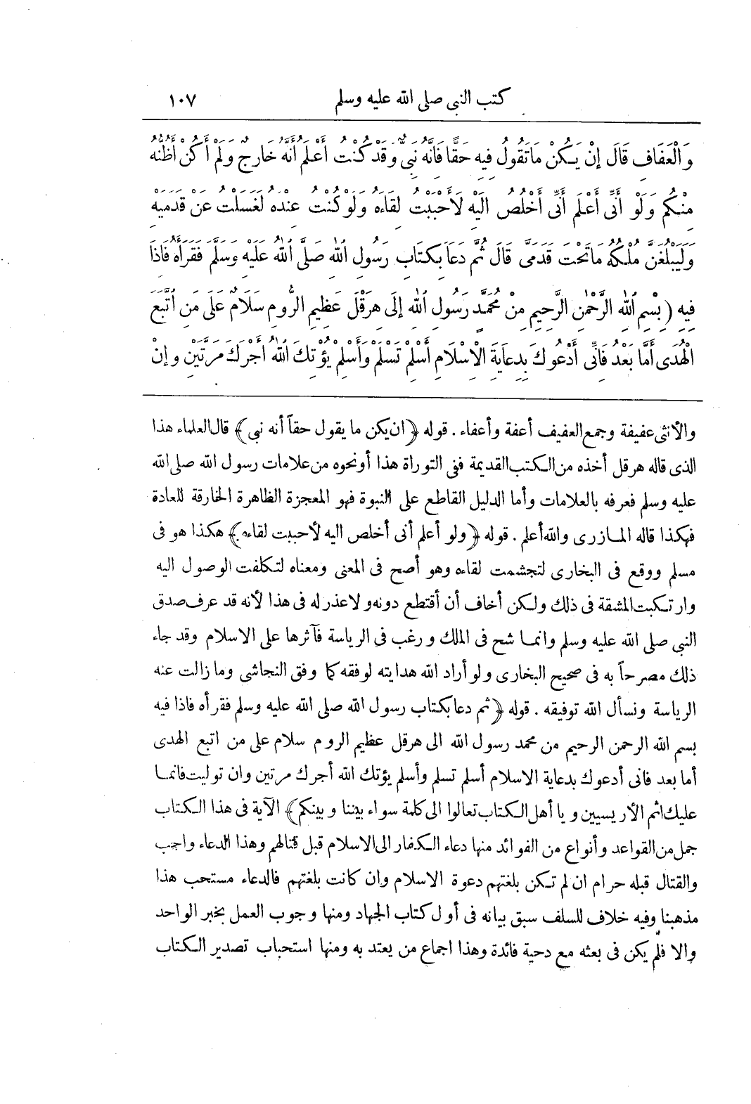 وَالْأُنْثَى عَفِيفَةٌ وَجَمْعُ الْعَفِيفِ أَعِفَّةٌ وَأَعِفَّاءُ قَوْلُهُ (إِنْ يَكُنْ مَا يَقُولُ حَقًّا إِنَّهُ نَبِيٌّ) قَالَ الْعُلَمَاءُ هَذَا الَّذِي قَالَهُ هِرَقْلُ أَخَذَهُ مِنَ الْكُتُبِ الْقَدِيمَةِ فَفِي التَّوْرَاةِ هَذَا أَوْ نَحْوَهُ مِنْ عَلَامَاتِ رَسُولِ اللَّهِ صَلَّى اللَّهُ عَلَيْهِ وَسَلَّمَ فَعَرَفَهُ بِالْعَلَامَاتِ وَأَمَّا الدَّلِيلُ الْقَاطِعُ عَلَى النُّبُوَّةِ فَهُوَ الْمُعْجِزَةُ الظَّاهِرَةُ الْخَارِقَةُ لِلْعَادَةِ فَهَكَذَا قَالَهُ الْمَازِرِيُّ وَاللَّهُ أَعْلَمُ قَوْلُهُ (وَلَوْ أَعْلَمُ أَنِّي أَخْلُصُ إِلَيْهِ لَأَحْبَبْتُ لِقَاءَهُ) هَكَذَا هُوَ فِي مُسْلِمٍ وَوَقَعَ فِي الْبُخَارِيِّ لَتَجَشَّمْتُ لِقَاءَهُ وَهُوَ أَصَحُّ فِي الْمَعْنَى وَمَعْنَاهُ لَتَكَلَّفْتُ الْوُصُولَ إِلَيْهِ وَارْتَكَبْتُ الْمَشَقَّةَ فِي ذَلِكَ وَلَكِنْ أَخَافُ أَنْ أُقْتَطَعَ دُونَهُ وَلَا عُذْرَ لَهُ فِي هَذَا لِأَنَّهُ قَدْ عَرَفَ صِدْقَ النَّبِيِّ صَلَّى اللَّهُ عَلَيْهِ وَسَلَّمَ وَإِنَّمَا شَحَّ فِي الْمُلْكِ وَرَغِبَ فِي الرِّيَاسَةِ فَآثَرَهَا عَلَى الْإِسْلَامِ وَقَدْ جَاءَ ذَلِكَ مُصَرَّحًا بِهِ فِي صَحِيحِ الْبُخَارِيِّ وَلَوْ أَرَادَ اللَّهُ هِدَايَتَهُ لَوَفَّقَهُ كَمَا وَفَّقَ النَّجَاشِيَّ وَمَا زَالَتْ عَنْهُ الرِّيَاسَةُ وَنَسْأَلُ اللَّهَ تَوْفِيقَهُ قَوْلُهُ (ثُمَّ دَعَا بِكِتَابِ رَسُولِ اللَّهِ صَلَّى اللَّهُ عَلَيْهِ وَسَلَّمَ فَقَرَأَهُ فَإِذَا فِيهِ بِسْمِ اللَّهِ الرَّحْمَنِ الرَّحِيمِ مِنْ مُحَمَّدٍ رَسُولِ اللَّهِ إِلَى هِرَقْلَ عَظِيمِ الرُّومِ سَلَامٌ عَلَى مَنِ اتَّبَعَ الْهُدَى أَمَّا بَعْدُ فَإِنِّي أَدْعُوكَ بِدِعَايَةِ الْإِسْلَامِ أَسْلِمْ تَسْلَمْ وَأَسْلِمْ يُؤْتِكَ اللَّهُ أَجْرَكَ مَرَّتَيْنِ وَإِنْ تَوَلَّيْتَ فَإِنَّمَا عَلَيْكَ إثم الأريسيين ويا أَهْلَ الْكِتَابِ تَعَالَوْا إِلَى كَلِمَةٍ سَوَاءٍ بَيْنَنَا وبينكم) الْآيَةَ فِي هَذَا الْكِتَابِ جُمَلٌ مِنَ الْقَوَاعِدِ وَأَنْوَاعٌ مِنَ الْفَوَائِدِ مِنْهَا 1 دُعَاءُ الْكُفَّارِ إِلَى الْإِسْلَامِ قَبْلَ قِتَالِهِمْ وَهَذَا الدُّعَاءُ وَاجِبٌ وَالْقِتَالُ قَبْلَهُ حَرَامٌ إِنْ لَمْ تَكُنْ بَلَغَتْهُمْ دَعْوَةُ الْإِسْلَامِ وَإِنْ كَانَتْ بَلَغَتْهُمْ فَالدُّعَاءُ مُسْتَحَبٌّ هَذَا مَذْهَبُنَا وَفِيهِ خِلَافٌ لِلسَّلَفِ سَبَقَ بَيَانُهُ فِي أَوَّلِ كِتَابِ الْجِهَادِ وَمِنْهَا 2 وُجُوبُ الْعَمَلِ بِخَبَرِ الْوَاحِدِ وَإِلَّا فَلَمْ يَكُنْ فِي بَعْثِهِ مَعَ دِحْيَةَ فَائِدَةٌ وَهَذَا إِجْمَاعُ مَنْ يُعْتَدُّ بِهِ وَمِنْهَا 3 اسْتِحْبَابُ تَصْدِيرِ الْكِتَابِ