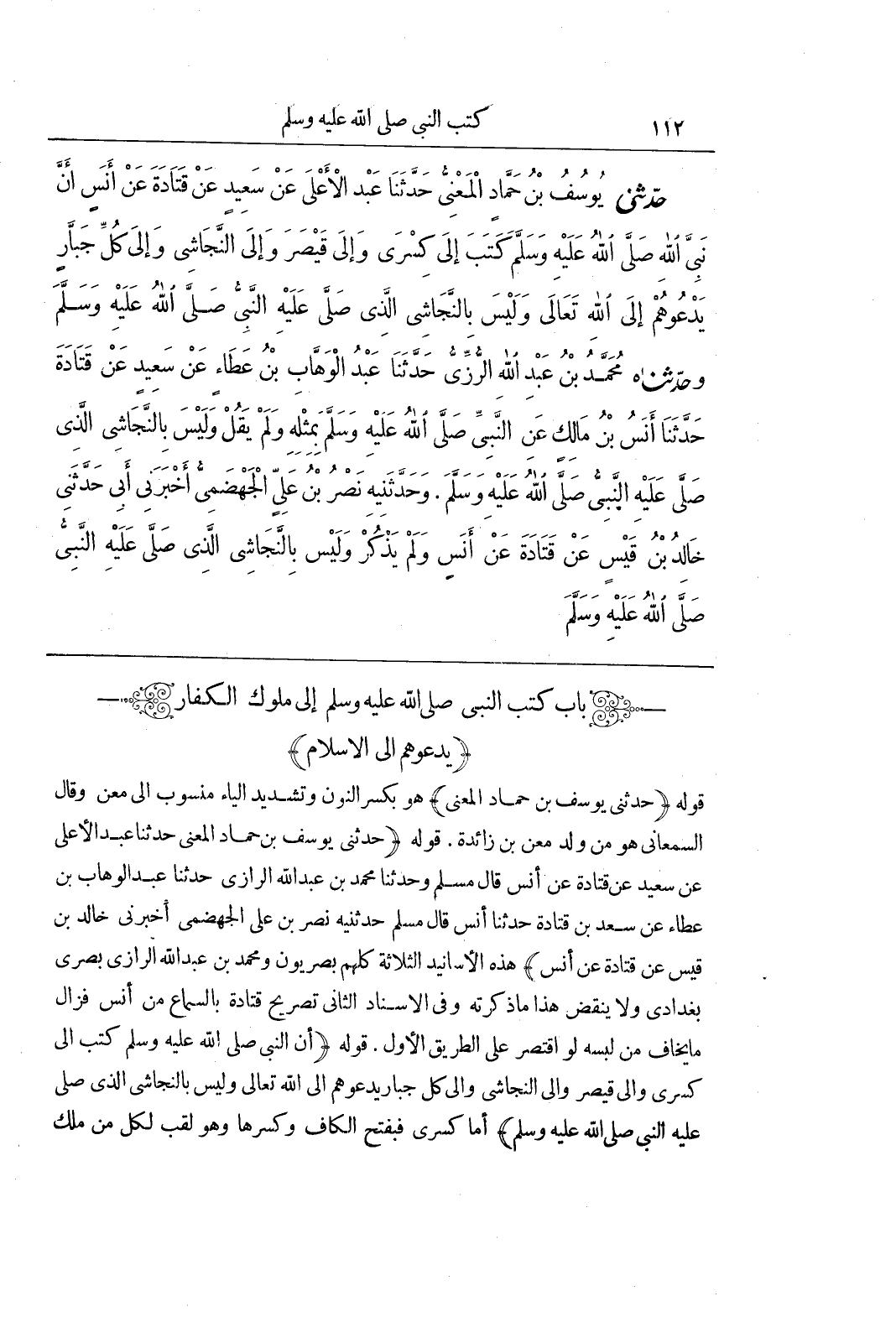 (بَاب كُتُبِ النَّبِيِّ صَلَّى اللَّهُ عَلَيْهِ وَسَلَّمَ إلى ملوك الكفار (يدعوهم إلى الإسلام قَوْلُهُ (حَدَّثَنِي يُوسُفُ بْنُ حَمَّادٍ الْمَعْنِيُّ) هُوَ بِكَسْرِ النُّونِ وَتَشْدِيدِ الْيَاءِ مَنْسُوبٌ إِلَى مَعْنٍ وَقَالَ السَّمْعَانِيُّ هُوَ مِنْ وَلَدِ مَعْنِ بْنِ زَائِدَةَ قَوْلُهُ (حَدَّثَنِي يُوسُفُ بْنُ حَمَّادٍ الْمَعْنِيُّ حَدَّثَنَا عَبْدِ الْأَعْلَى عَنْ سَعِيدٍ عَنْ قَتَادَةَ عَنْ أَنَسٍ قَالَ مُسْلِمٌ وَحَدَّثَنَا مُحَمَّدُ بْنُ عَبْدِ اللَّهِ الرَّازِيُّ حَدَّثَنَا عَبْدُ الْوَهَّابِ بْنُ عَطَاءٍ عَنْ سَعْدِ بْنِ قَتَادَةَ حَدَّثَنَا أَنَسٌ قَالَ مُسْلِمٌ حَدَّثَنِيهِ نَصْرُ بْنُ عَلِيٍّ الْجَهْضَمِيُّ أَخْبَرَنِي خَالِدُ بْنُ قَيْسٍ عَنْ قَتَادَةَ عَنْ أَنَسٍ) هَذِهِ الْأَسَانِيدُ الثَّلَاثَةُ كُلُّهُمْ بَصْرِيُّونَ وَمُحَمَّدُ بْنُ عَبْدِ اللَّهِ الرَّازِيُّ بَصْرِيٌّ بَغْدَادِيٌّ وَلَا يَنْقُضُ هَذَا مَا ذَكَرْتُهُ وَفِي الْإِسْنَادِ الثَّانِي تَصْرِيحُ قَتَادَةَ بِالسَّمَاعِ مِنْ أَنَسٍ فَزَالَ مَا يُخَافُ مِنْ لَبْسِهِ لَوِ اقْتُصِرَ عَلَى الطَّرِيقِ الْأَوَّلِ قَوْلُهُ