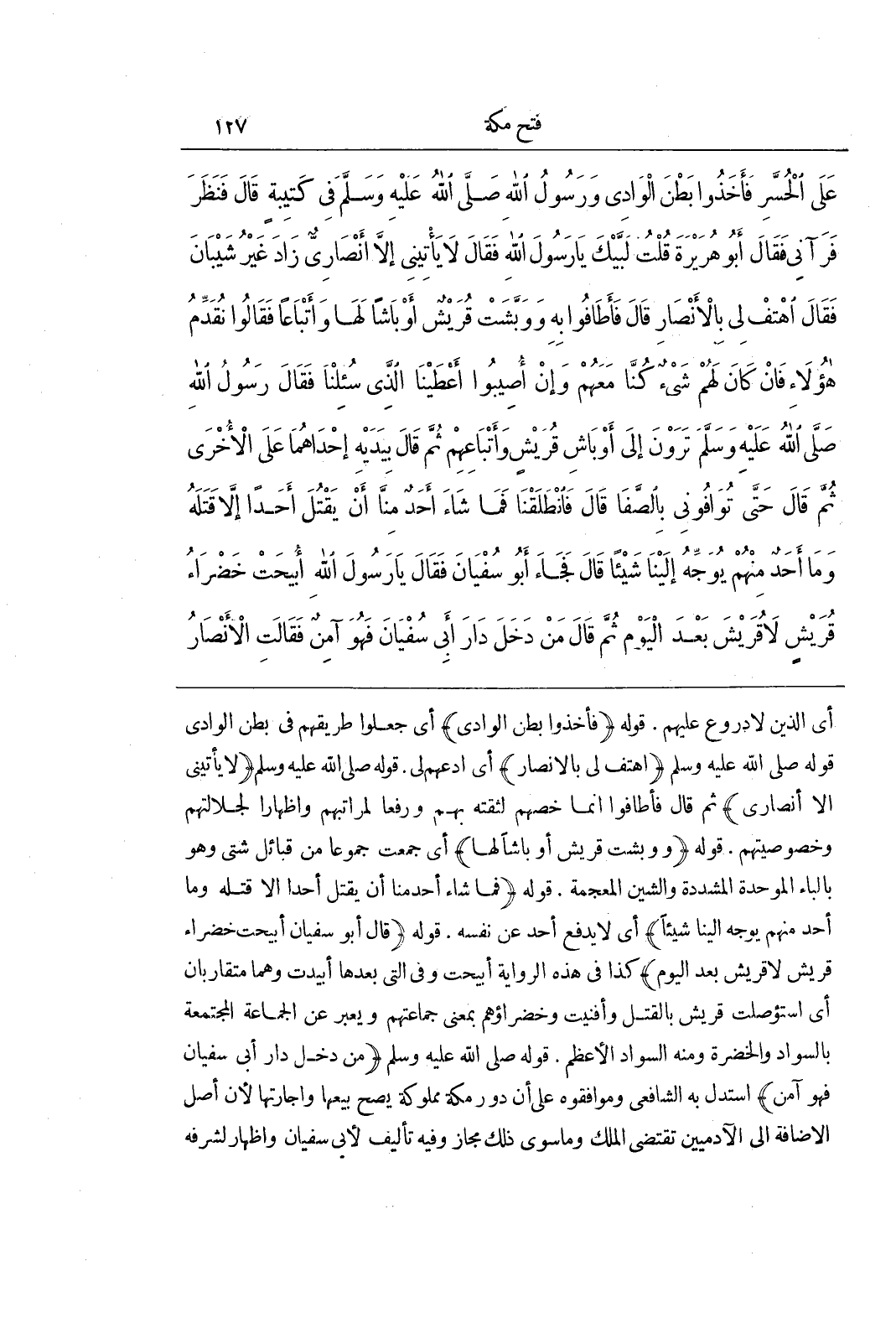 أَيِ الَّذِينَ لَا دُرُوعَ عَلَيْهِمْ قَوْلُهُ (فَأَخَذُوا بَطْنَ الْوَادِي) أَيْ جَعَلُوا طَرِيقَهُمْ فِي بَطْنِ الْوَادِي قَوْلُهُ صَلَّى اللَّهُ عَلَيْهِ وَسَلَّمَ (اهْتِفْ لِي بِالْأَنْصَارِ) أَيِ ادْعُهُمْ لِي قَوْلُهُ صَلَّى اللَّهُ عَلَيْهِ وَسَلَّمَ (لَا يَأْتِينِي إِلَّا أَنْصَارِيٌّ) ثُمَّ قَالَ فَأَطَافُوا إِنَّمَا خَصَّهُمْ لِثِقَتِهِ بِهِمْ وَرَفْعًا لِمَرَاتِبِهِمْ وَإِظْهَارًا لِجَلَالَتِهِمْ وَخُصُوصِيَّتِهِمْ قَوْلُهُ (وَوَبَّشَتْ قريش أو باشا لَهَا) أَيْ جَمَعَتْ جُمُوعًا مِنْ قَبَائِلَ شَتَّى وَهُوَ بِالْبَاءِ الْمُوَحَّدَةِ الْمُشَدَّدَةِ وَالشِّينِ الْمُعْجَمَةِ قَوْلُهُ (فَمَا شَاءَ أَحَدٌ مِنَّا أَنْ يَقْتُلَ أَحَدًا إِلَّا قَتَلَهُ وَمَا أَحَدٌ مِنْهُمْ يُوَجِّهُ إِلَيْنَا شَيْئًا) أَيْ لَا يَدْفَعُ أَحَدٌ عَنْ نَفْسِهِ قَوْلُهُ (قَالَ أَبُو سُفْيَانَ أُبِيحَتْ خَضْرَاءُ قُرَيْشٍ لَا قُرَيْشَ بَعْدَ الْيَوْمِ) كَذَا فِي هَذِهِ الرِّوَايَةِ أُبِيحَتْ وَفِي الَّتِي بَعْدَهَا أُبِيدَتْ وَهُمَا مُتَقَارِبَانِ أَيِ اسْتُؤْصِلَتْ قُرَيْشٌ بِالْقَتْلِ وَأُفْنِيَتْ وَخَضْرَاؤُهُمْ بِمَعْنَى جَمَاعَتِهِمْ وَيُعَبَّرُ عَنِ الْجَمَاعَةِ الْمُجْتَمِعَةِ بِالسَّوَادِ وَالْخُضْرَةِ وَمِنْهُ السَّوَادُ الْأَعْظَمُ قَوْلُهُ صَلَّى اللَّهُ عَلَيْهِ وَسَلَّمَ (مَنْ دَخَلَ دَارَ أَبِي سُفْيَانَ فَهُوَ آمِنٌ) اسْتَدَلَّ بِهِ الشَّافِعِيُّ وَمُوَافِقُوهُ عَلَى أَنَّ دُورَ مَكَّةَ مَمْلُوكَةٌ يَصِحُّ بَيْعُهَا وَإِجَارَتُهَا لِأَنَّ أَصْلَ الْإِضَافَةِ إِلَى الْآدَمِيِّينَ تَقْتَضِي الْمِلْكَ وَمَا سِوَى ذَلِكَ مَجَازٌ وَفِيهِ تَأْلِيفٌ لِأَبِي سُفْيَانَ وَإِظْهَارٌ لِشَرَفِهِ