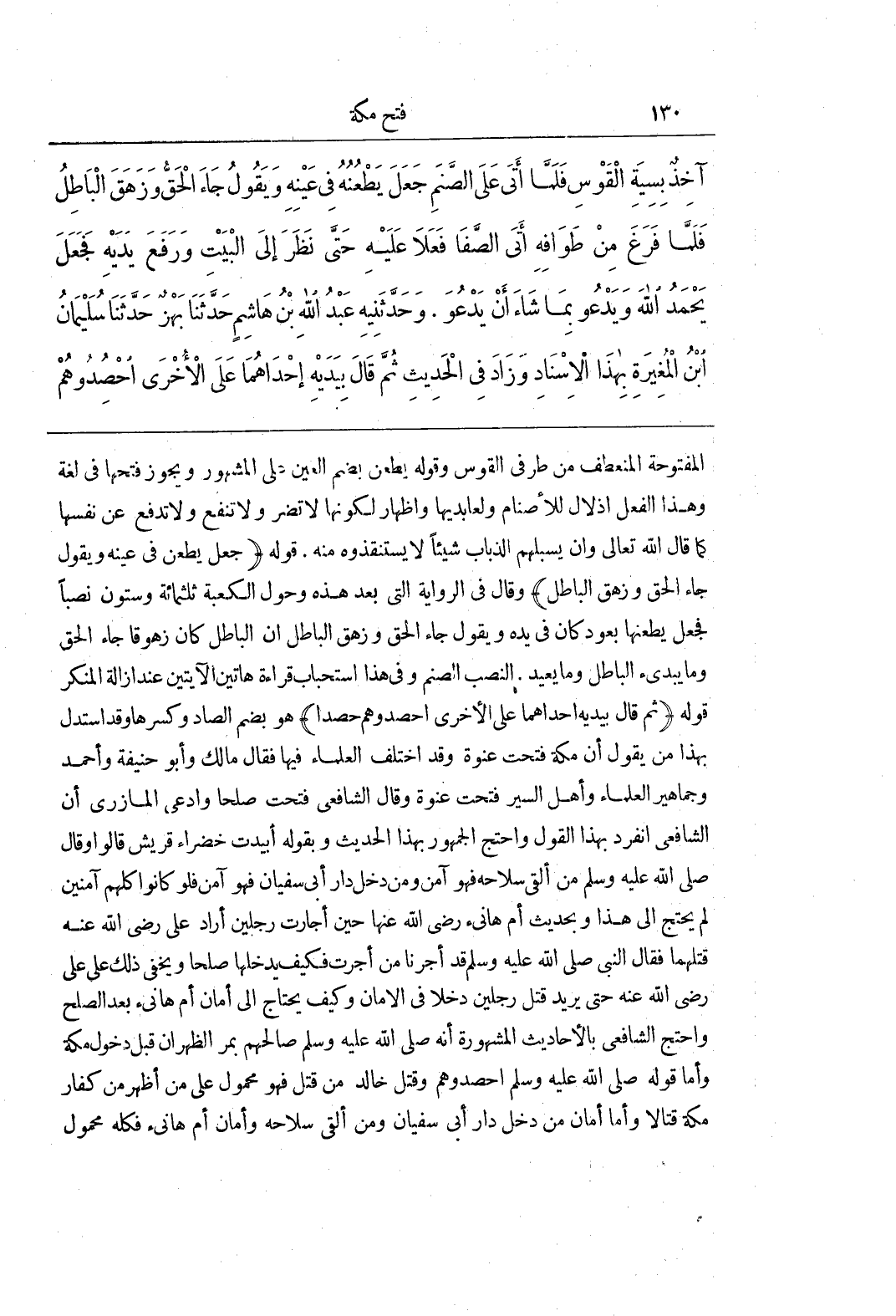 الْمَفْتُوحَةِ الْمُنْعَطِفُ مِنْ طَرَفَيِ الْقَوْسِ وَقَوْلُهُ يَطْعُنُ بِضَمِّ الْعَيْنِ عَلَى الْمَشْهُورِ وَيَجُوزُ فَتْحُهَا فِي لُغَةٍ وَهَذَا الْفِعْلُ إِذْلَالٌ لِلْأَصْنَامِ وَلِعَابِدِيهَا وَإِظْهَارٌ لِكَوْنِهَا لَا تَضُرُّ وَلَا تَنْفَعُ وَلَا تَدْفَعُ عَنْ نَفْسِهَا كَمَا قَالَ اللَّهُ تَعَالَى وَإِنْ يسلبهم الذباب شيئا لا يستنقذوه منه قَوْلُهُ (جَعَلَ يَطْعُنُ فِي عَيْنِهِ وَيَقُولُ جَاءَ الْحَقُّ وَزَهَقَ الْبَاطِلُ) وَقَالَ فِي الرِّوَايَةِ الَّتِي بَعْدَ هَذِهِ وَحَوْلَ الْكَعْبَةِ ثَلَاثُمِائَةٍ وَسِتُّونَ نُصُبًا فَجَعَلَ يَطْعُنُهَا بِعُودٍ كَانَ فِي يَدِهِ وَيَقُولُ جَاءَ الْحَقُّ وَزَهَقَ الْبَاطِلُ إِنَّ الْبَاطِلَ كَانَ زَهُوقًا جَاءَ الْحَقُّ وَمَا يُبْدِئُ الْبَاطِلُ وَمَا يُعِيدُ النُّصُبُ الصَّنَمُ وَفِي هَذَا اسْتِحْبَابُ قِرَاءَةِ هَاتَيْنِ الْآيَتَيْنِ عِنْدَ إِزَالَةِ الْمُنْكَرِ قَوْلُهُ (ثُمَّ قَالَ بِيَدَيْهِ إِحْدَاهُمَا عَلَى الْأُخْرَى احْصُدُوهُمْ حَصْدًا) هُوَ بِضَمِّ الصَّادِ وَكَسْرِهَا وَقَدِ اسْتَدَلَّ بِهَذَا مَنْ يَقُولُ إِنَّ مَكَّةَ فُتِحَتْ عَنْوَةً وَقَدِ اخْتَلَفَ الْعُلَمَاءُ فِيهَا فَقَالَ مَالِكٌ وَأَبُو حَنِيفَةَ وَأَحْمَدُ وَجَمَاهِيرُ الْعُلَمَاءِ وَأَهْلُ السِّيَرِ فُتِحَتْ عَنْوَةً وَقَالَ الشَّافِعِيُّ فُتِحَتْ صُلْحًا وَادَّعَى الْمَازِرِيُّ أَنَّ الشَّافِعِيَّ انْفَرَدَ بِهَذَا الْقَوْلِ وَاحْتَجَّ الْجُمْهُورُ بِهَذَا الْحَدِيثِ وَبِقَوْلِهِ أُبِيدَتْ خَضْرَاءُ قُرَيْشٍ قَالُوا وَقَالَ صَلَّى اللَّهُ عَلَيْهِ وَسَلَّمَ مَنْ أَلْقَى سِلَاحَهُ فَهُوَ آمِنٌ وَمَنْ دَخَلَ دَارَ أَبِي سُفْيَانَ فَهُوَ آمِنٌ فَلَوْ كَانُوا كُلُّهُمْ آمِنِينَ لَمْ يَحْتَجْ إِلَى هَذَا وَبِحَدِيثِ أُمِّ هَانِئٍ رَضِيَ اللَّهُ عَنْهَا حِينَ أَجَارَتْ رَجُلَيْنِ أَرَادَ عَلِيٌّ رَضِيَ اللَّهُ عَنْهُ قَتْلَهُمَا فَقَالَ النَّبِيُّ صَلَّى اللَّهُ عَلَيْهِ وَسَلَّمَ قَدْ أَجَرْنَا مَنْ أَجَرْتِ فَكَيْفَ يَدْخُلُهَا صُلْحًا وَيَخْفَى ذَلِكَ عَلَى عَلِيٍّ رَضِيَ اللَّهُ عَنْهُ حَتَّى يُرِيدَ قَتْلَ رَجُلَيْنِ دَخَلَا فِي الْأَمَانِ وَكَيْفَ يُحْتَاجُ إِلَى أَمَانِ أُمِّ هَانِئٍ بَعْدَ الصُّلْحِ وَاحْتَجَّ الشَّافِعِيُّ بِالْأَحَادِيثِ الْمَشْهُورَةِ أَنَّهُ صَلَّى اللَّهُ عَلَيْهِ وَسَلَّمَ صَالَحَهُمْ بِمَرِّ الظَّهْرَانِ قَبْلَ دُخُولِ مَكَّةَ وَأَمَّا قَوْلُهُ صلى الله عليه وسلم احصدوهم وقتل خَالِدٌ مَنْ قَتَلَ فَهُوَ مَحْمُولٌ عَلَى مَنْ أَظْهَرَ مِنْ كُفَّارِ مَكَّةَ قِتَالًا وَأَمَّا أَمَانُ مَنْ دَخَلَ دَارَ أَبِي سُفْيَانَ وَمَنْ أَلْقَى سِلَاحَهُ وَأَمَانُ أُمِّ هَانِئٍ فَكُلُّهُ مَحْمُولٌ