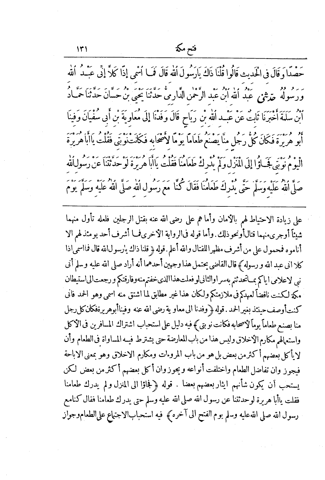 عَلَى زِيَادَةِ الِاحْتِيَاطِ لَهُمْ بِالْأَمَانِ وَأَمَّا هَمُّ عَلِيٍّ رَضِيَ اللَّهُ عَنْهُ بِقَتْلِ الرَّجُلَيْنِ فَلَعَلَّهُ تَأَوَّلَ مِنْهُمَا شَيْئًا أَوْ جَرَى مِنْهُمَا قِتَالٌ أَوْ نَحْوَ ذَلِكَ وَأَمَّا قَوْلُهُ فِي الرِّوَايَةِ الْأُخْرَى فَمَا أَشْرَفَ أَحَدٌ يَوْمئِذٍ لَهُمْ إِلَّا أَنَامُوهُ فَمَحْمُولٌ عَلَى مَنْ أَشْرَفَ مُظْهِرًا لِلْقِتَالِ وَاللَّهُ أَعْلَمُ قَوْلُهُ (قُلْنَا ذَاكَ يَا رَسُولَ الله قال فما اسمي إذا كَلَّا إِنِّي عَبْدُ اللَّهِ وَرَسُولُهُ) قَالَ الْقَاضِي يَحْتَمِلُ هَذَا وَجْهَيْنِ أَحَدُهُمَا أَنَّهُ أَرَادَ صَلَّى اللَّهُ عَلَيْهِ وَسَلَّمَ أَنِّي نَبِيٌّ لِإِعْلَامِي إِيَّاكُمْ بِمَا تَحَدَّثْتُمْ بِهِ سِرًّا وَالثَّانِي لَوْ فَعَلْتُ هَذَا الَّذِي خِفْتُمْ مِنْهُ وَفَارَقْتُكُمْ وَرَجَعْتُ إِلَى اسْتِيطَانِ مَكَّةَ لَكُنْتُ نَاقِضًا لِعَهْدِكُمْ فِي مُلَازَمَتِكُمْ وَلَكَانَ هَذَا غَيْرَ مُطَابِقٍ لِمَا اشْتُقَّ مِنْهُ اسْمِي وَهُوَ الْحَمْدُ فَإِنِّي كُنْتُ أُوصَفُ حِينَئِذٍ بِغَيْرِ الْحَمْدِ قَوْلُهُ (وَفَدْنَا إِلَى مُعَاوِيَةَ رَضِيَ اللَّهُ عَنْهُ وَفِينَا أَبُو هُرَيْرَةَ فَكَانَ كُلُّ رجل منا بصنع طَعَامًا يَوْمًا لِأَصْحَابِهِ فَكَانَتْ نَوْبَتِي) فِيهِ دَلِيلٌ عَلَى اسْتِحْبَابِ اشْتَرَاكِ الْمُسَافِرِينَ فِي الْأَكْلِ وَاسْتِعْمَالِهِمْ مكارم الأخلاق وليس هذا من باب المعارضة حتى يشترط فيه المساواة في الطعام وأن لا يَأْكُلَ بَعْضُهُمْ أَكْثَرَ مِنْ بَعْضٍ بَلْ هُوَ مِنْ بَابِ الْمُرُوءَاتِ وَمَكَارِمِ الْأَخْلَاقِ وَهُوَ بِمَعْنَى الْإِبَاحَةِ فَيَجُوزُ وَإِنْ تَفَاضَلَ الطَّعَامُ وَاخْتَلَفَتْ أَنْوَاعُهُ وَيَجُوزُ وَإِنْ أَكَلَ بَعْضُهُمْ أَكْثَرَ مِنْ بَعْضٍ لَكِنْ يُسْتَحَبُّ أَنْ يَكُونَ شَأْنُهُمْ إِيثَارَ بَعْضِهِمْ بعضا قوله (فجاؤا إِلَى الْمَنْزِلِ وَلَمْ يُدْرِكْ طَعَامُنَا فَقُلْتُ يَا أَبَا هُرَيْرَةَ لَوْ حَدَّثْتَنَا عَنْ رَسُولِ اللَّهِ صَلَّى اللَّهُ عَلَيْهِ وَسَلَّمَ حَتَّى يُدْرِكَ طَعَامُنَا فَقَالَ كُنَّا مَعَ رَسُولِ اللَّهِ صَلَّى اللَّهُ عَلَيْهِ وَسَلَّمَ يَوْمَ الْفَتْحِ إِلَى آخِرِهِ) فِيهِ اسْتِحْبَابُ الِاجْتِمَاعِ عَلَى الطَّعَامِ وَجَوَازُ