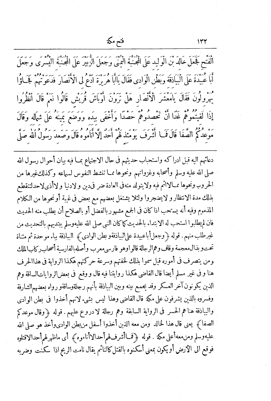 دُعَائِهِمْ إِلَيْهِ قَبْلَ إِدْرَاكِهِ وَاسْتِحْبَابُ حَدِيثِهِمْ فِي حَالِ الِاجْتِمَاعِ بِمَا فِيهِ بَيَانُ أَحْوَالَ رَسُولِ اللَّهِ صَلَّى اللَّهُ عَلَيْهِ وَسَلَّمَ وَأَصْحَابِهِ وَغَزَوَاتِهِمْ وَنَحْوِهَا مِمَّا تَنْشَطُ النُّفُوسُ لِسَمَاعِهِ وَكَذَلِكَ غَيْرُهَا مِنَ الْحُرُوبِ وَنَحْوِهَا مِمَّا لَا إِثْمَ فِيهِ وَلَا يَتَوَلَّدُ مِنْهُ فِي الْعَادَةِ ضُرٌّ فِي دِينٍ وَلَا دُنْيَا وَلَا أَذًى لِأَحَدٍ لِتَنْقَطِعَ بِذَلِكَ مُدَّةُ الِانْتِظَارِ وَلَا يَضْجَرُوا وَلِئَلَّا يَشْتَغِلَ بَعْضُهُمْ مَعَ بَعْضٍ فِي غِيبَةٍ أَوْ نَحْوِهَا مِنَ الْكَلَامِ الْمَذْمُومِ وَفِيهِ أَنَّهُ يُسْتَحَبُّ إِذَا كَانَ فِي الْجَمْعِ مَشْهُورٌ بِالْفَضْلِ أَوْ بِالصَّلَاحِ أَنْ يُطْلَبَ مِنْهُ الْحَدِيثُ فَإِنْ لَمْ يَطْلُبُوا اسْتُحِبَّ لَهُ الِابْتِدَاءُ بِالْحَدِيثِ كَمَا كَانَ النَّبِيُّ صَلَّى اللَّهُ عَلَيْهِ وَسَلَّمَ يَبْتَدِيهِمْ بِالتَّحْدِيثِ مِنْ غَيْرِ طَلَبٍ مِنْهُمْ قَوْلُهُ (وَجَعَلَ أَبَا عُبَيْدَةَ عَلَى الْبَيَاذِقَةِ وَبَطْنِ الْوَادِي) الْبَيَاذِقَةُ بِبَاءٍ مُوَحَّدَةٍ ثُمَّ مُثَنَّاةٍ تَحْتُ وَبِذَالٍ مُعْجَمَةٍ وَقَافٍ وَهُمُ الرَّجَّالَةُ قَالُوا وَهُوَ فَارِسِيٌّ مُعَرَّبٌ وَأَصْلُهُ بِالْفَارِسِيَّةِ أَصْحَابُ رِكَابِ الْمَلِكِ وَمَنْ يَتَصَرَّفُ فِي أُمُورِهِ قِيلَ سُمُّوا بِذَلِكَ لِخِفَّتِهِمْ وَسُرْعَةِ حَرَكَتِهِمْ هَكَذَا الرِّوَايَةُ فِي هَذَا الْحَرْفِ هُنَا وَفِي غَيْرِ مُسْلِمٍ أَيْضًا قَالَ الْقَاضِي هَكَذَا رِوَايَتُنَا فِيهِ قَالَ وَوَقَعَ فِي بَعْضِ الرِّوَايَاتِ السَّاقَةُ وَهُمُ الَّذِينَ يَكُونُونَ آخِرَ الْعَسْكَرِ وَقَدْ يُجْمَعُ بَيْنَهُ وَبَيْنَ الْبَيَاذِقَةِ بِأَنَّهُمْ رَجَّالَةٌ وَسَاقَةٌ وَرَوَاهُ بَعْضُهُمْ الشَّارِفَةُ وَفَسَّرُوهُ بِالَّذِينَ يُشْرِفُونَ عَلَى مَكَّةَ قَالَ الْقَاضِي وَهَذَا لَيْسَ بِشَيْءٍ لِأَنَّهُمْ أَخَذُوا فِي بَطْنِ الْوَادِي وَالْبَيَاذِقَةُ هُنَا هُمُ الْحُسَّرُ فِي الرِّوَايَةِ السَّابِقَةِ وَهُمْ رَجَّالَةٌ لَا دُرُوعَ عَلَيْهِمْ قَوْلُهُ (وَقَالَ مَوْعِدُكُمُ الصَّفَا) يَعْنِي قَالَ هَذَا لِخَالِدٍ وَمَنْ مَعَهُ الَّذِينَ أَخَذُوا أَسْفَلَ مِنْ بَطْنِ الْوَادِي وَأَخَذَ هُوَ صَلَّى اللَّهُ عَلَيْهِ وَسَلَّمَ وَمَنْ مَعَهُ أَعْلَى مَكَّةَ قَوْلُهُ (فَمَا أَشْرَفَ لَهُمْ أَحَدٌ إِلَّا أَنَامُوهُ) أَيْ مَا ظَهَرَ لَهُمْ أَحَدٌ إِلَّا قَتَلُوهُ فَوَقَعَ إِلَى الْأَرْضِ أَوْ يَكُونُ بِمَعْنَى أَسْكَنُوهُ بِالْقَتْلِ كَالنَّائِمِ يُقَالُ نَامَتِ الرِّيحُ إِذَا سَكَنَتْ وَضَرَبَهُ