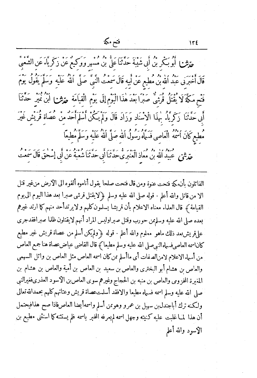 [1782] قَوْلُهُ صَلَّى اللَّهُ عَلَيْهِ وَسَلَّمَ (لَا يُقْتَلُ قُرَشِيٌّ صَبْرًا بَعْدَ هَذَا الْيَوْمِ إِلَى يَوْمِ الْقِيَامَةِ) قَالَ الْعُلَمَاءُ مَعْنَاهُ الْإِعْلَامُ بِأَنَّ قُرَيْشًا يُسْلِمُونَ كُلُّهُمْ وَلَا يَرْتَدُّ أَحَدٌ مِنْهُمْ كَمَا ارْتَدَّ غَيْرُهُمْ بَعْدَهُ صَلَّى اللَّهُ عَلَيْهِ وَسَلَّمَ مِمَّنْ حُورِبَ وَقُتِلَ صَبْرًا وَلَيْسَ الْمُرَادُ أَنَّهُمْ لَا يُقْتَلُونَ ظُلْمًا صَبْرًا فَقَدْ جَرَى عَلَى قُرَيْشٍ بَعْدَ ذَلِكَ مَا هُوَ مَعْلُومٌ وَاللَّهُ أَعْلَمُ قَوْلُهُ (وَلَمْ يَكُنْ أَسْلَمَ مِنْ عُصَاةِ قُرَيْشٍ غَيْرُ مُطِيعٍ كَانَ اسْمُهُ الْعَاصِي فَسَمَّاهُ النَّبِيُّ صَلَّى اللَّهُ عَلَيْهِ وَسَلَّمَ مُطِيعًا) قَالَ الْقَاضِي عِيَاضٌ عُصَاةُ هُنَا جَمْعُ الْعَاصِ مِنْ أَسْمَاءِ الْأَعْلَامِ لَا مِنَ الصِّفَاتِ أَيْ مَا أَسْلَمَ مِمَّنْ كَانَ اسْمُهُ الْعَاصِ مِثْلُ الْعَاصِ بْنِ وَائِلٍ السَّهْمِيِّ وَالْعَاصِ بْنِ هِشَامٍ أَبُو الْبُخْتُرِيِّ وَالْعَاصِ بْنِ سَعِيدِ بْنِ الْعَاصِ بْنِ أُمَيَّةَ وَالْعَاصِ بْنِ هِشَامِ بْنِ الْمُغِيرَةِ الْمَخْزُومِيِّ وَالْعَاصِ بْنِ مُنَبِّهِ بْنِ الْحَجَّاجِ وَغَيْرِهِمْ سِوَى الْعَاصِ بْنِ الْأَسْوَدِ الْعُذْرِيِّ فَغَيَّرَ النَّبِيُّ صَلَّى اللَّهُ عَلَيْهِ وَسَلَّمَ اسْمَهُ فَسَمَّاهُ مُطِيعًا وَإِلَّا فَقَدْ أَسْلَمَتْ عُصَاةُ قُرَيْشٍ وَعُتَاتُهُمْ كُلُّهُمْ بحمد الله تعالى ولكنه تَرَكَ أَبَا جَنْدَلِ بْنَ سُهَيْلِ بْنِ عَمْرٍو وَهُوَ مِمَّنْ أَسْلَمَ وَاسْمُهُ أَيْضًا الْعَاصِ فَإِذَا صَحَّ هَذَا فَيَحْتَمِلُ أَنَّ هَذَا لِمَا غَلَبَتْ عَلَيْهِ كُنْيَتُهُ وَجُهِلَ اسْمُهُ لَمْ يُعَرِّفْهُ الْمُخْبِرُ بِاسْمِهِ فَلَمْ يَسْتَثْنِهِ كَمَا اسْتَثْنَى مُطِيعَ بْنَ الْأَسْوَدِ وَاللَّهُ أَعْلَمُ